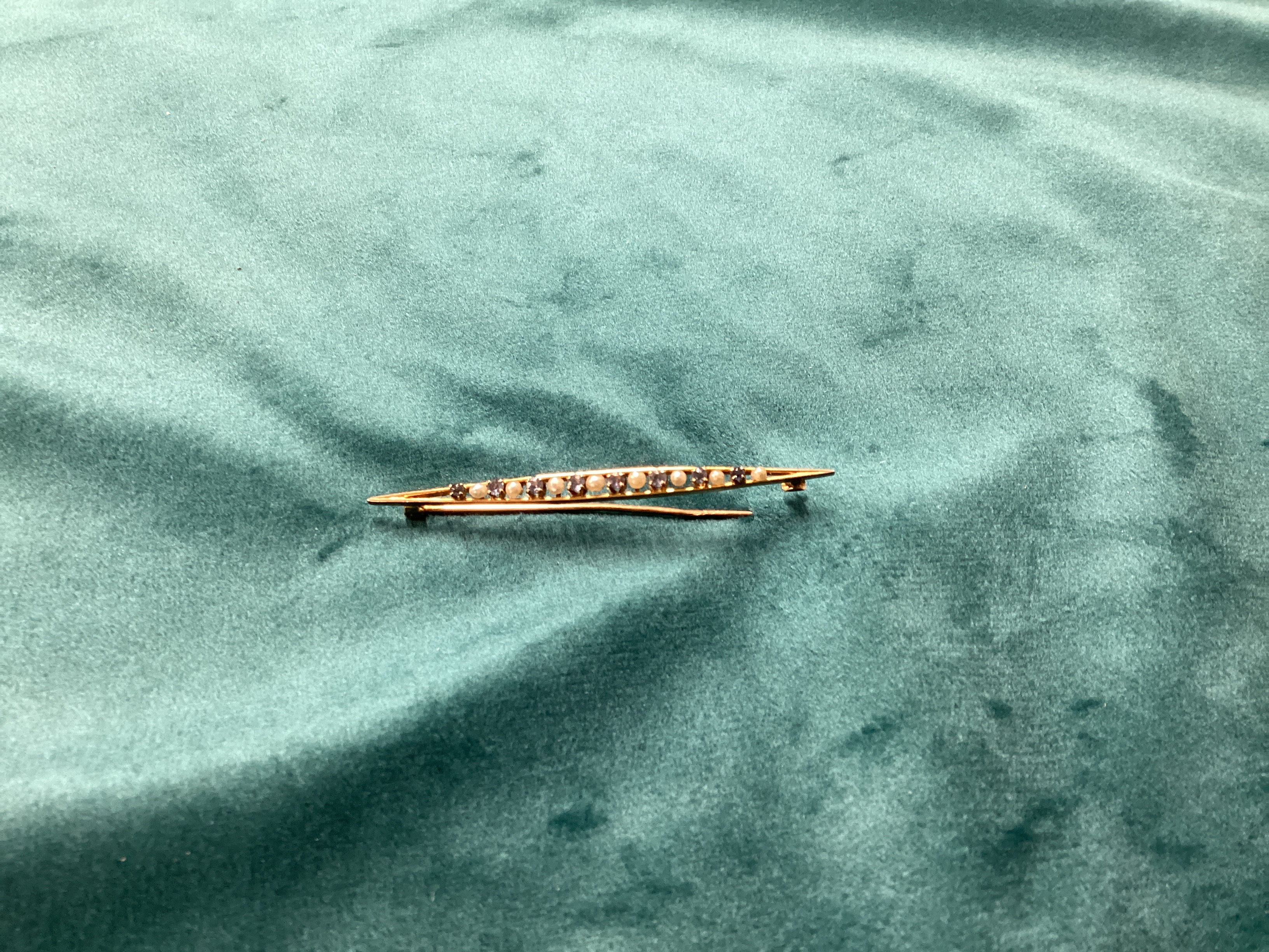 9ct gold seed pearl and aquamarine brooch (2.80g)