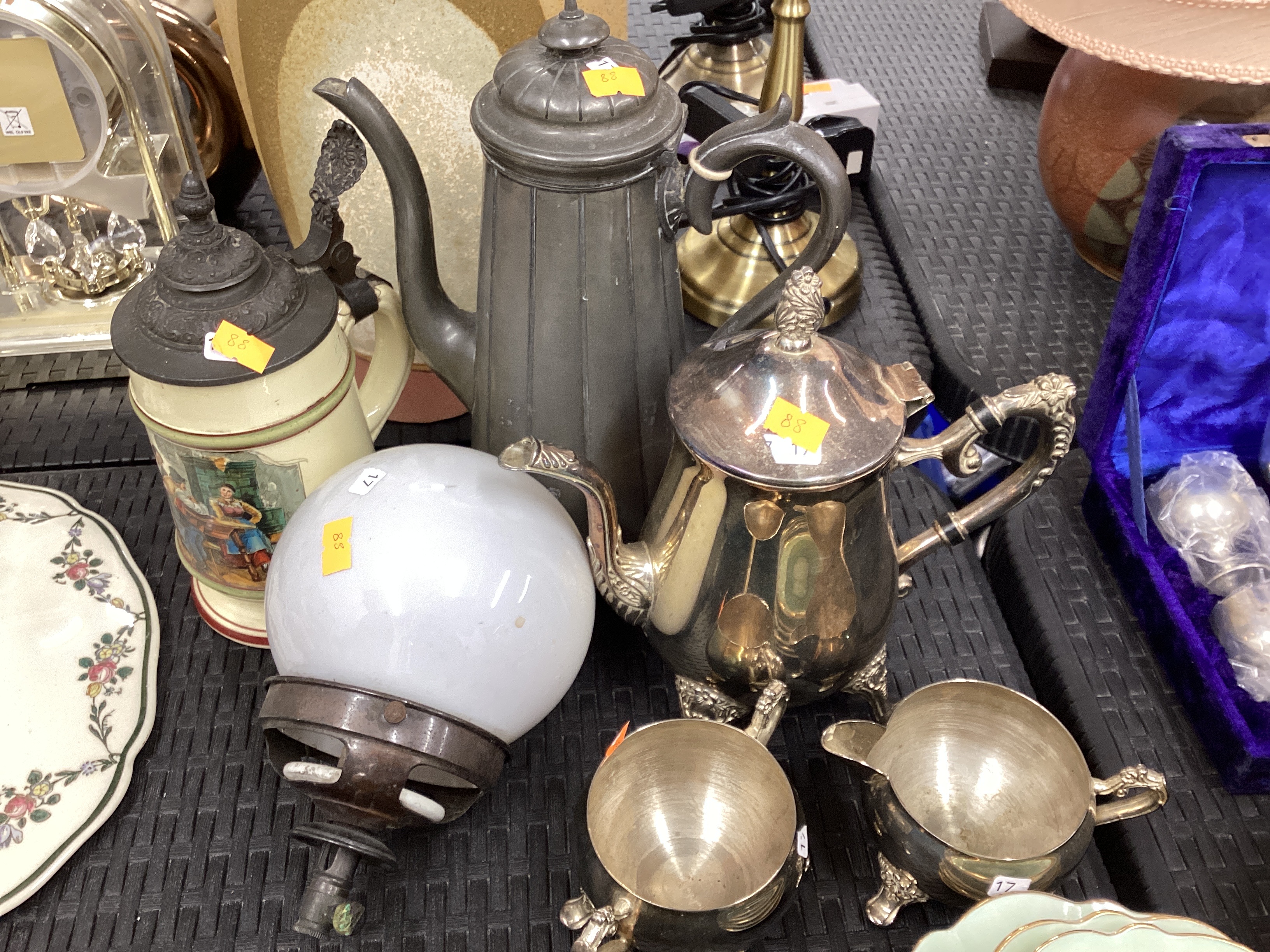 2. Metal coffee pots, jug and dish, glass light fitting, lidded tankard