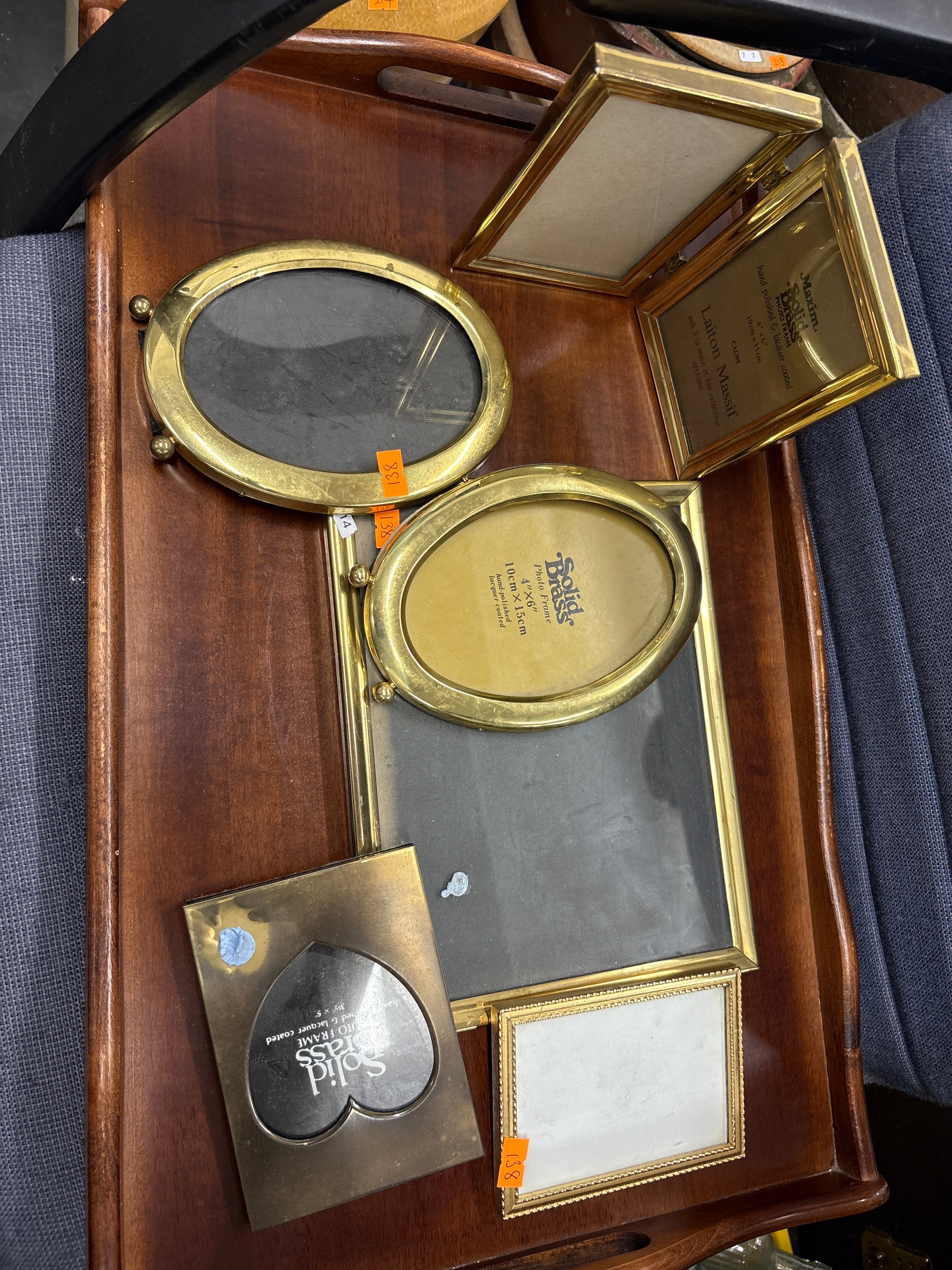 A Collection of Vintage Solid Brass Photo Frames on a Wooden Tray