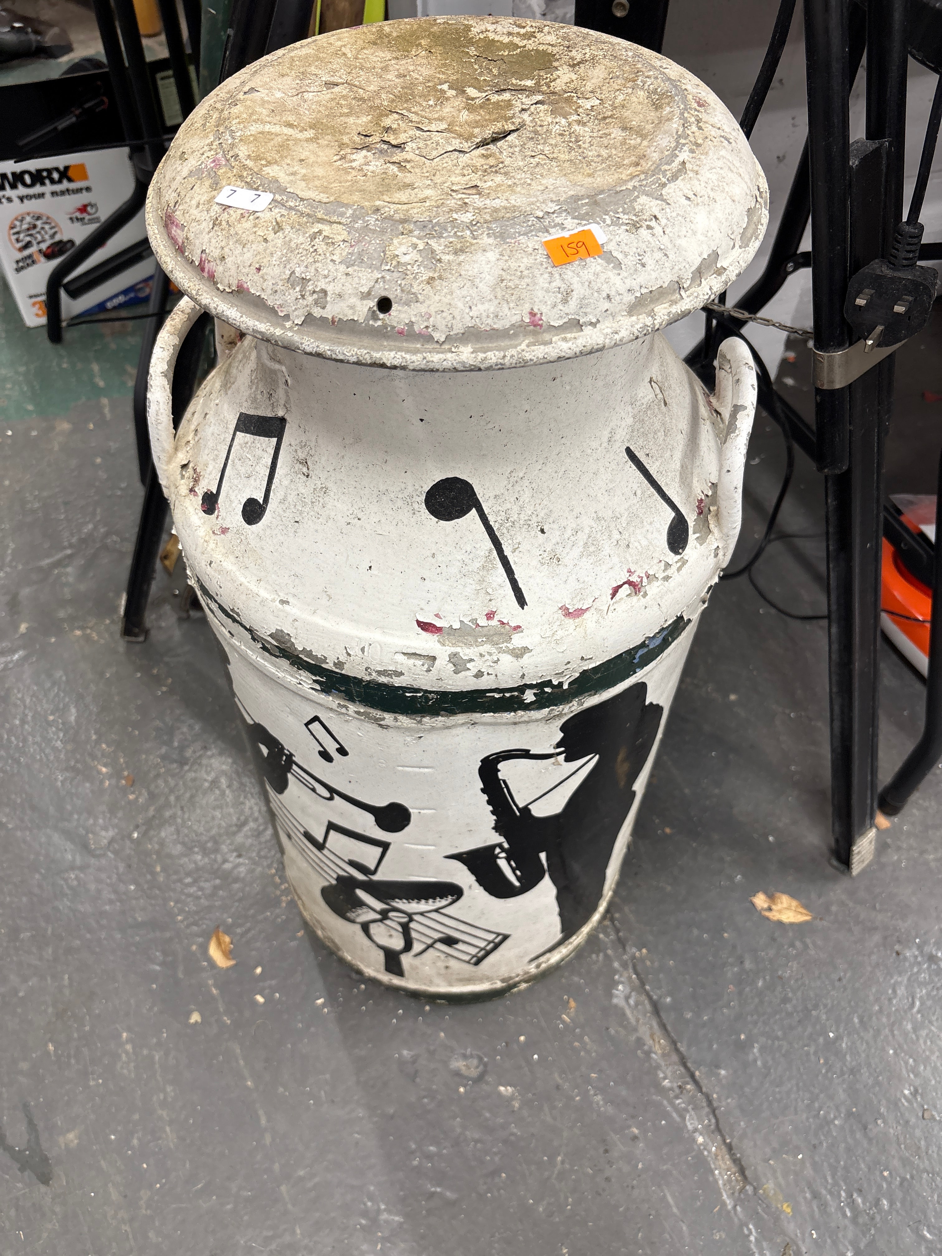 A Vintage Metal Milk Can, Decorated with Musical Motifs