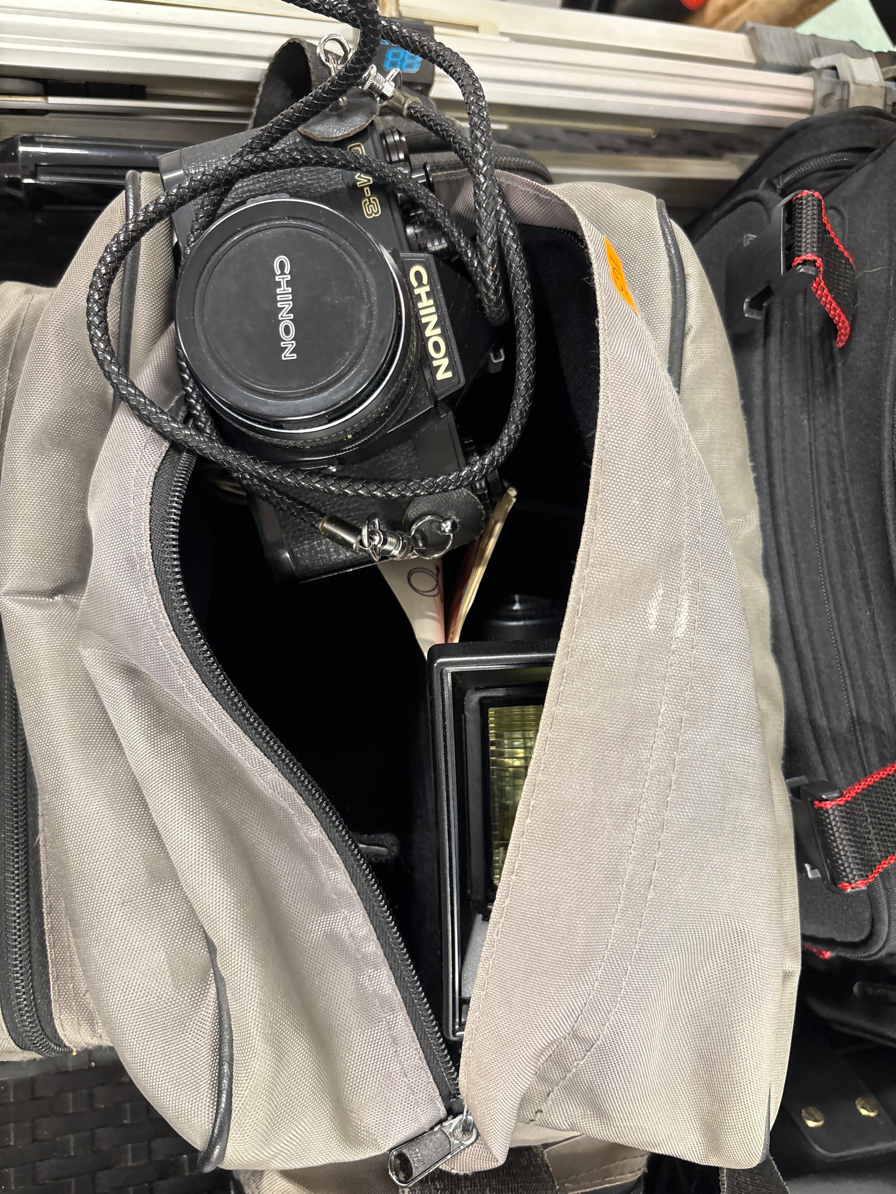 A Chinon CA-3 35mm SLR Camera with Flash and Bag