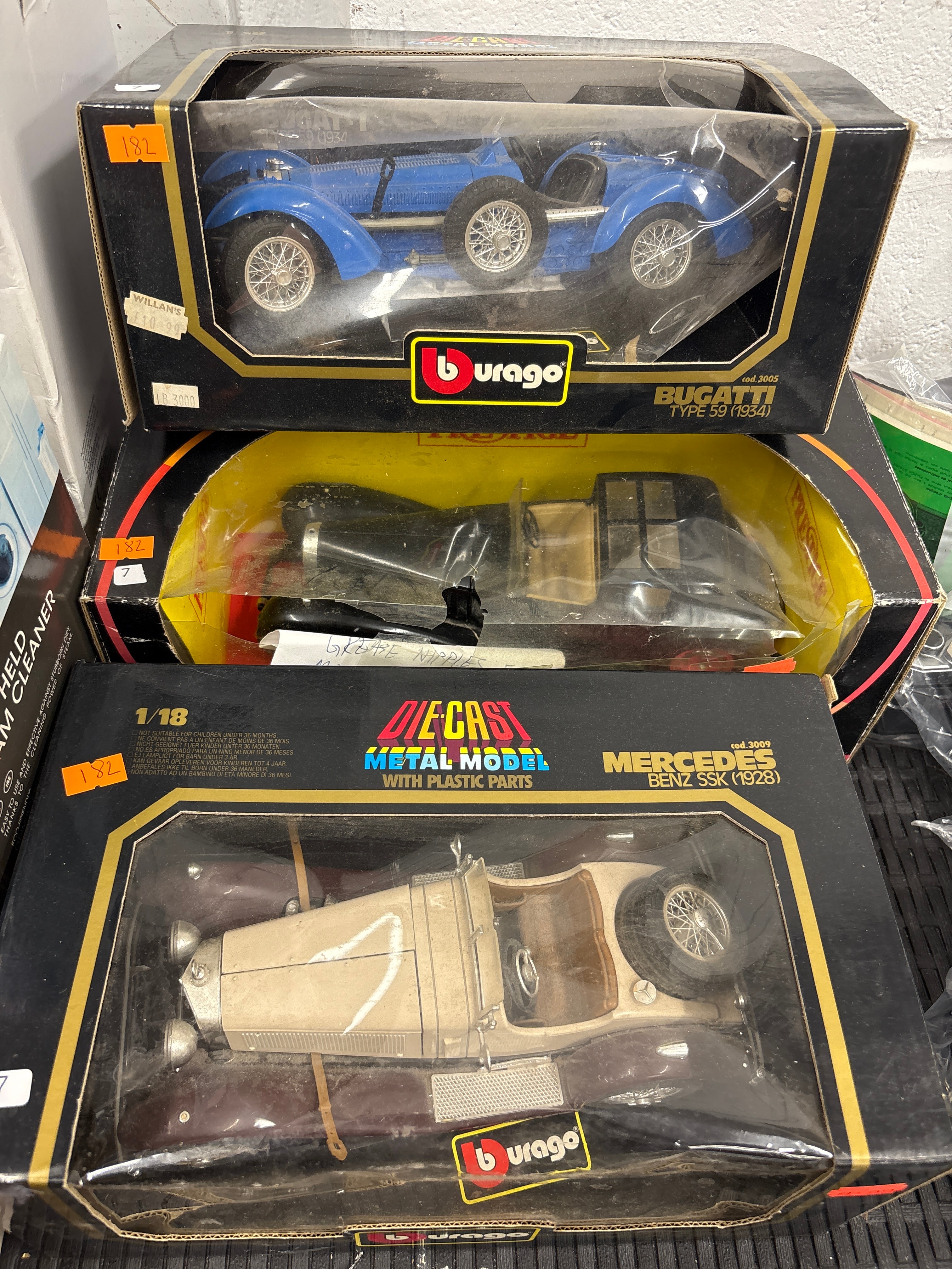 Three Burago Die-Cast Model Cars, including a Mercedes-Benz SSK (1928) and a Bugatti Type 59 (1934)