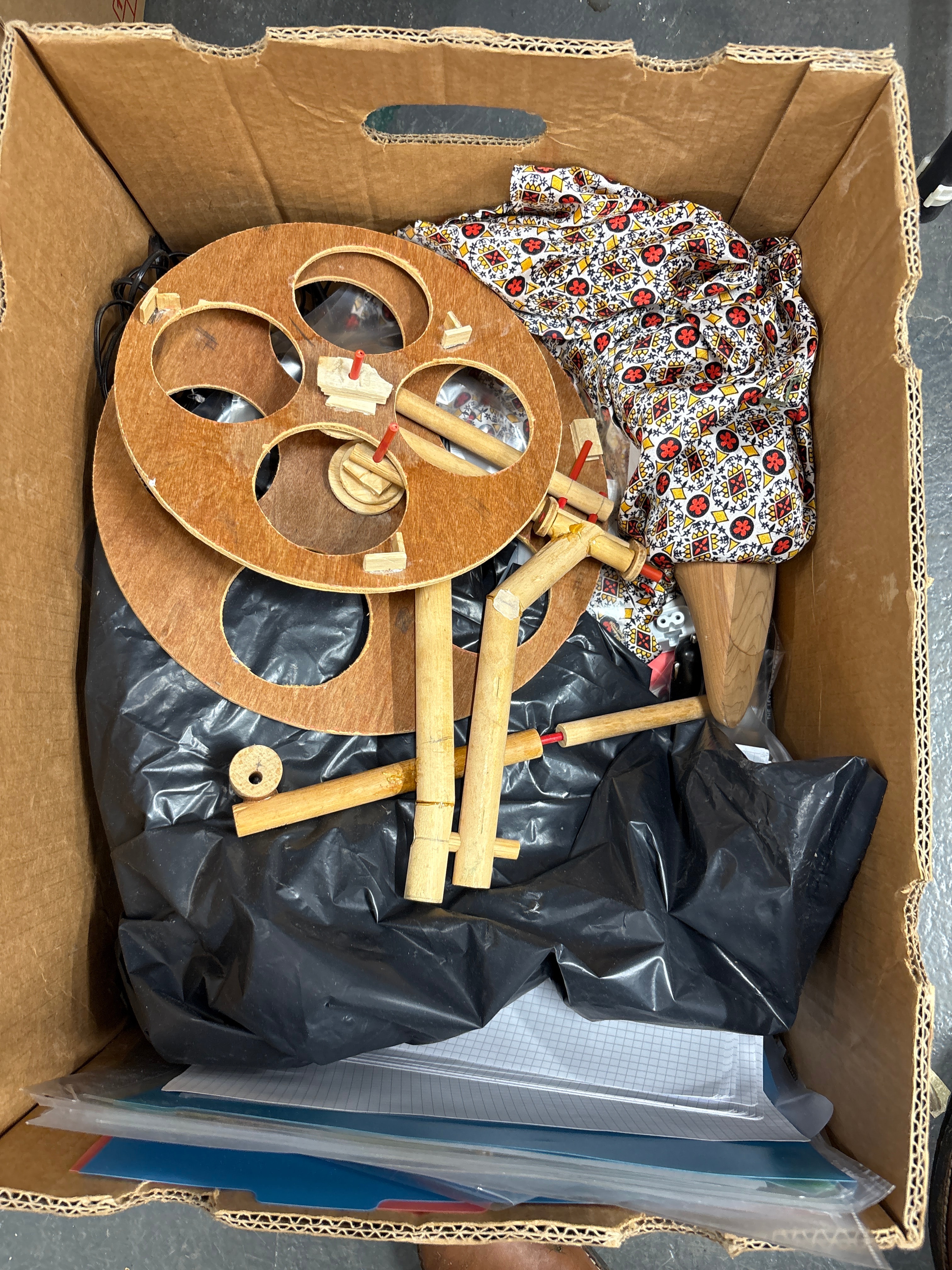 A Group of Disassembled Wooden and Fabric Puppet Components