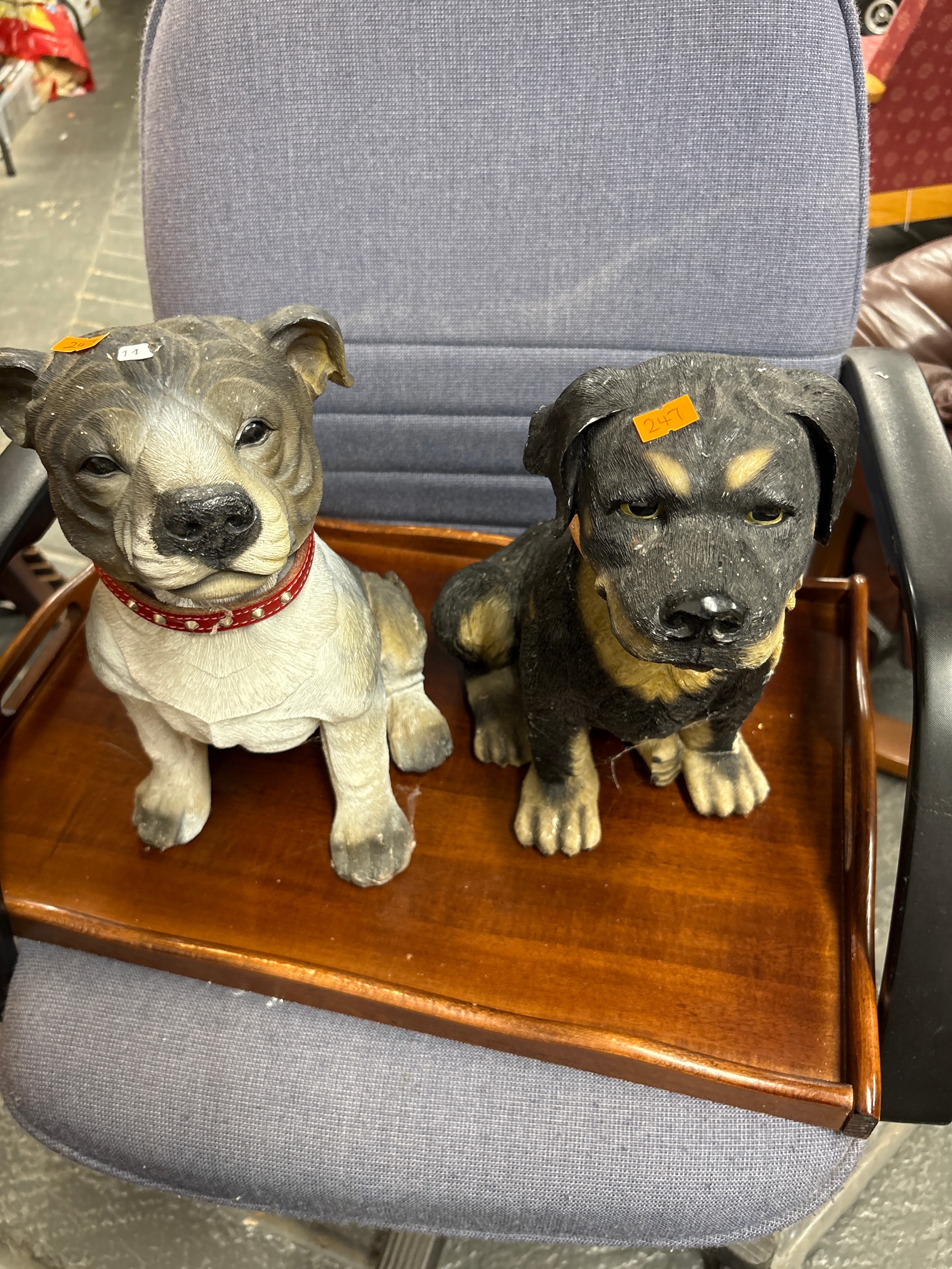 A Pair of Contemporary Resin Dog Figurines, depicting a Pit Bull and a Rottweiler