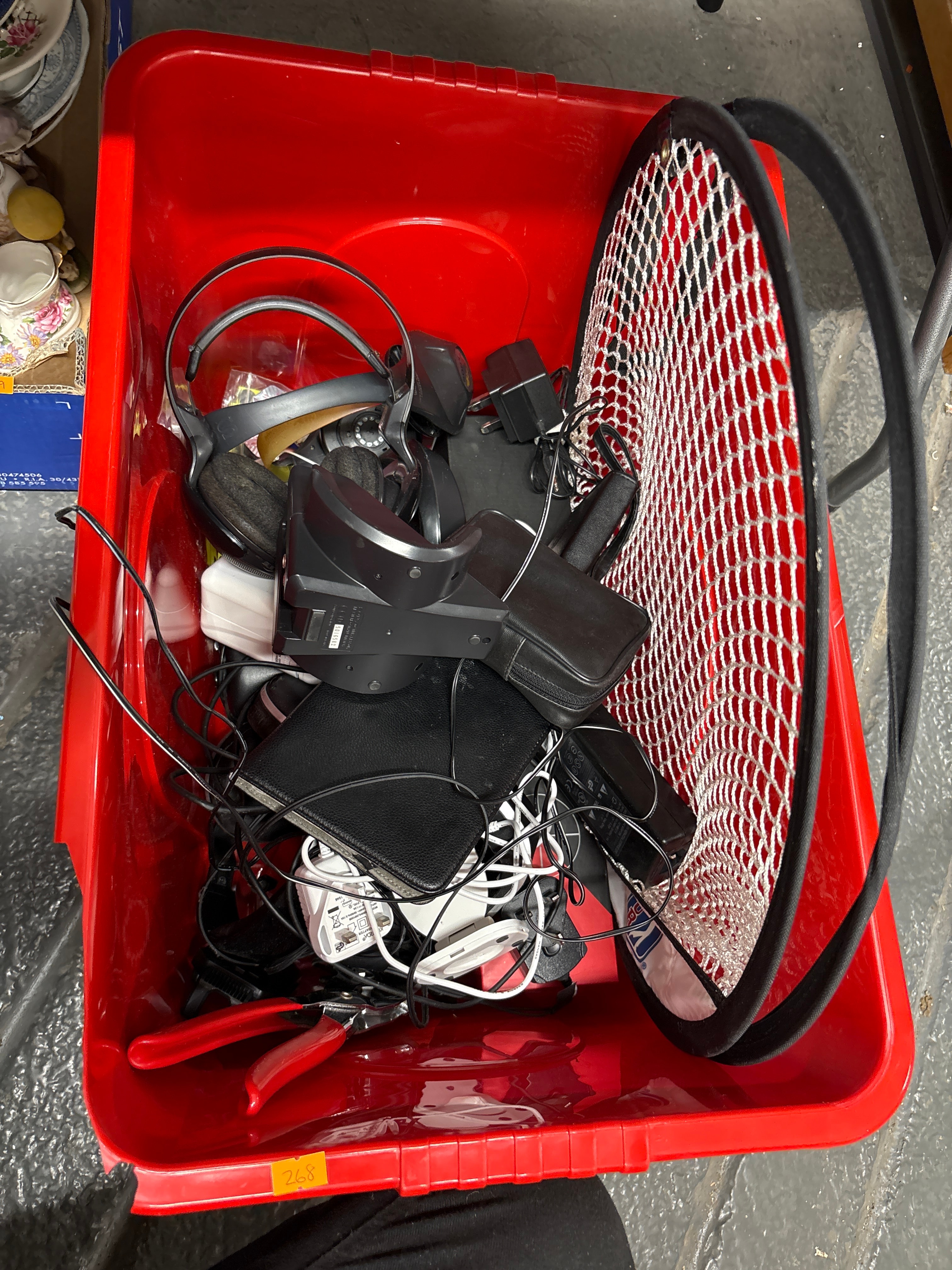 A Red Utility Bin Containing a Collection of Modern Electronic Accessories and Tools