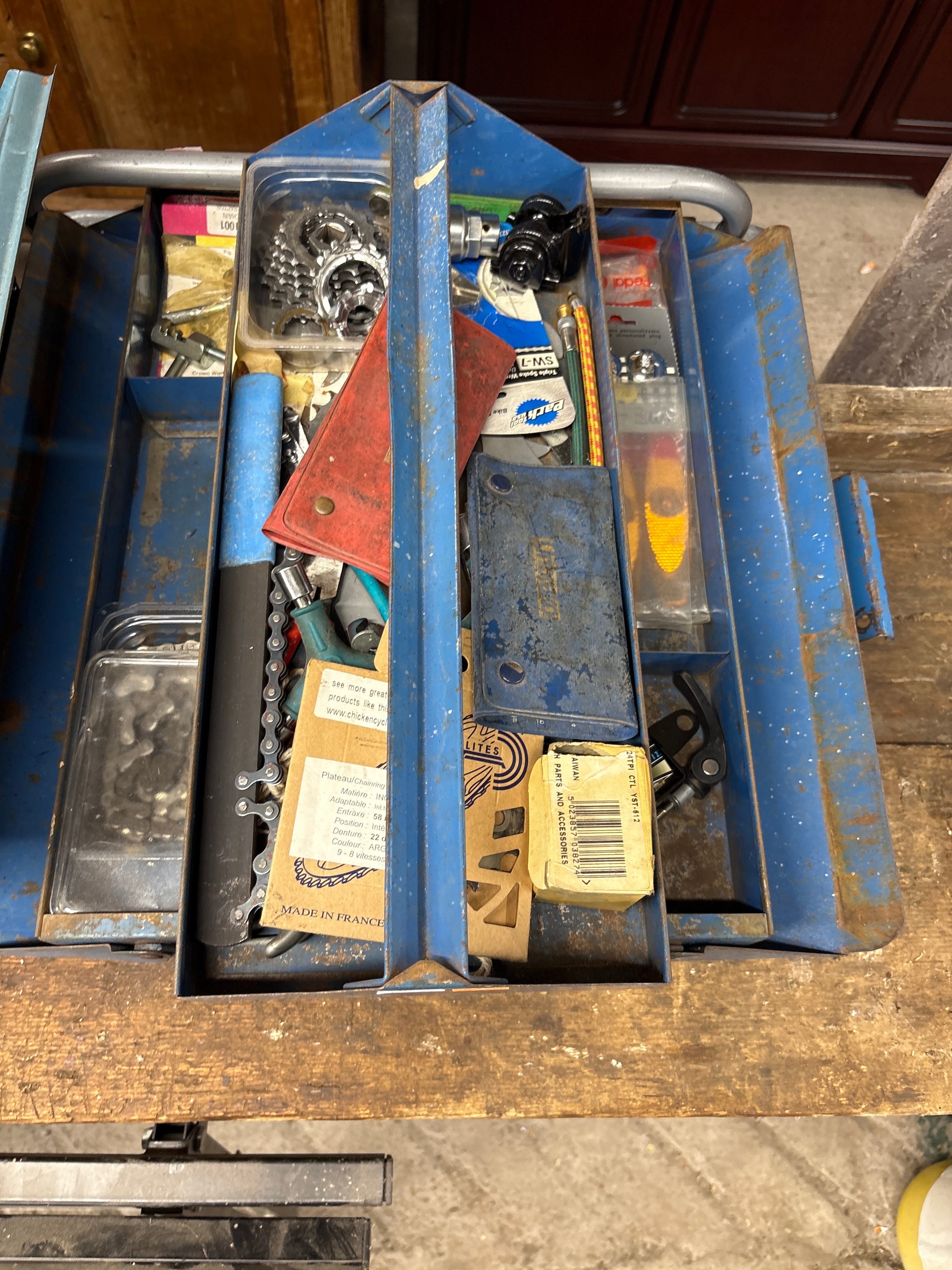 A Blue-Painted Utilitarian Metal Cantilever Toolbox with Bicycle Parts and Accessories