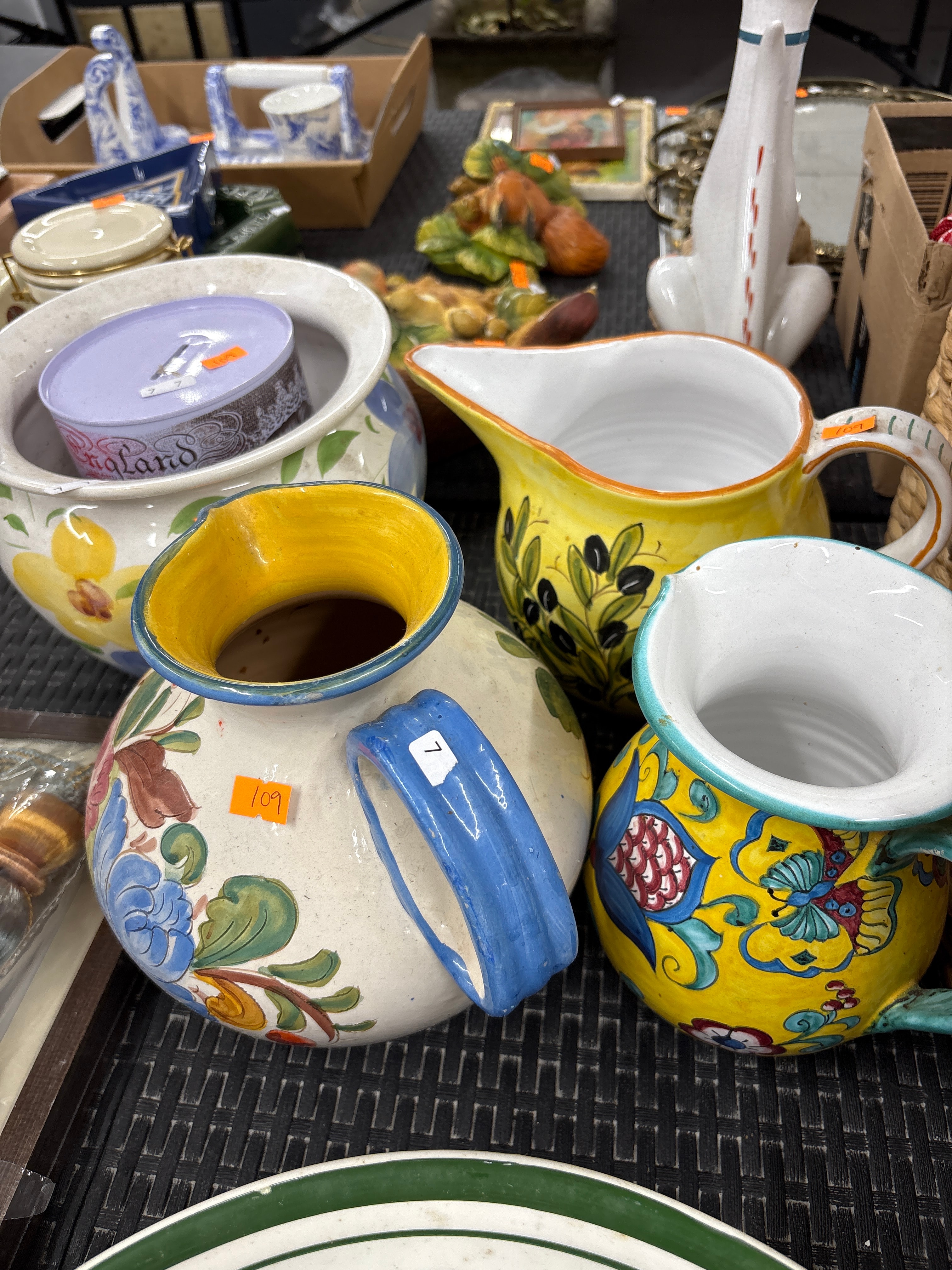 A Group of Hand-Painted Glazed Earthenware Pitchers and Pot