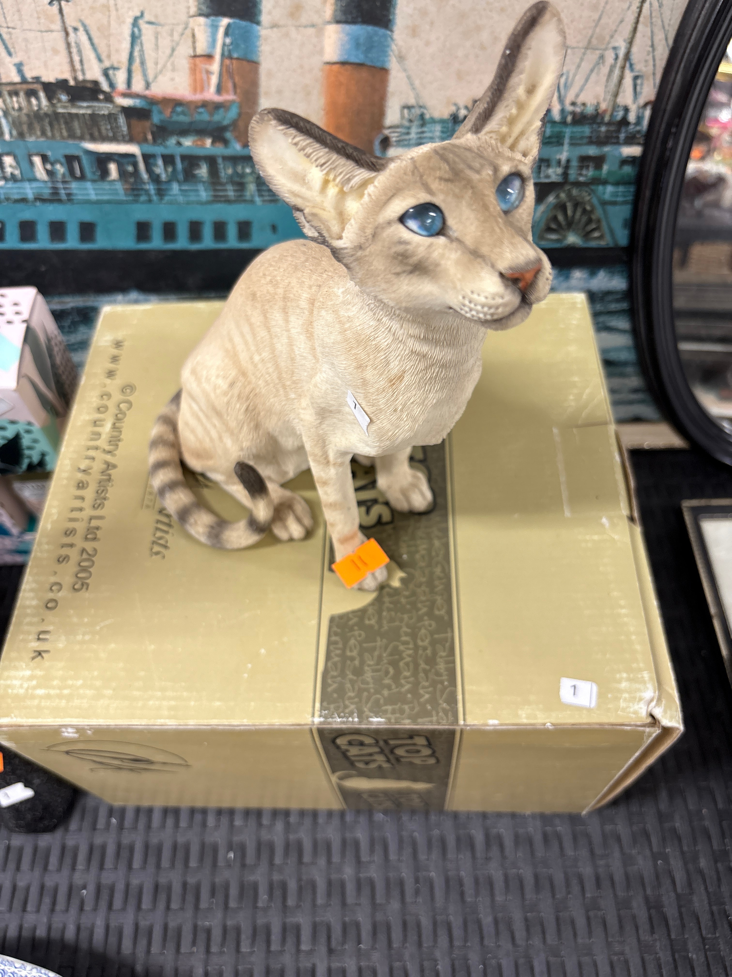 A modern figurine by Country Artists, from their “Top Cats” series, depicting a Blue Tabby Point Siamese cat in a seated pose, model number 04962. Crafted from resin or a similar composite material, the cat features distinct large ears, a slender body, and striking blue eyes. The predominant colour is light beige with subtle painted tabby-like stripes on its body and tail. The figurine is accompanied by its original cardboard box, marked “TOP CATS” and bearing the copyright “© Country Artists Ltd 2005” and the web address “www.countryartists.co.uk.” An orange tag displaying “11” is attached to the cat’s left leg, and a white label with “1” is on the box.