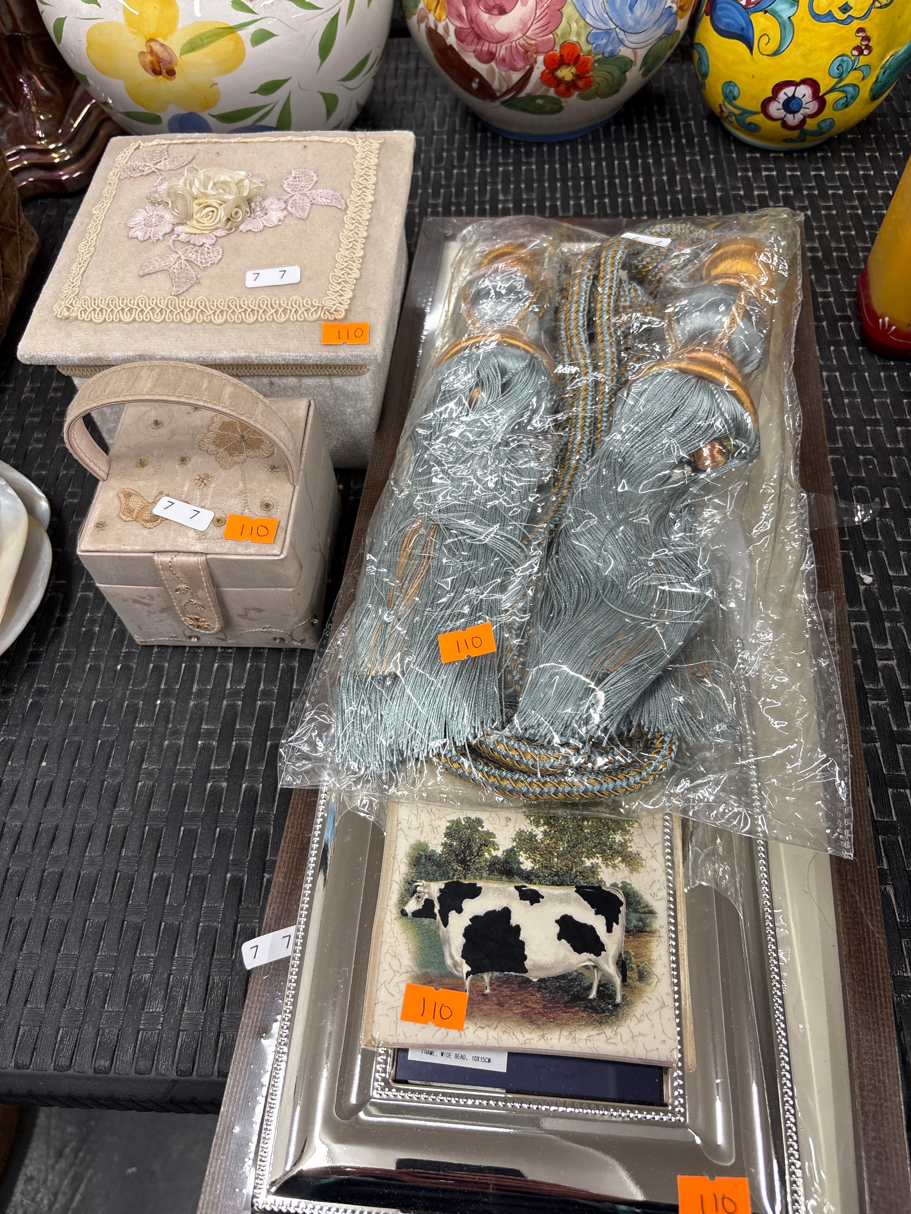 A varied collection of decorative household items. This lot comprises a silver-toned framed print depicting a black and white cow in a pastoral setting, likely on textured paper or tile. Adjacent are two textile-covered boxes: a rectangular hinged box adorned with cream fabric roses and pink lace, and a smaller, handled square box featuring gold-toned embroidered floral and butterfly motifs with small bead embellishments. Also included is a pair of light blue and gold woven textile curtain tie-back tassels, sealed in their original plastic packaging. Partially visible in the background are several hand-painted ceramic or porcelain bowls/planters with colorful floral designs.