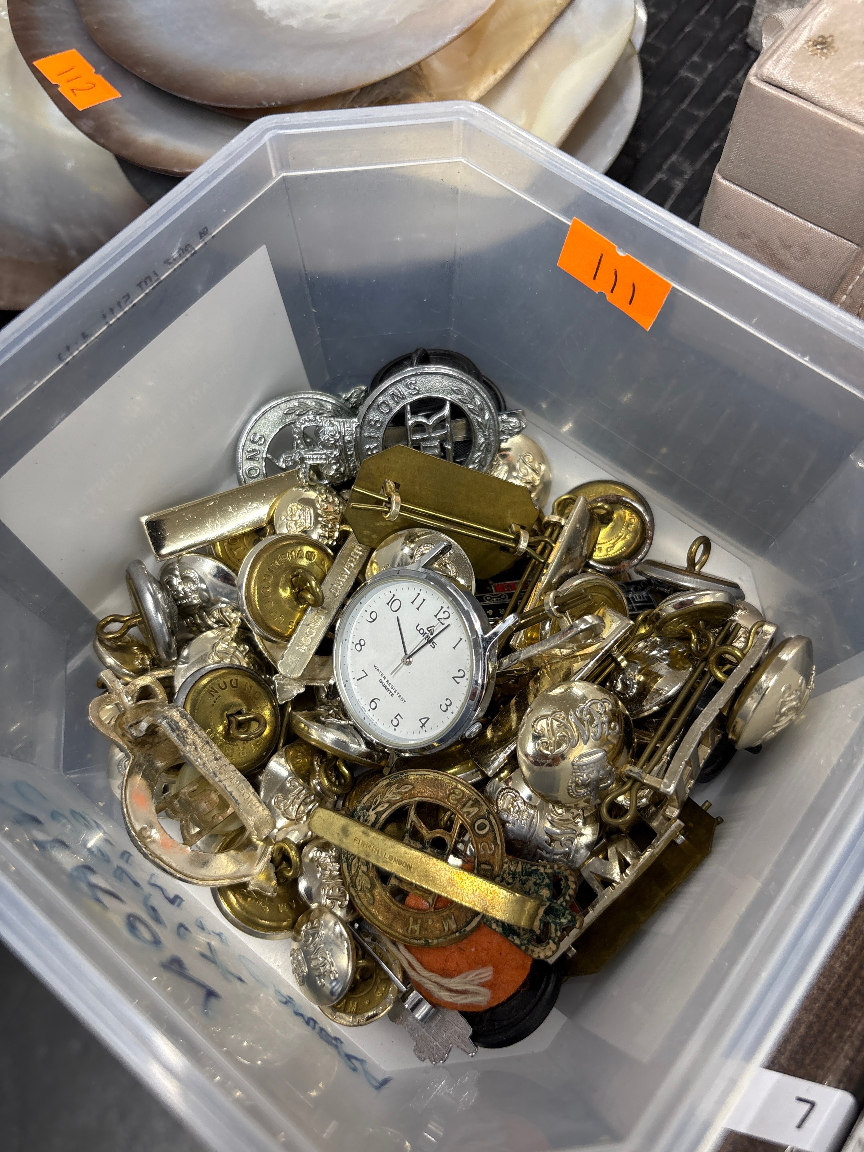 A collection of vintage metal objects, primarily comprising uniform buttons, military or service insignia, and a single Lotus quartz pocket watch. The items are constructed from various brass-toned and silver-toned metals. The pocket watch face is marked “LOTUS”, “WATER RESISTANT”, “QUARTZ”, and “JAPAN MOVT”. Other visible markings include “FIRMIN LONDON” on a bar pin, and partial text such as “SONS”, “LONDON”, and “BIRMINGHAM” on various buttons and insignia. The lot is contained within a clear plastic container. An orange sticker marked “112” is affixed to the container.
