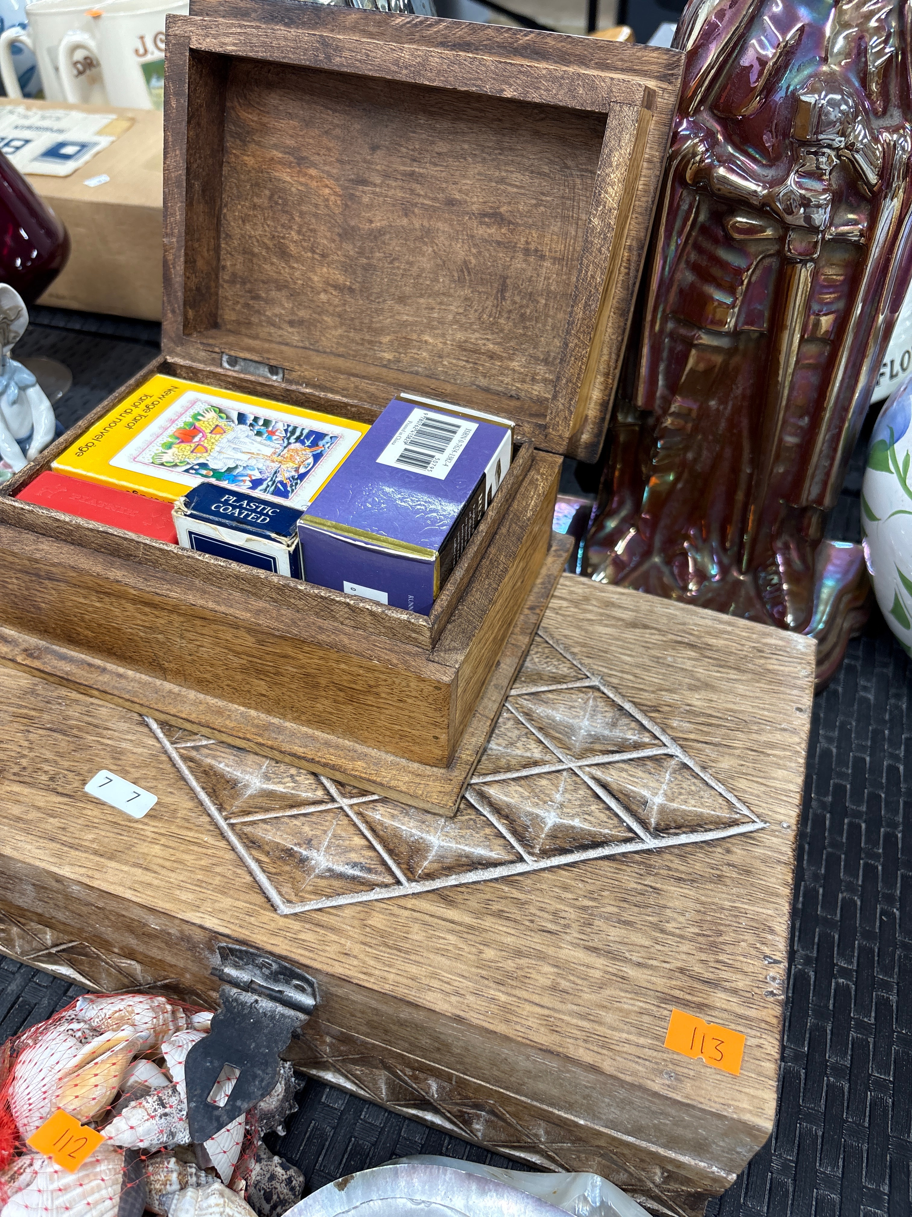 This lot comprises a rustic style, rectangular wooden box with a hinged lid, open to reveal several smaller boxed items. The internal contents include a yellow box marked “New age Tarot” and “Tarot du nouvel âge,” a blue box indicating “PLASTIC COATED,” and a purple box displaying a barcode, ISBN 0-7624-1382-A, a “$17.95” price, and “Printed in China.” This wooden box sits upon a larger, flat, medium-dark stained wooden board adorned with geometric carved or routed patterns. The larger board features a white “7 7” and an orange “113” inventory sticker.
