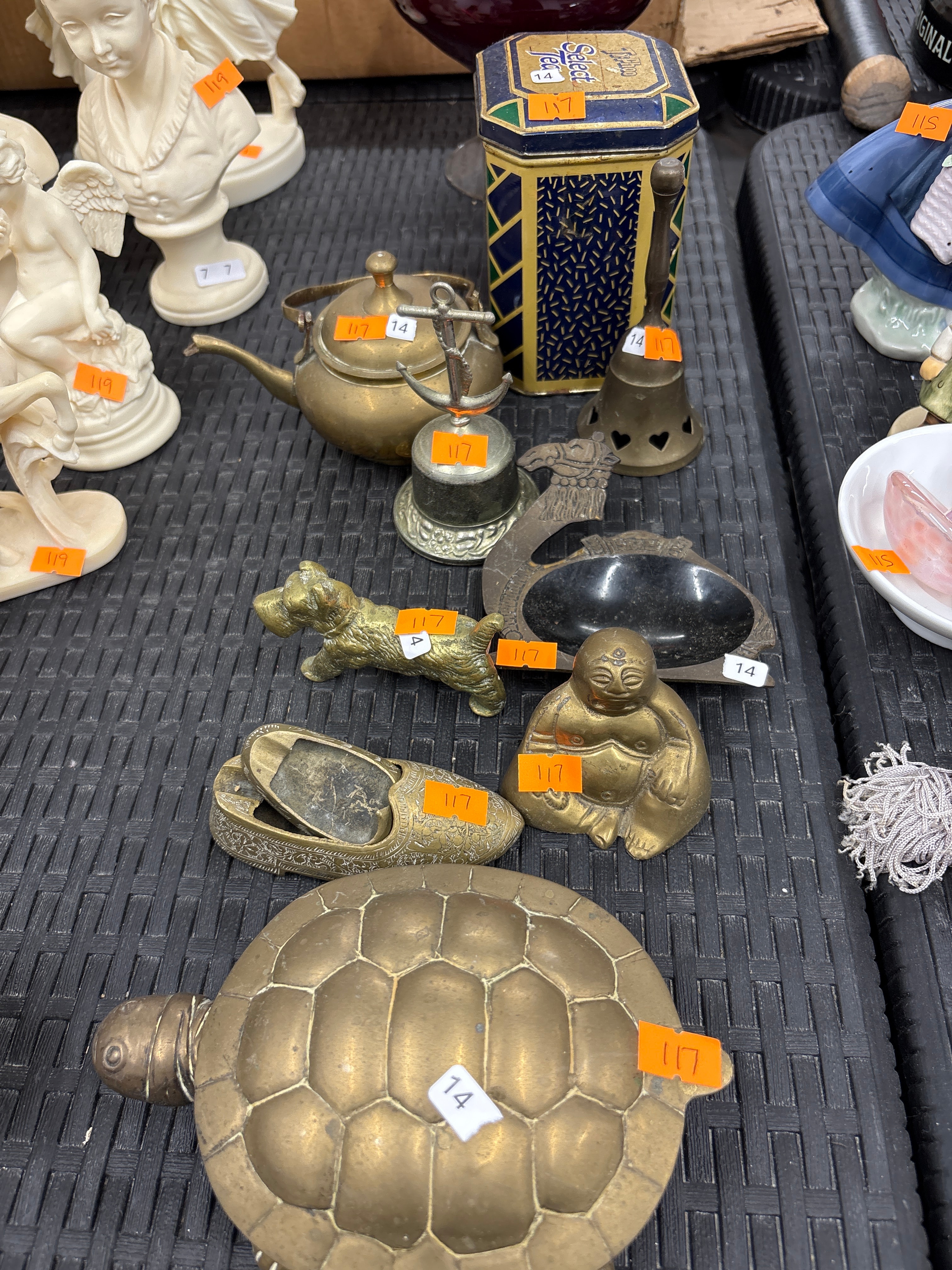 A Vintage Baron Turtle Belt Buckle, circa 1970s, solid brass, often associated with ‘hippie boho’ or ‘nautical’ styles, made in Taiwan. This hinged turtle-form object, identified as a belt buckle, also functions as a lidded box. The collection further comprises several cream-colored figurines, including busts and an angel, molded from resin or a similar composite material; a group of brass or bronze objects including a small teapot, a dog figurine, a seated Buddha figure, an ornate shoe-shaped dish with etched detailing, a heart-cutout bell, an animal-head decorative dish with a dark insert, and an anchor-topped ornament. Also present is an octagonal tin, marked ‘Select Tea’ (English) with blue and gold geometric patterns; a partially visible blue-garbed figurine, likely ceramic; and a white bowl holding a pink crystalline object. All items are marked with orange inventory stickers, and some metallic pieces also bear small white ’14’ labels, indicating a group lot.