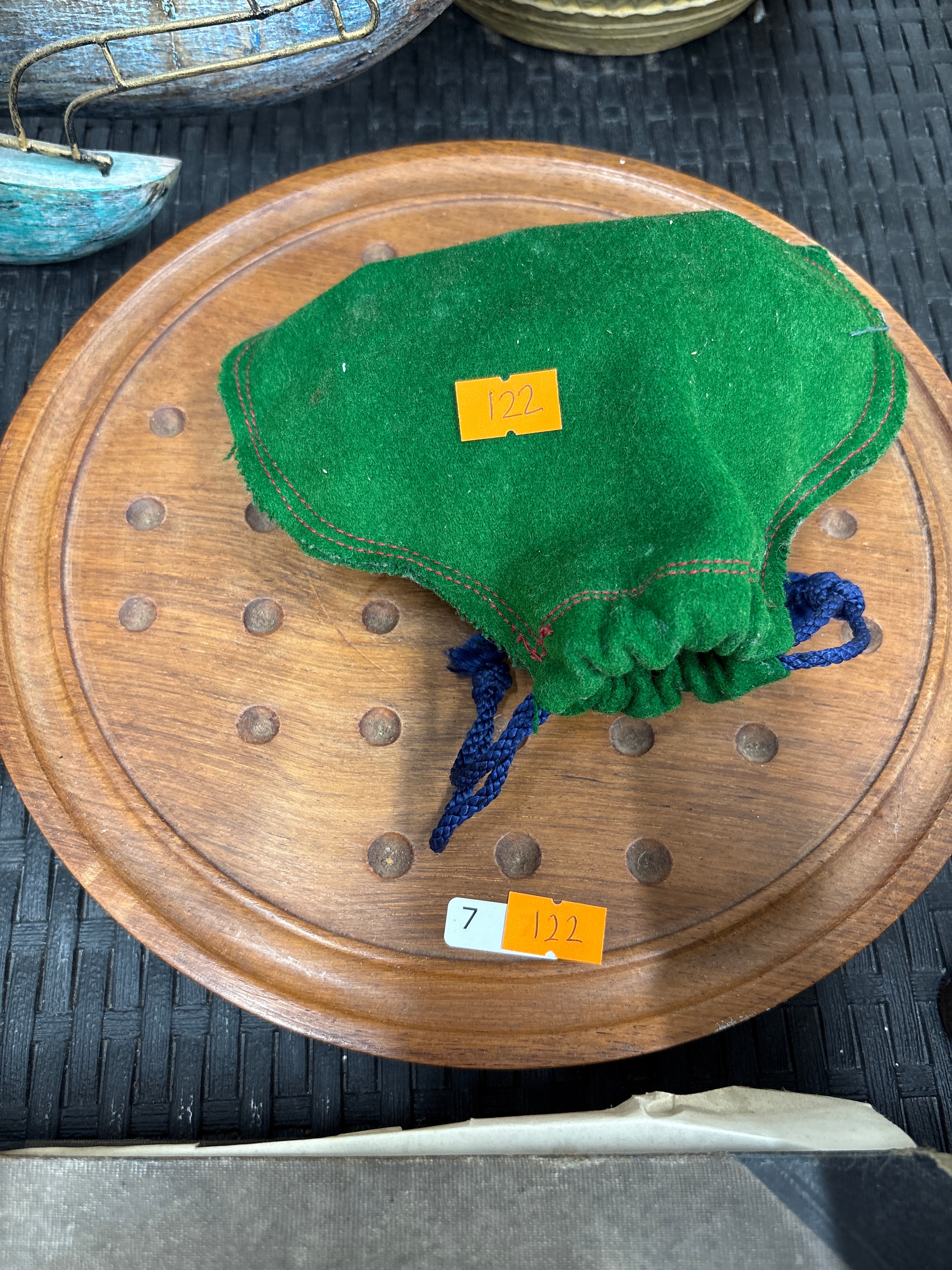 A circular wooden game board, likely for Peg Solitaire, crafted from a medium-toned wood. The board features a series of concentric grooves and multiple recessed circular indentations across its surface. Accompanying the board is a soft, green, felt or fleece-like fabric drawstring pouch, detailed with red stitching along its edges and secured with a blue braided cord drawstring.