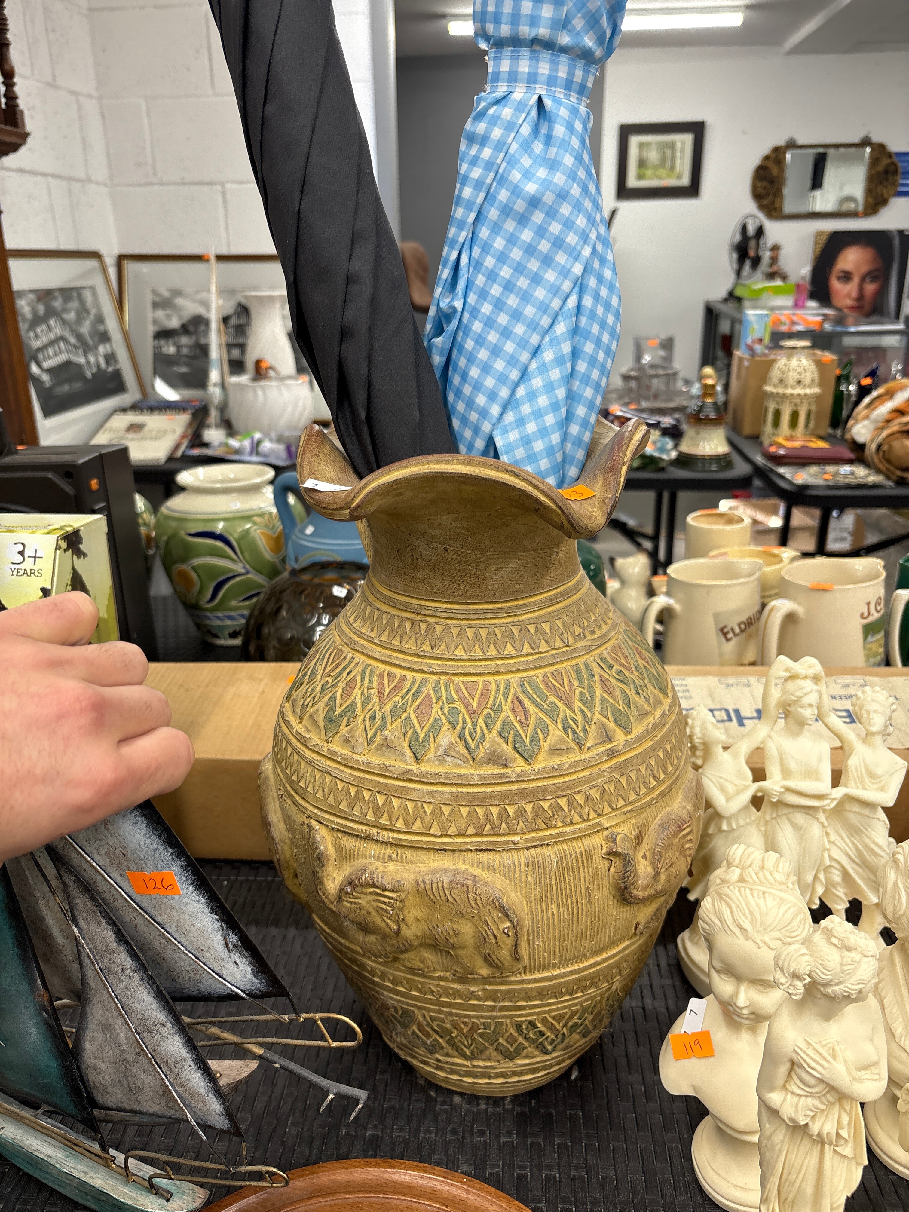 A large vintage Mid-Century Modern West German pottery floor vase, dating from the 1960s. This yellowish-brown decorative vase features a flared, undulating rim and a bulbous body. Its surface is extensively adorned with relief carvings, including a band depicting stylized elephants around the lower half, complemented by multiple bands of intricate geometric and stylized floral/leaf patterns accented with muted green, red, and brown tones. The material is a heavy ceramic or earthenware, possibly with a faux-bronze finish. No manufacturer’s marks or identifying text are visible. The vase is currently holding two umbrellas.