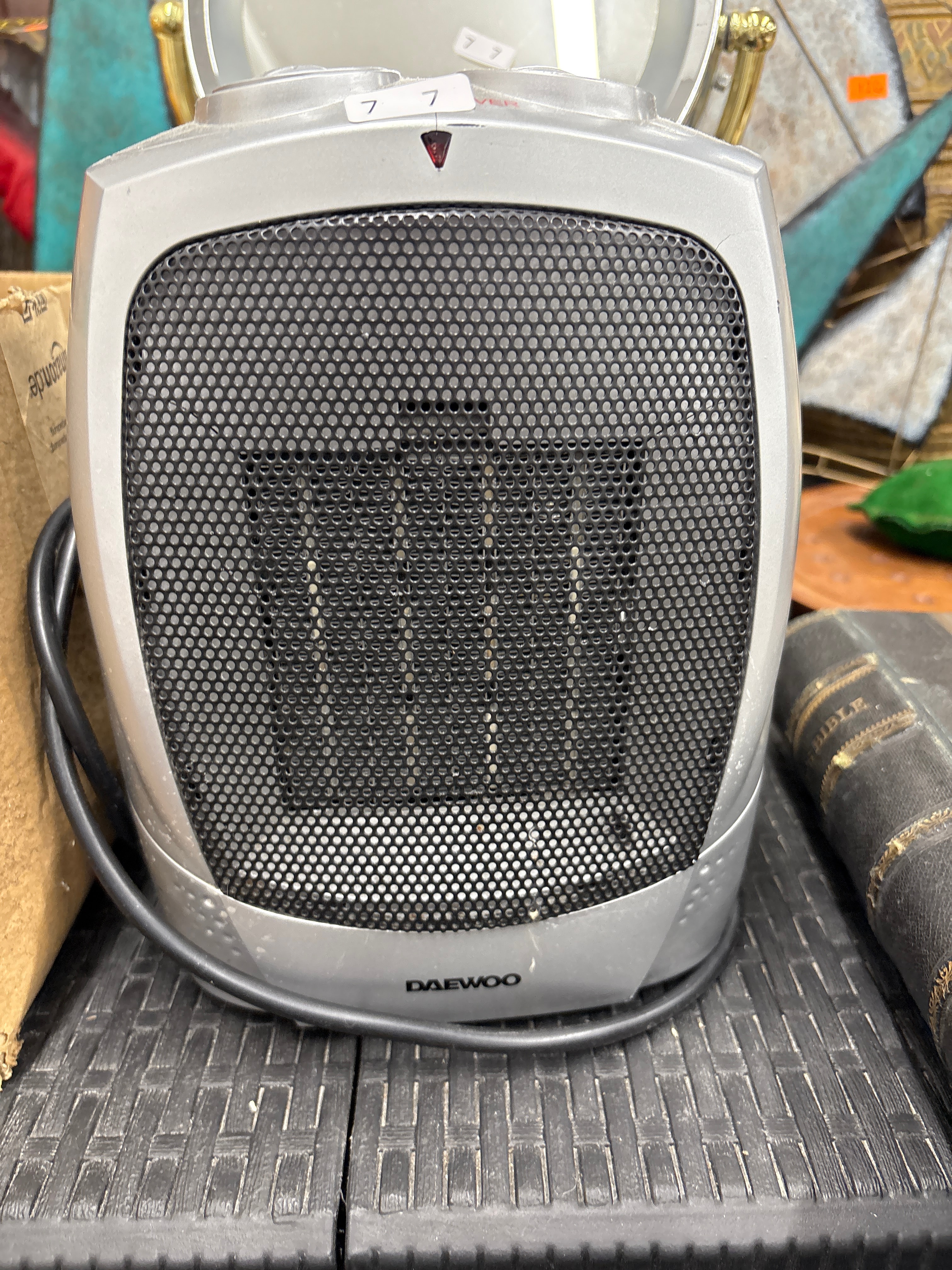 A DAEWOO Ceramic Portable Electric Space Heater, presenting a utilitarian and contemporary style, likely from the late 20th or early 21st century. It features a silver-grey plastic casing with a black metal grille on the front, enclosing internal heating elements visible through the perforations. A black power cord is wrapped around the lower portion. A small red triangular indicator light is present on the top surface, along with several white sticky labels marked with the number “7”. This model is typically equipped with features such as an adjustable thermostat, overheat, and tip-over protection, suitable for home or office use.