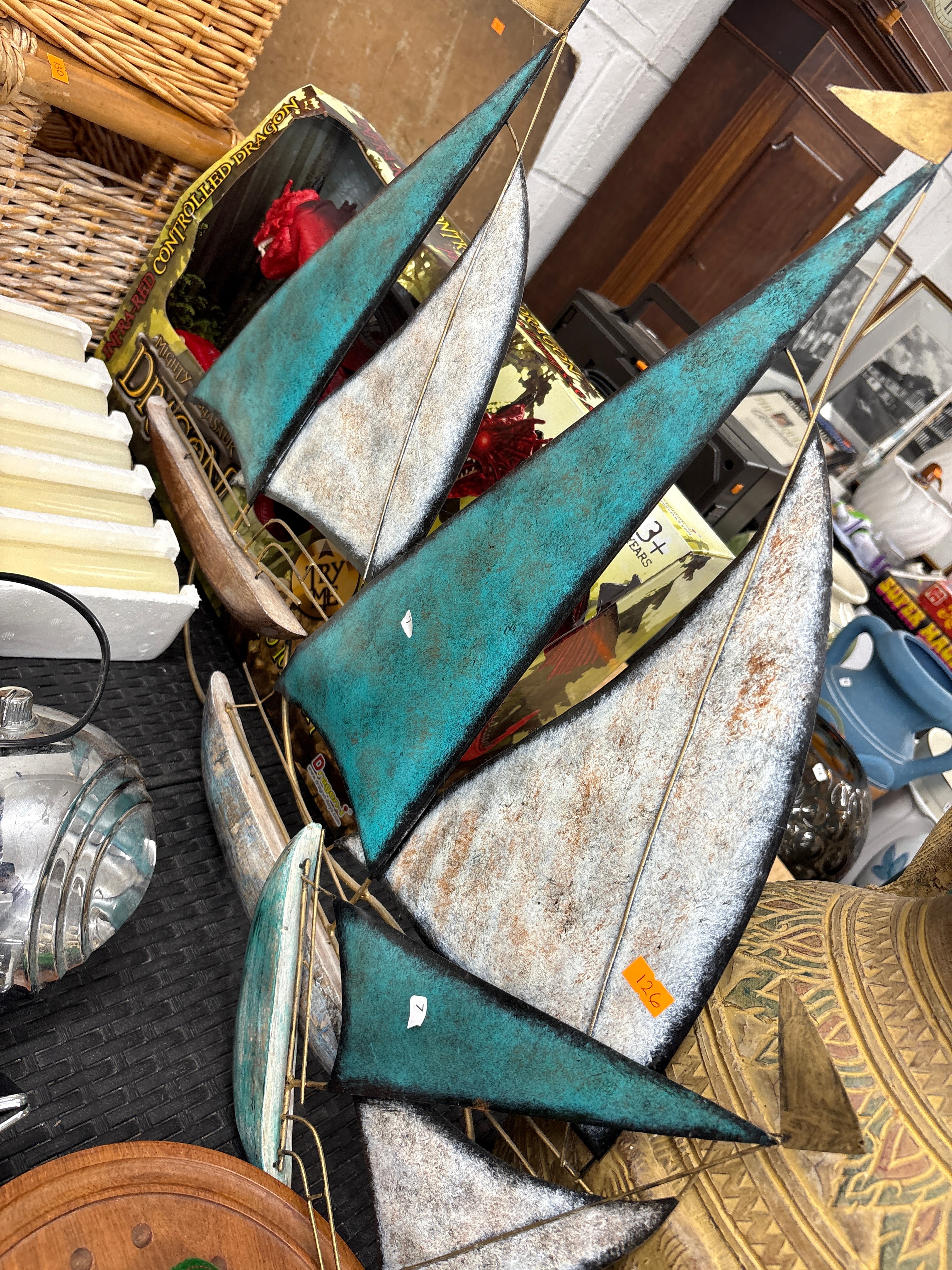 A contemporary decorative sculpture composed of multiple stylized sailboats. The piece features several boats with slender, pointed hulls, crafted from wood, and triangular sails appearing to be crafted from metal sheeting, interconnected by thin brass-toned wire rigging. The sails exhibit a distressed, aged finish, with some painted in a verdigris-like teal and others in an off-white or light grey with brown patination. Visible markings include small white stickers with the number ‘1’ on one teal sail and an orange sticker with ‘126’ partially visible on another.