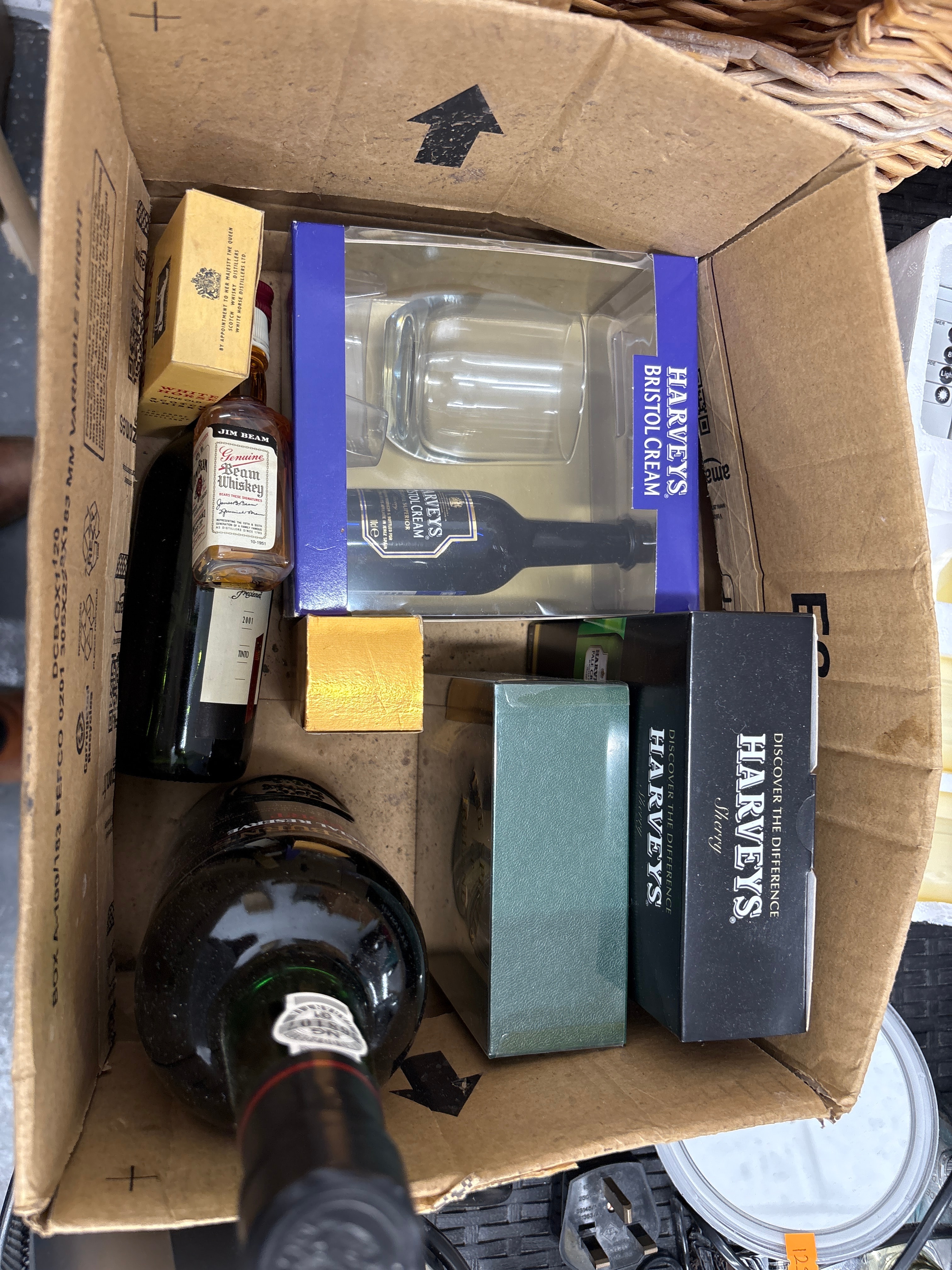 A group of assorted alcoholic beverages and associated glassware, presented in their original retail packaging within a cardboard shipping box. The collection includes a Jim Beam Genuine Beam Whiskey miniature glass bottle, a miniature box for White Horse Scotch Whisky (marked “By Appointment to Her Majesty The Queen”), a Harveys Bristol Cream gift set comprising a glass bottle and a clear glass tumbler, and two Harveys Sherry boxes (one black with “Discover the Difference” text, one teal/green). Also present are a large dark green glass bottle, likely Port or wine, with “Vintage Reserve” partially visible, and another dark bottle marked “Tinto” (red wine). The items are primarily constructed from glass and cardboard.