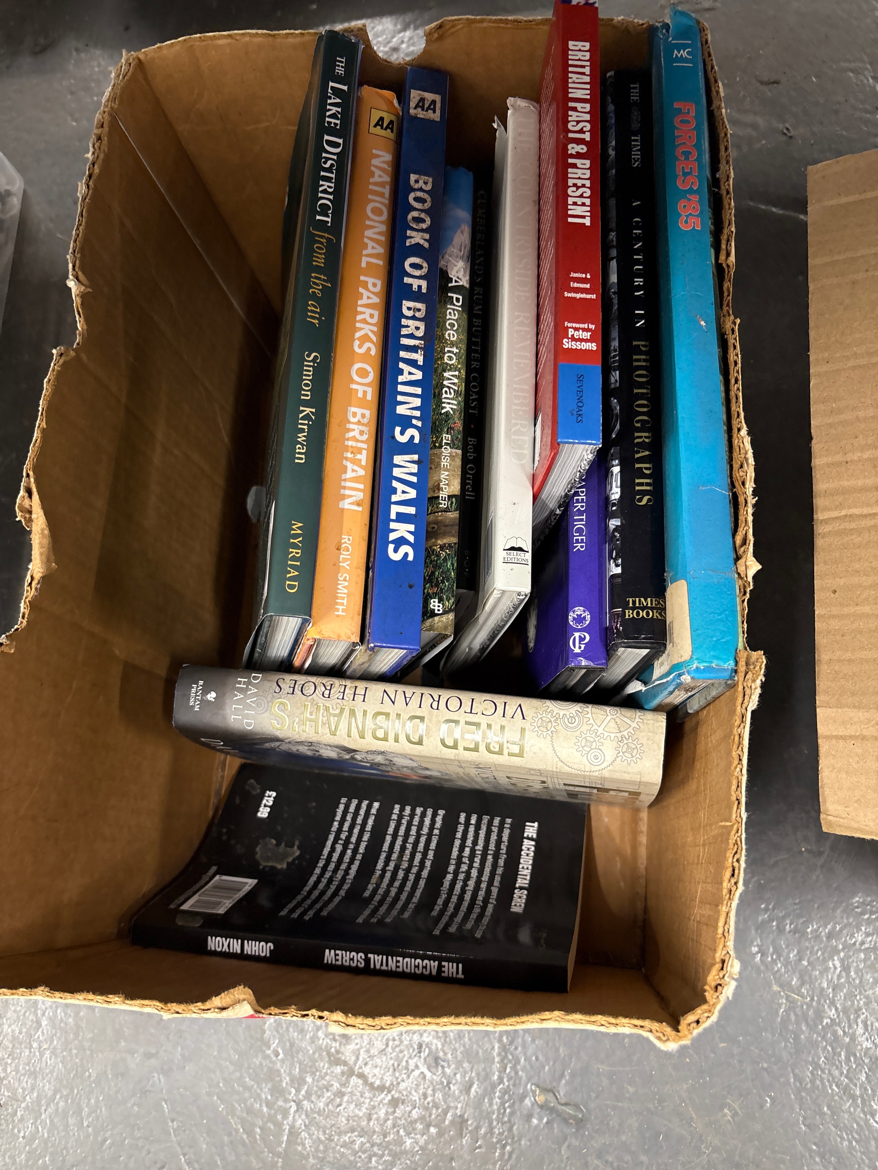 A collection of approximately ten assorted paperback and hardcover books, primarily focused on British geography, history, and walking. Visible titles include “The Lake District,” “National Parks of Britain,” “Book of Britain’s Walks,” “Britain Past & Present,” “A Century in Photographs,” “Forces ’85,” “Fred Dibnah’s Victorian Heroes,” and “The Accidental Screw.” Publishers indicated include AA, Myriad, Bantam Press, Times Books, Sevenoaks, and Select Editions. One book displays a £12.99 price tag. The books are presented in a worn cardboard box.