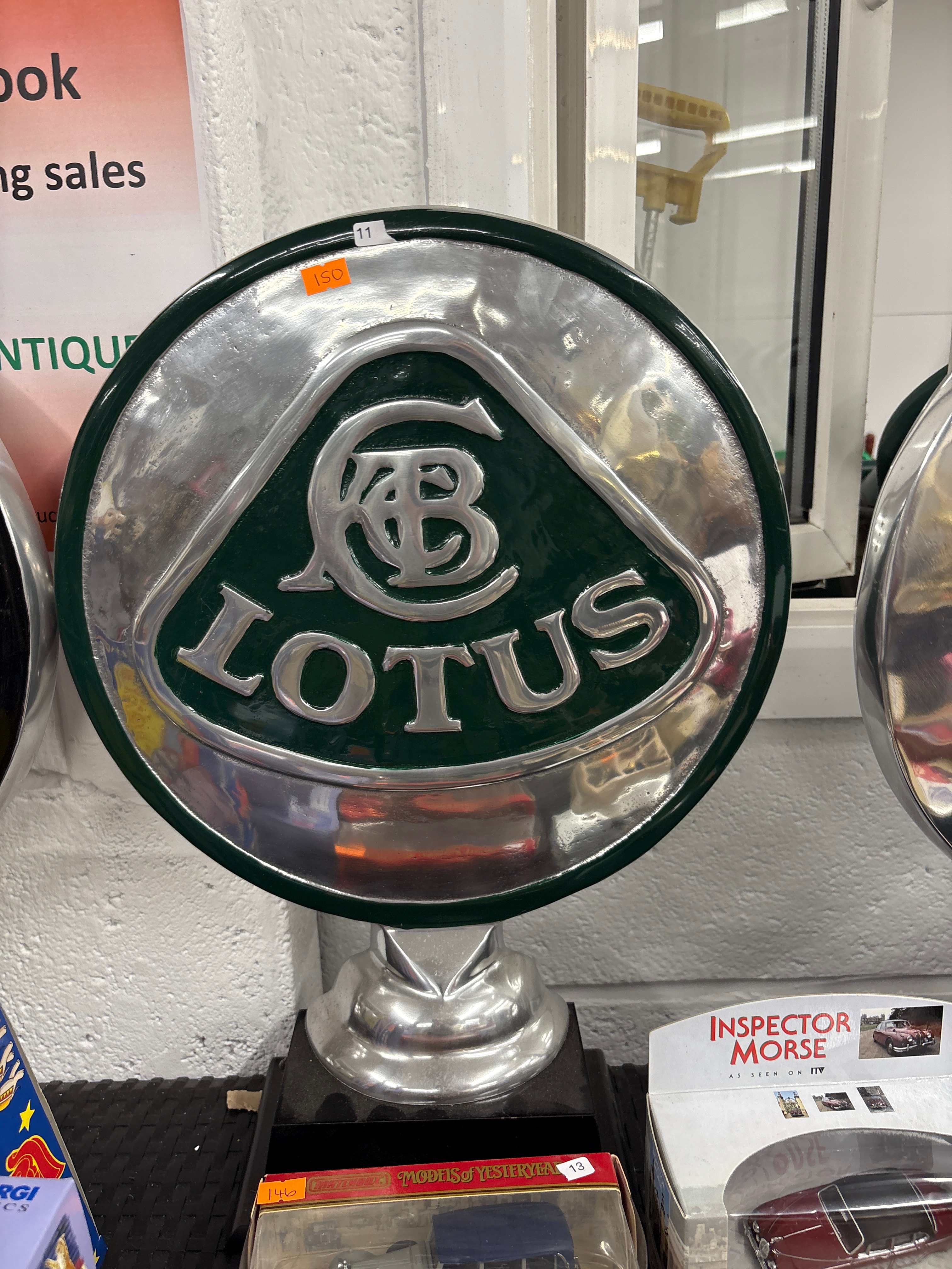 A round automotive display plaque, likely cast metal with polished silver-tone and dark green enamel finishes, mounted on a dark, textured base. The central design features the raised word “LOTUS” below intertwined capital letters “A.C.B.” within a shield motif.