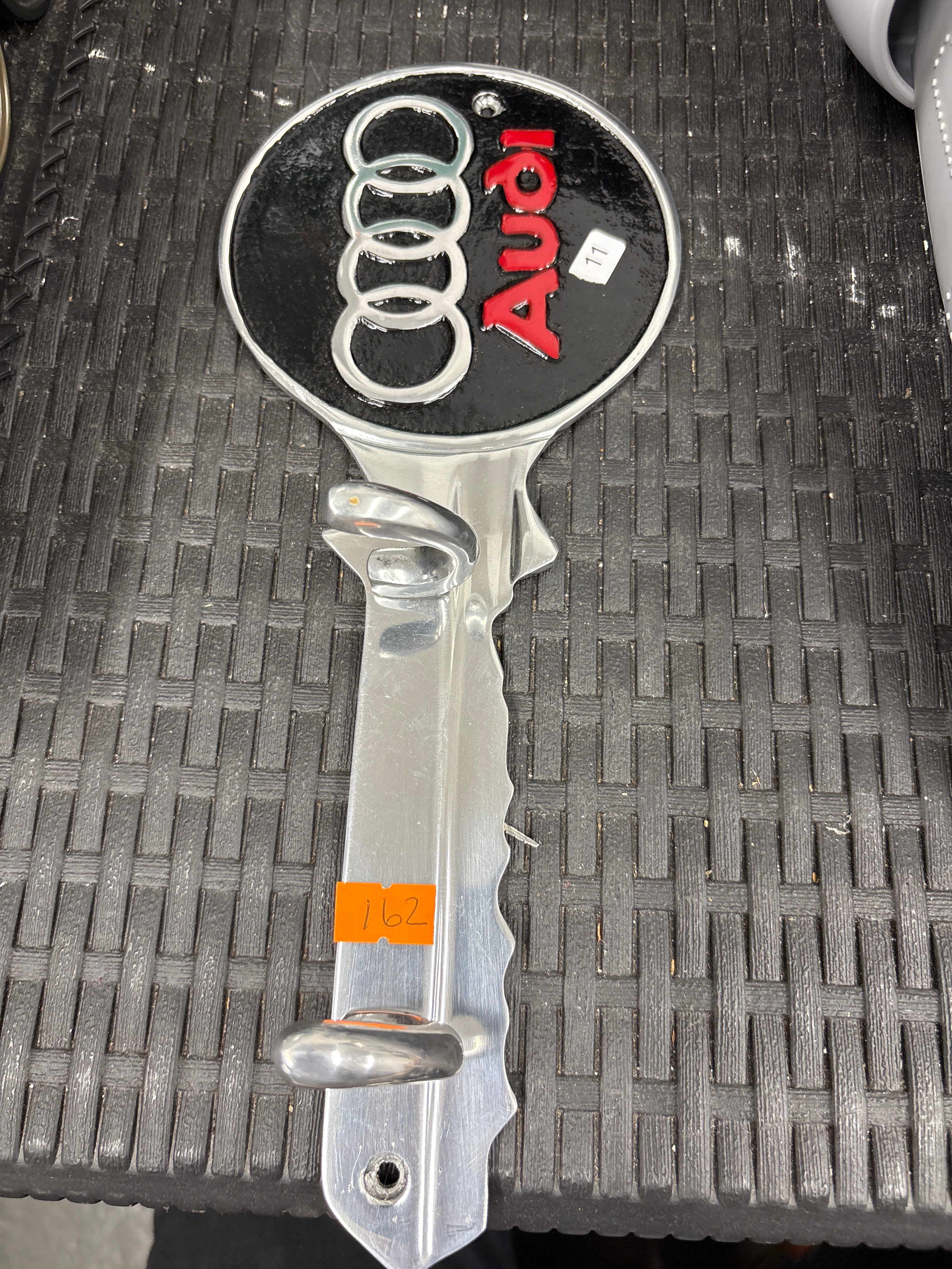 An Audi Wall Mountable Key Holder, designed as an oversized novelty key. Likely intended as a decorative wall hanger or promotional piece, it features two integrated hooks on the shaft. Constructed from a polished or brushed metallic material, possibly aluminum, its design is modern and automotive-themed. The circular head prominently displays the Audi logo—four interlocking rings in a silver-tone finish—set against a textured black background, with the brand name ‘Audi’ rendered in raised red, stylized lettering. The item reflects the contemporary Audi brand aesthetic. A small white label with ’11’ is visible on the head, and an orange label marked ‘162’ is affixed to the shaft, both likely inventory numbers.