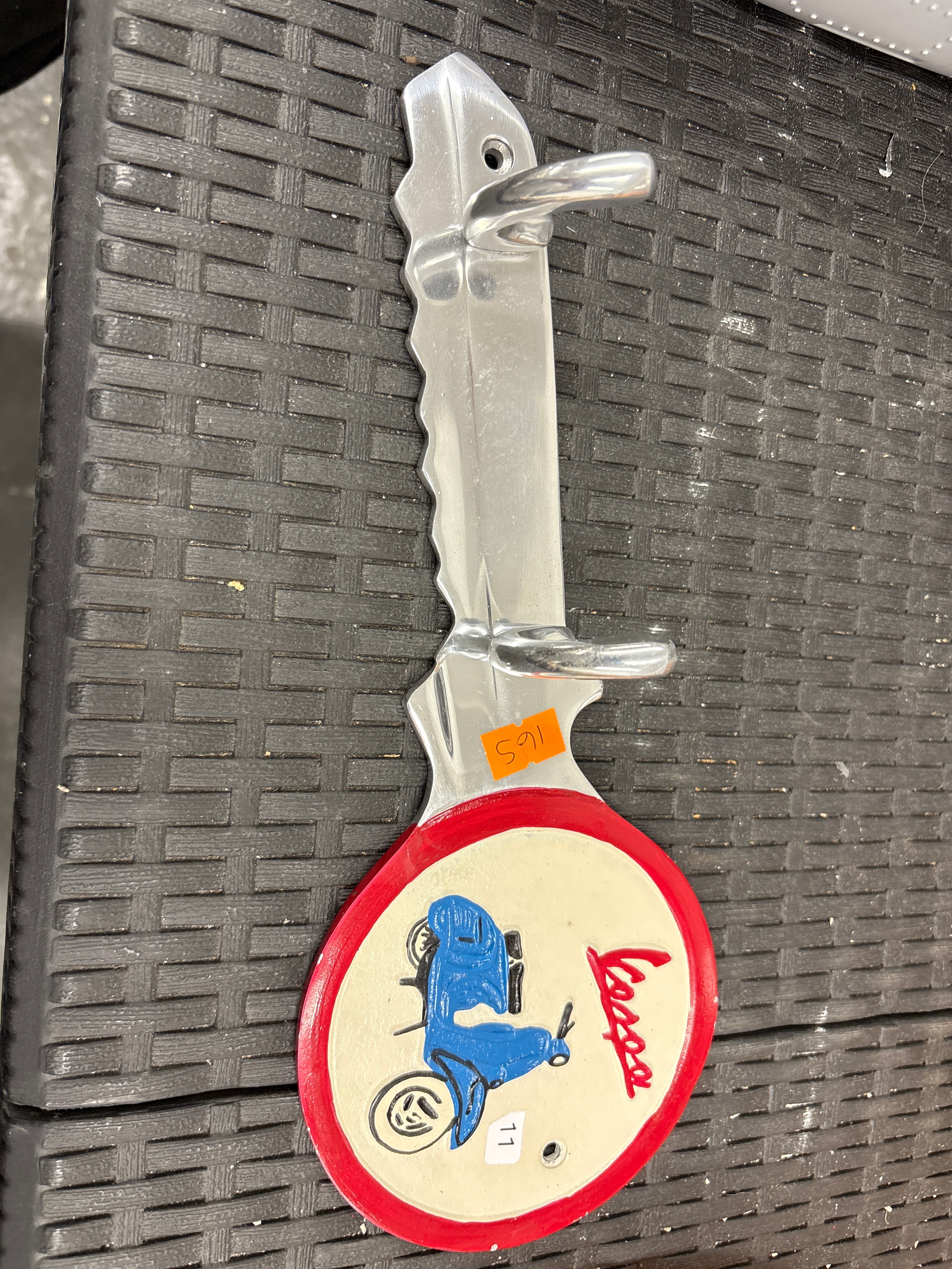 A Vespa Service Bar Plaque Double Hook, featuring a polished silver-tone metal structure with a stylized, undulating spine forming two hooks. The wall-mounted component is affixed to a circular plaque, likely made of painted wood or composite material, finished in white with a red outer rim. The plaque features a raised, blue-painted illustration of a Vespa scooter, with the brand name “Vespa” written in red stylized script to its right. Markings include an orange sticker on the metal portion displaying “S91” and a small white sticker on the circular base with the number “11.”
