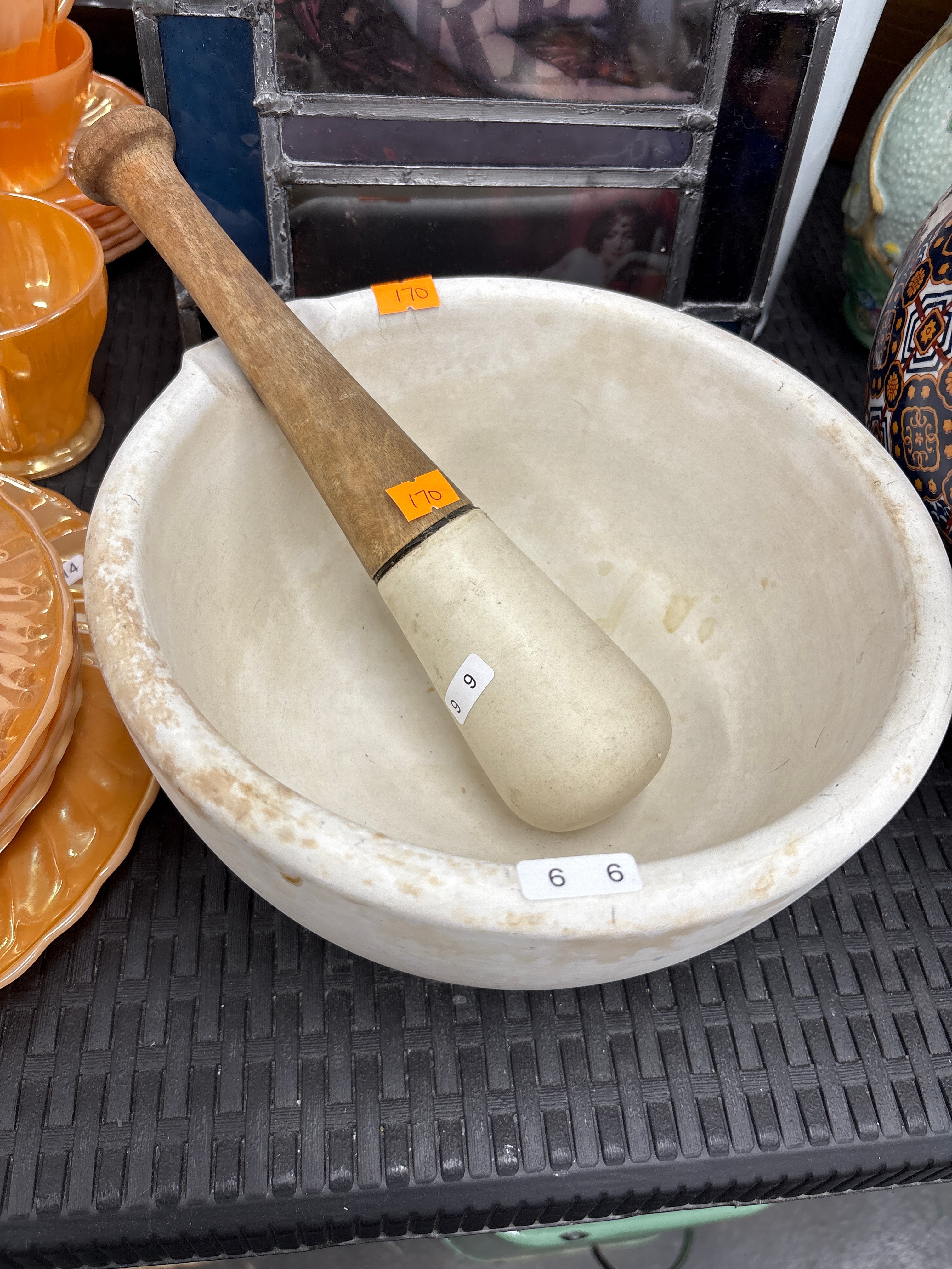 An Antique 1800s Thomas Maddock & Sons Co. Apothecary Mortar and Pestle, described as ‘Acid Proof’. This utilitarian set comprises a substantial, bowl-shaped mortar crafted from a light-colored, porous material, likely ceramic or stoneware. The pestle features a turned wooden handle joined to a bulbous grinding end, which matches the material of the mortar. No discernible maker’s marks or decorative elements are apparent beyond the item’s functional design.