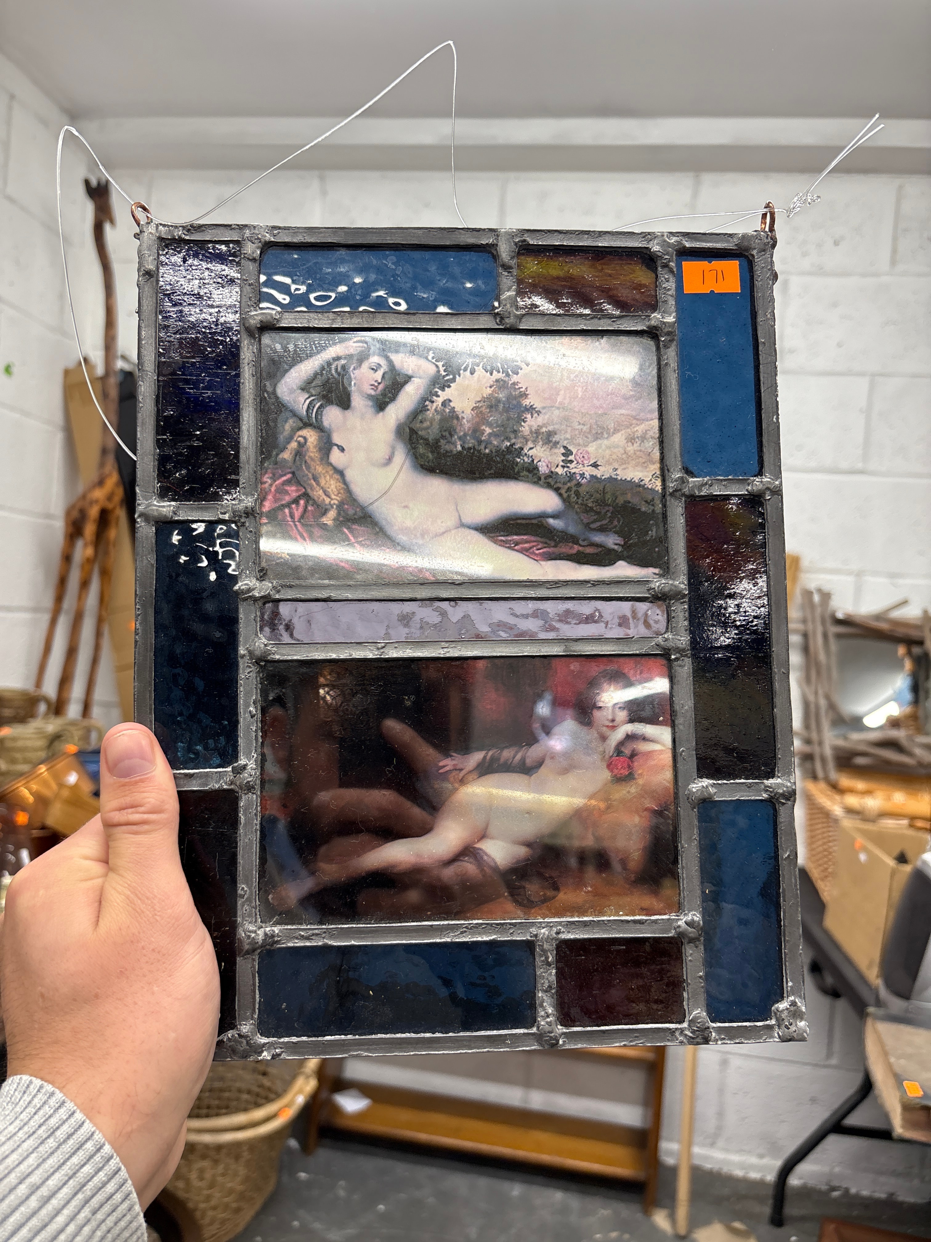 A rectangular decorative leaded glass panel featuring a border of textured glass in shades of blue, purple, and amber. The panel frames two central rectangular inserts, which are reproductions, likely prints or decals on glass, depicting classical-style reclining female nudes in verdant and opulent settings, reminiscent of Old Masters paintings. The lead came framework shows signs of oxidation. An orange sticker marked “171” is visible on an upper right blue glass section.