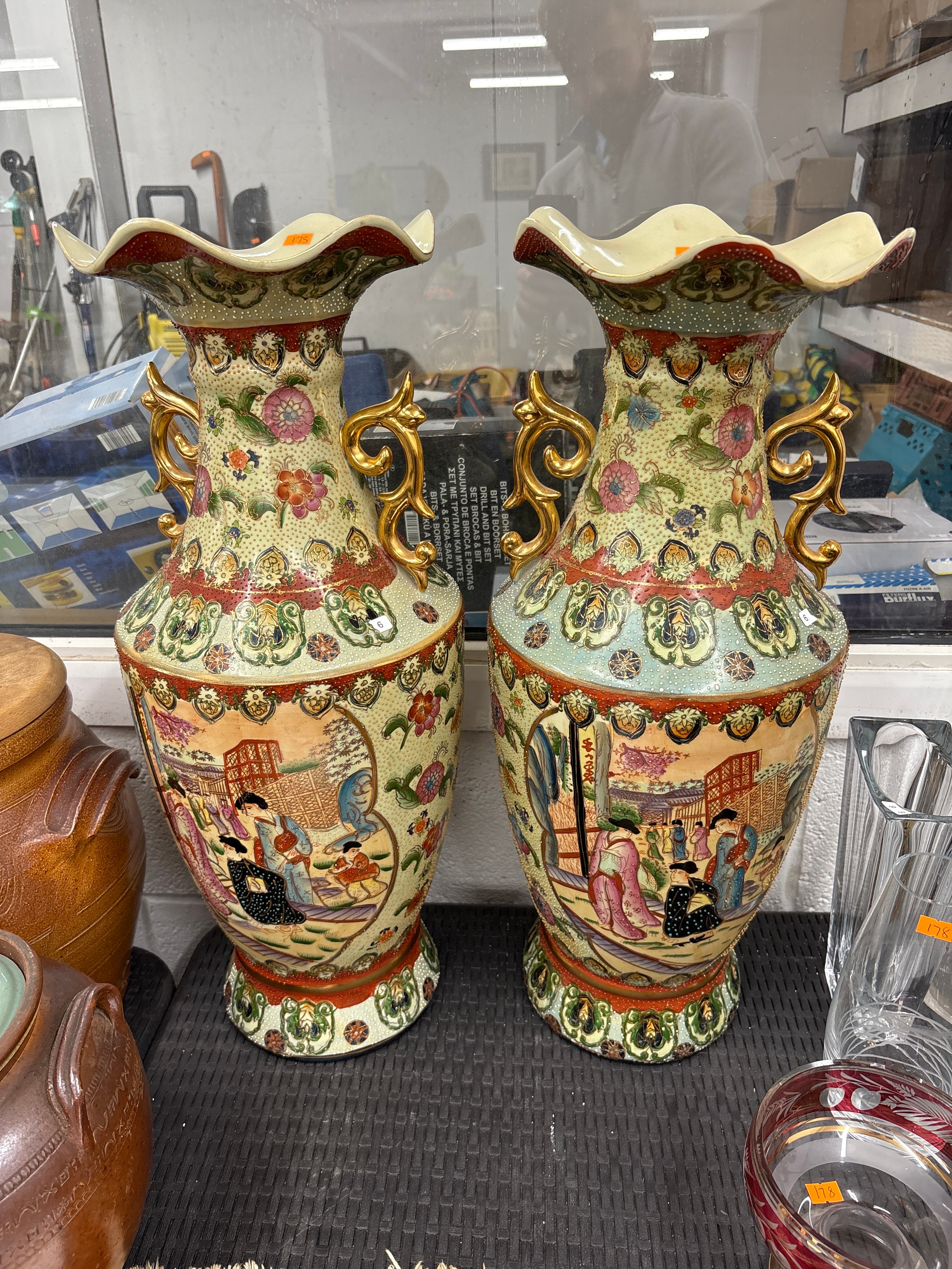 A pair of Japanese Satsuma style hand-painted moriage ceramic vases. Each large, highly ornamental vase features a trumpet-shaped, scalloped mouth and two elaborate, scrolled gilt-metal handles. The bodies are densely decorated with polychrome enamel in a vibrant East Asian style. Prominent features include two main cartouches on each vase depicting scenes with multiple figures in traditional attire within landscape or architectural settings, interspersed with rich floral designs and geometric borders. The background enamel exhibits a textured, stippled moriage effect. An orange rectangular sticker with ‘175’ is present on the rim of one vase, and a small circular sticker with ‘6’ is on the lower body of the other.