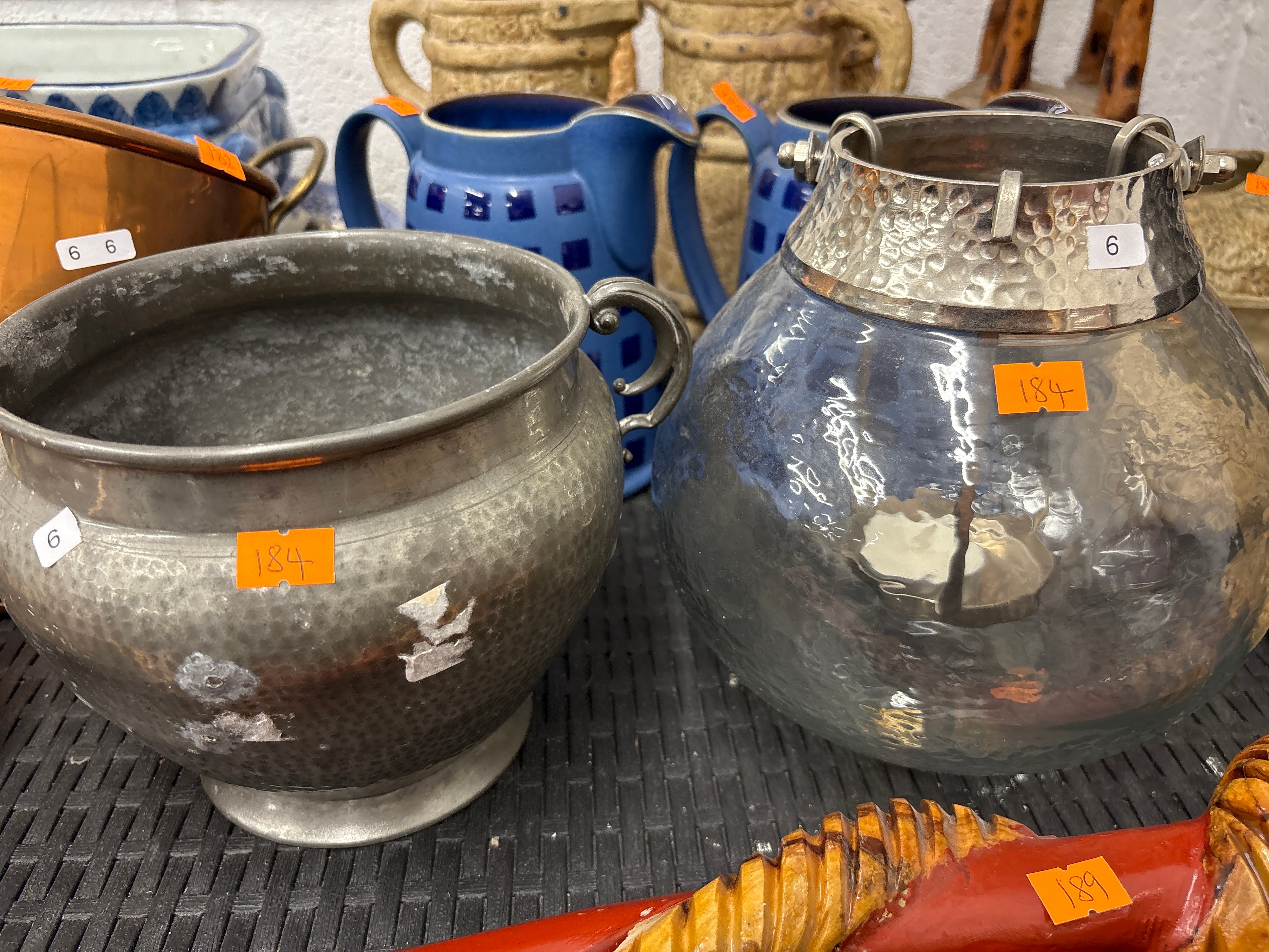 A hammered dark-grey metal pot or bowl, possibly pewter or tarnished silver-plated, featuring a single handle and a circular foot. It is accompanied by a large, globular vessel crafted from dark, highly reflective glass with iridescent qualities, topped by a wide, hammered silver-toned metal collar that supports two strap handles secured by visible nut-and-bolt attachments. Web intelligence suggests the glass vessel is consistent with a glass lantern or candle jar. Both items bear white stickers ‘6’ and orange stickers ‘184’.