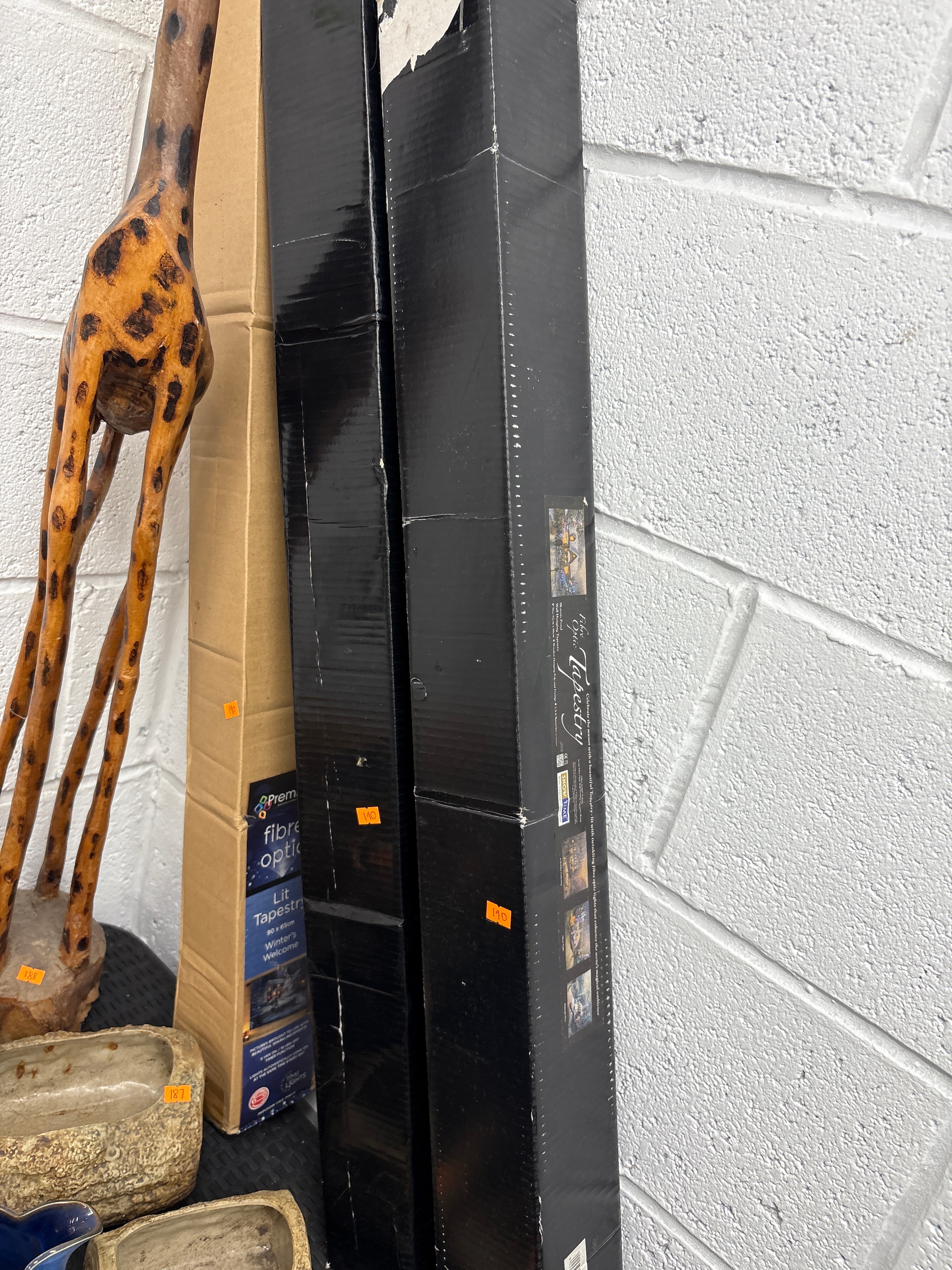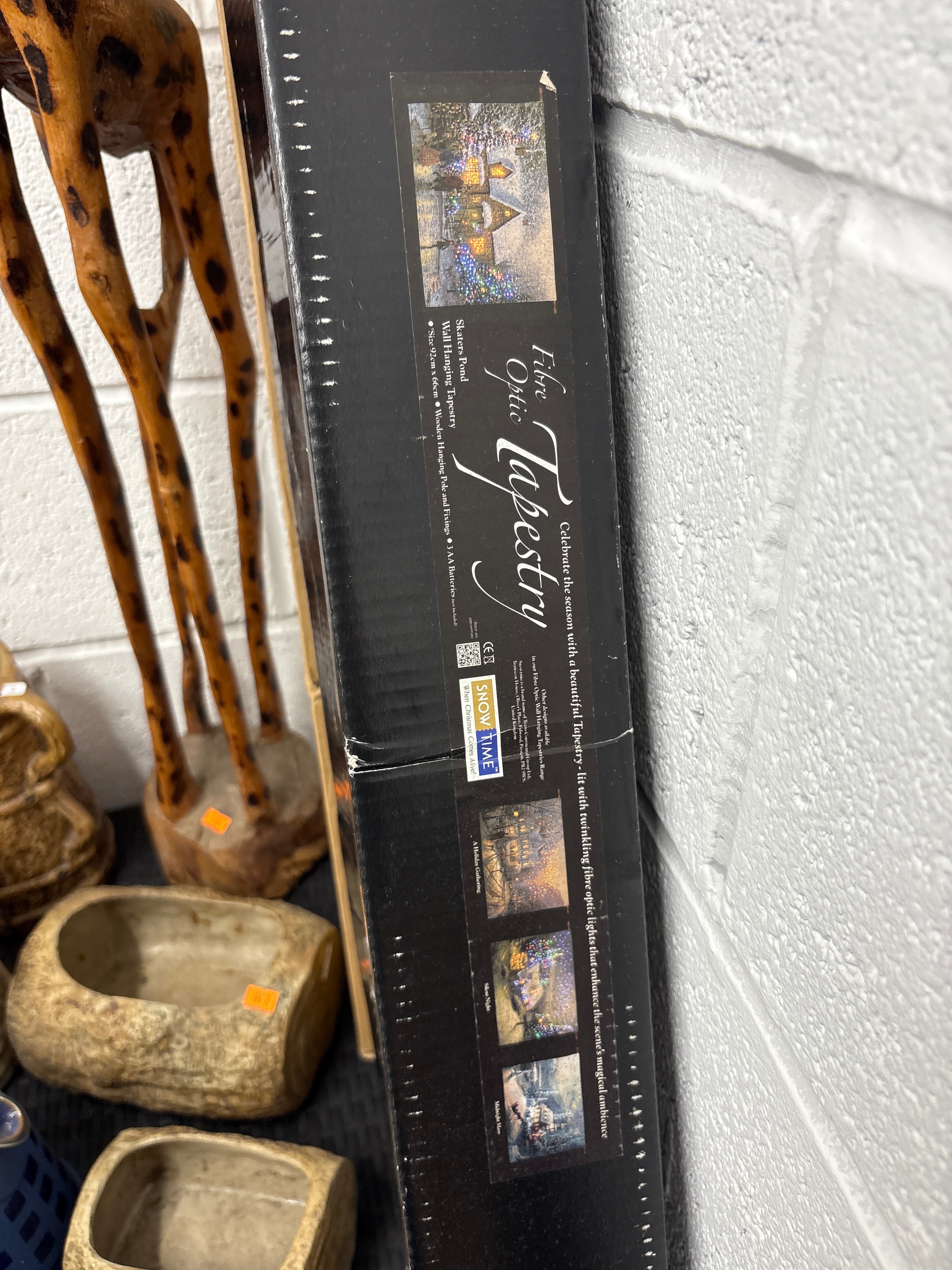 Three fibre optic wall hanging tapestries, two presented in long black cardboard boxes labeled ‘Fibre Optic Tapestry’ with ‘twinkling fibre optic lights’ and featuring various scenic designs such as ‘Silent Pool’ under the ‘SNOW TIME’ brand. The third tapestry is in a partially visible brown cardboard box, labeled ‘Prem fibre optic Lit Tapestry’ titled ‘Winter’s Welcome’. All three tapestries appear new in their original manufacturer’s packaging.
