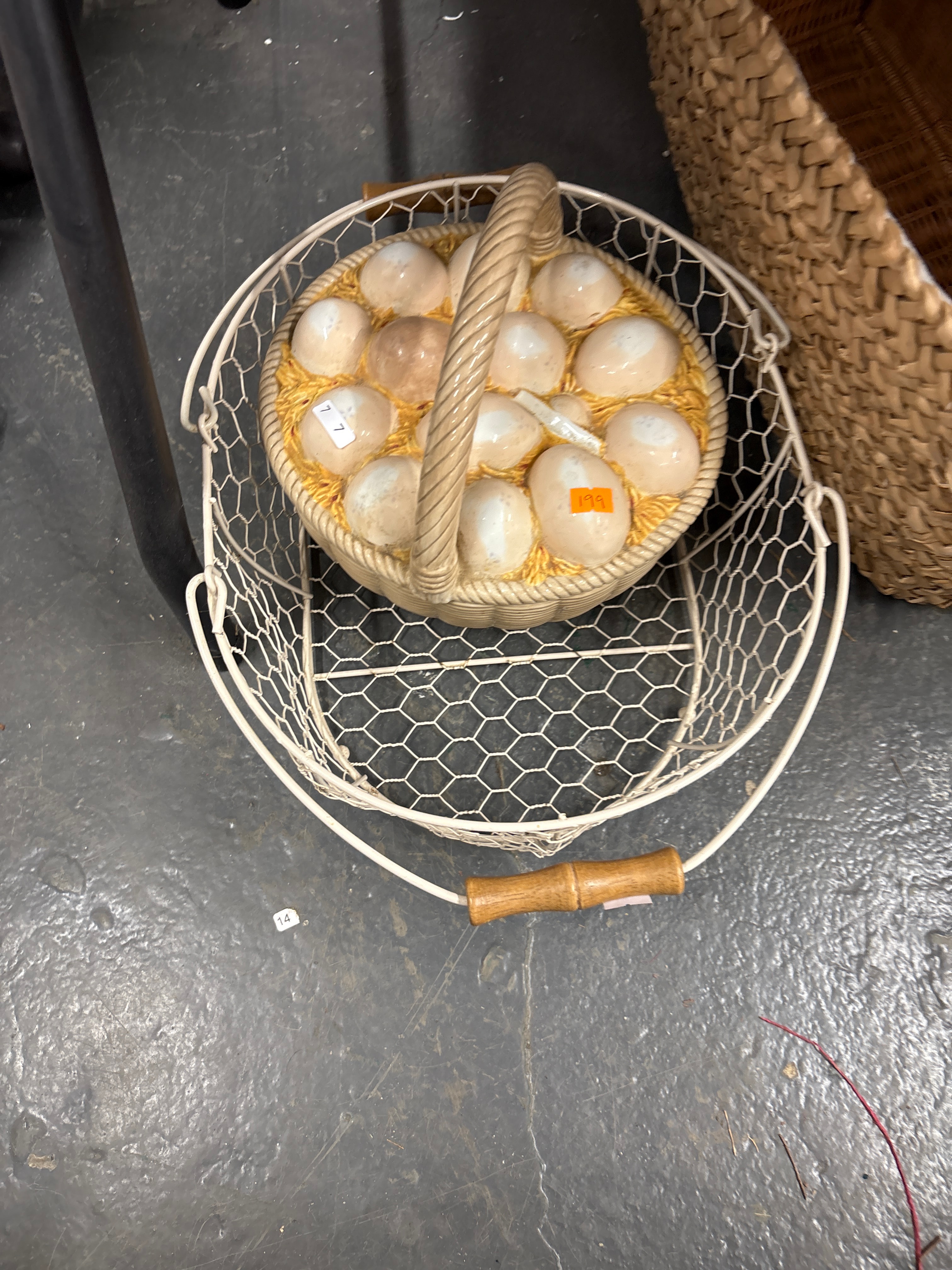 This decorative centerpiece features an outer white-painted metal wire basket, designed with a chicken wire pattern and equipped with a faux bamboo handle. Inside rests a ceramic insert, molded to resemble a woven basket, which includes a molded rope-twist handle. The ceramic basket is filled with approximately fourteen off-white ceramic eggs nestled in yellow-colored, textured ceramic “straw.” Visible markings include a white sticker with “17” on one ceramic egg, an orange sticker marked “1.99” on another egg, and a white sticker with “14” placed on the floor beneath the outer basket. The item presents in a rustic or farmhouse style.