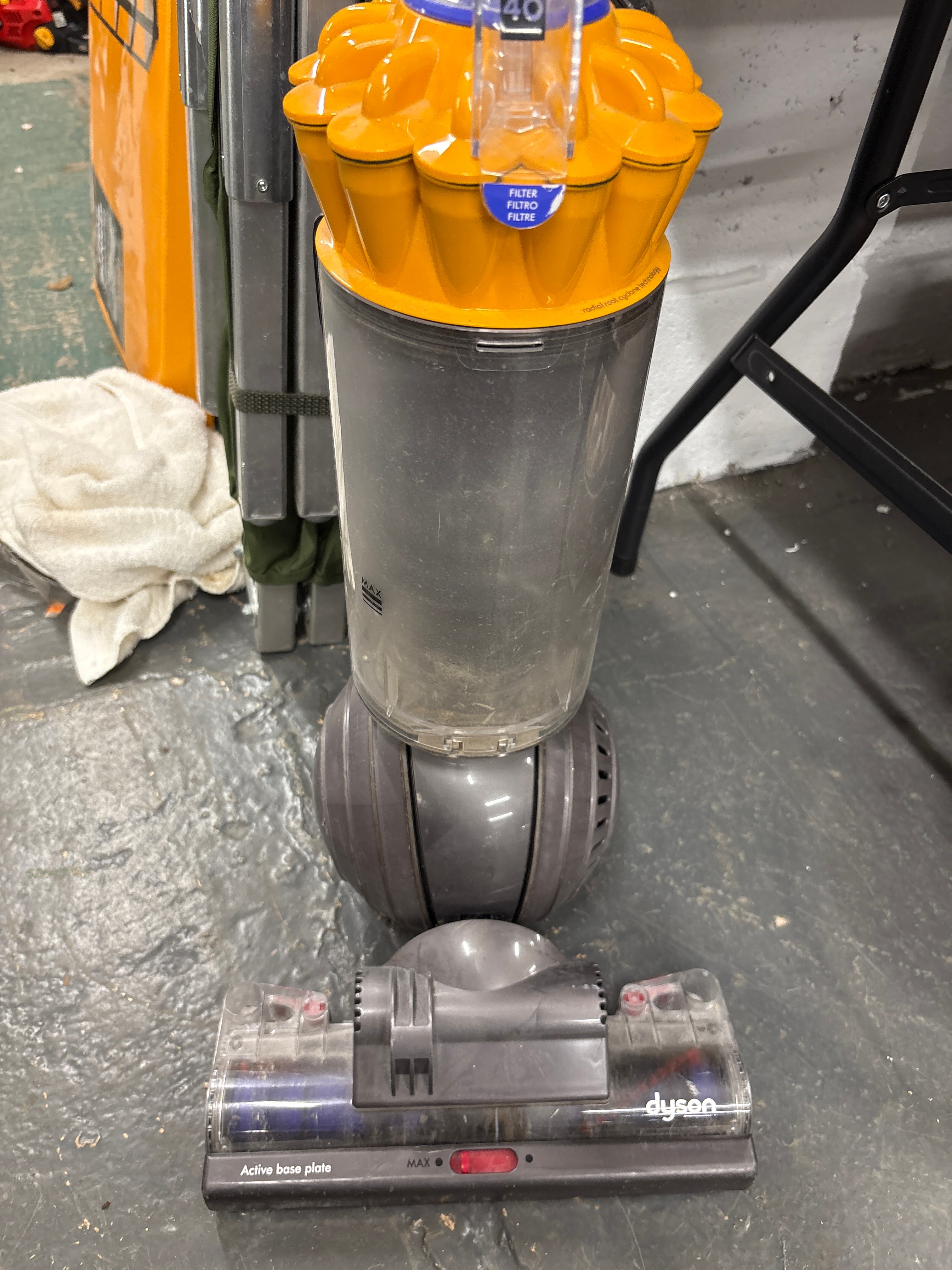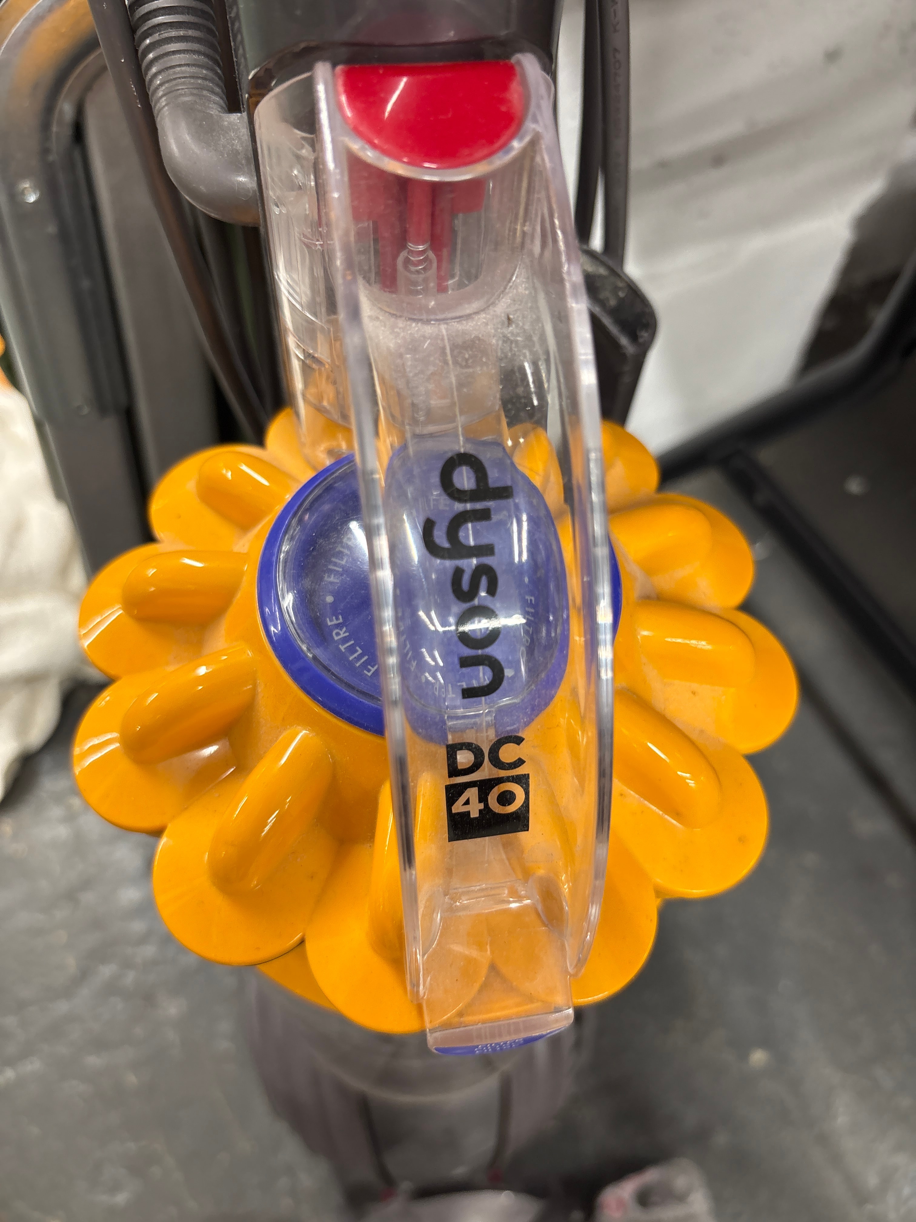 A Dyson DC 40 Ball Multi Floor Upright Bagless Vacuum Cleaner. Constructed primarily from plastic, featuring clear, grey, orange, blue, and red components. Visible markings include “Dyson,” “DC 40,” “MAX,” “FILTER,” “FILTRE,” and “Active base plate.”