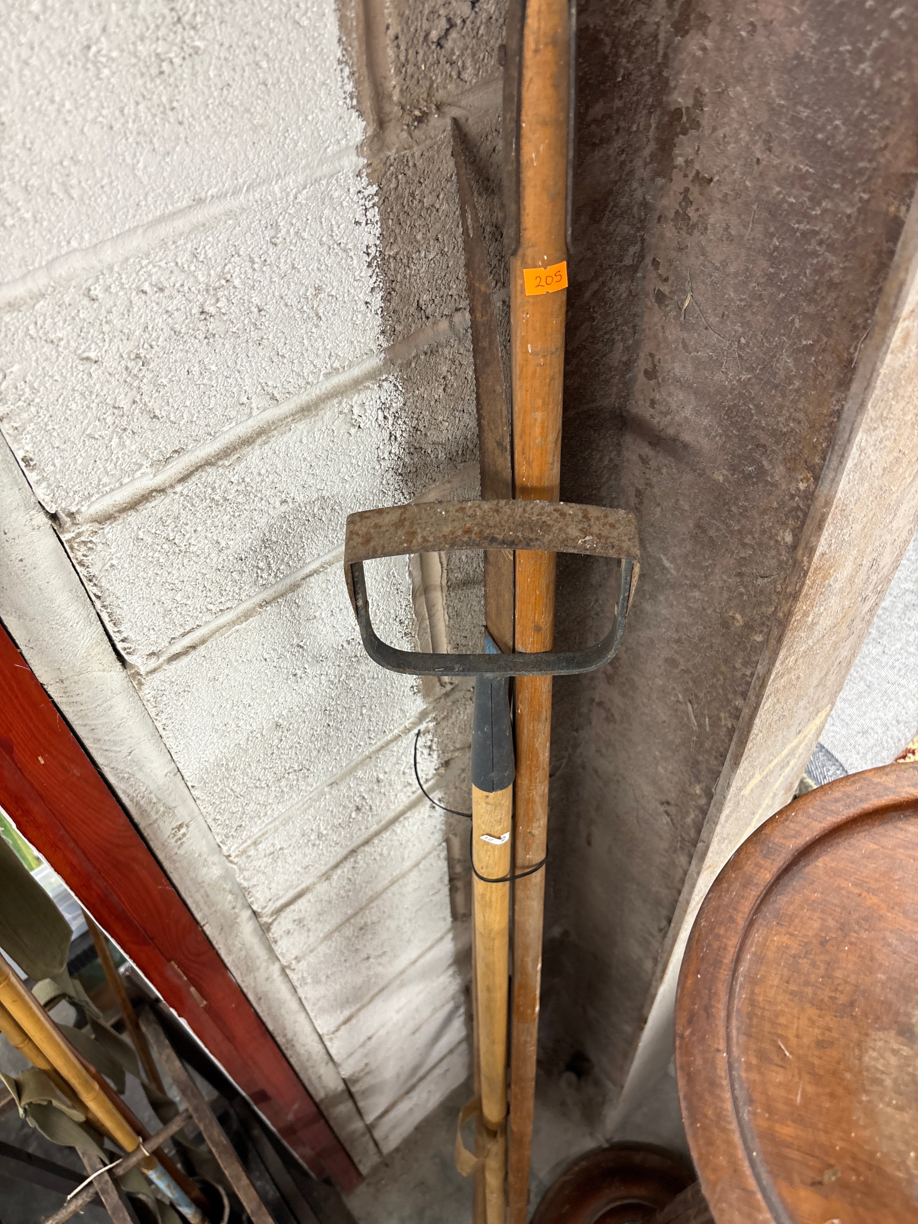 This collection comprises several long-handled garden or agricultural implements, most prominently a stirrup-style hoe. The implements feature wooden handles, with the main hoe presenting a heavily rusted iron or steel blade and a black plastic or rubber grip. An orange sticker with the number “205” is visible on one of the wooden handles, and a small, illegible white tag is tied to another.