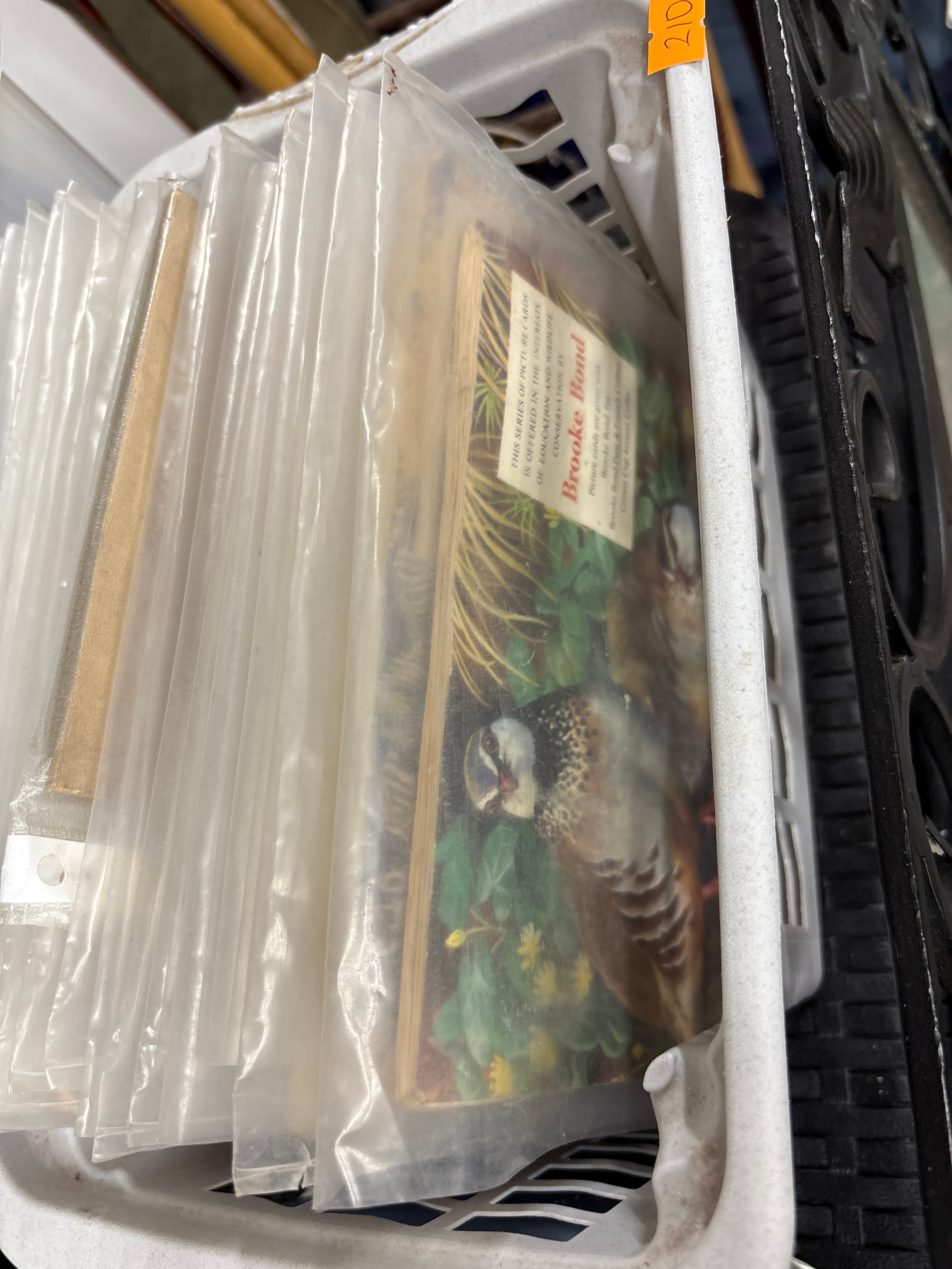 A collection of cigarette cards, primarily consisting of small-format cards, likely from the mid-20th century. Visible series titles include ‘ADVENTURERS AND EXPLORERS No. 8’ attributed to W.D. & H.O. WILLS, ‘Brooke Bond Tea’ picture cards featuring wildlife (e.g., partridges), ‘WILD FLOWERS’, and ‘COLLEEN COSTUME’. Many paper items are bundled, stacked, or individually sealed in clear plastic sleeves, indicating an attempt at organization and preservation. Some text refers to ‘A SERIES OF 50’ and educational purposes with ‘BY PERMISSION OF THE BOARD OF EDUCATION AND THE TRUSTEES’ markings. The lot also includes rumpled fabric items with printed cherry and other botanical motifs. Items are contained within two plastic storage bins and a white plastic basket.