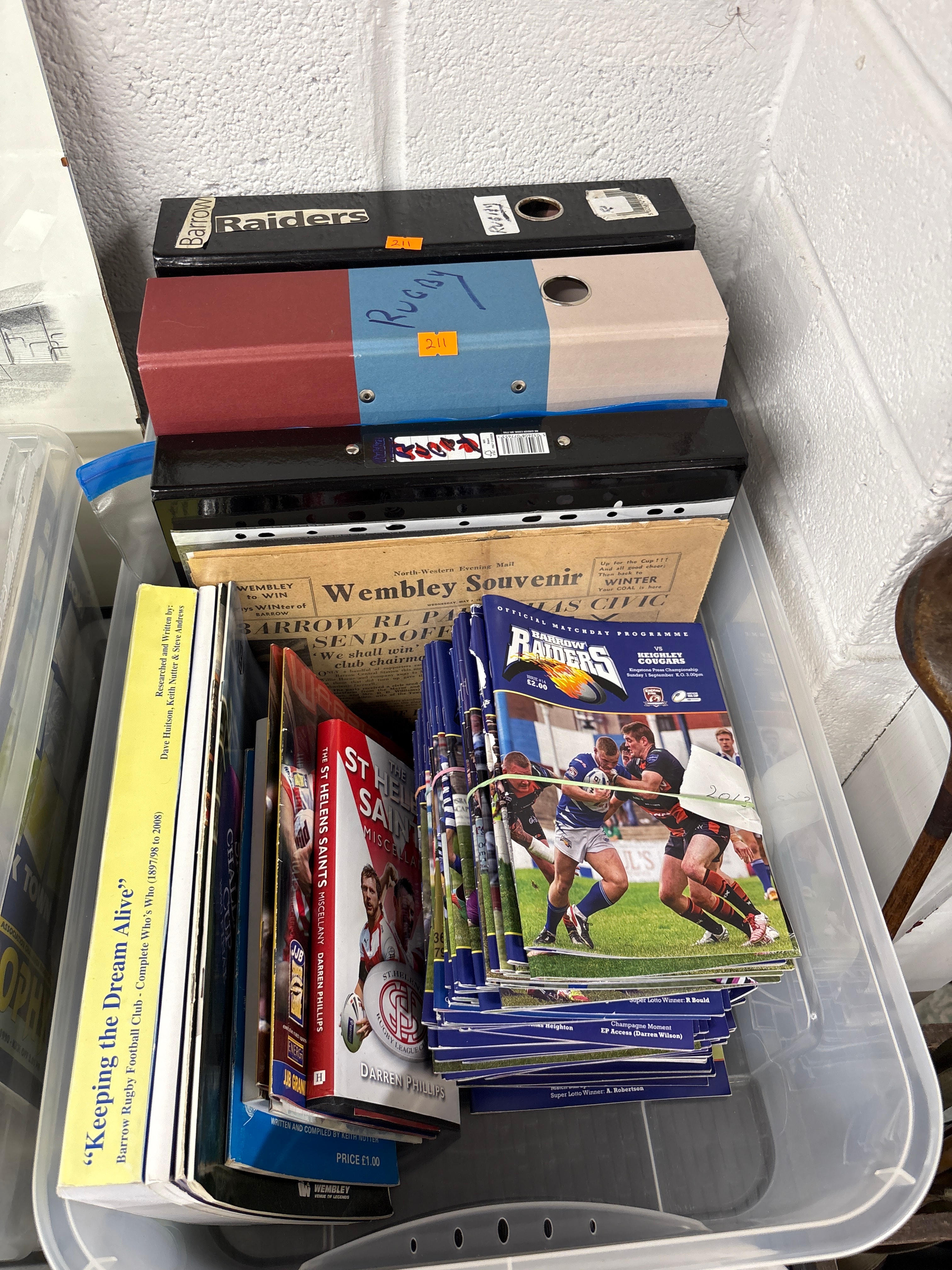This lot comprises a collection of Rugby League memorabilia and publications, presented within a clear plastic storage bin. The collection includes three lever arch files, one explicitly labeled “Barrow Raiders” and another with “Rugby” handwritten. Among the various books are “Keeping the Dream Alive: Barrow Rugby Football Club – Complete Who’s Who (1897/98 to 2008)” and “The St Helens Saints Miscellany” by Darren Phillips. A substantial portion of the lot consists of “Barrow Raiders Official Matchday Programmes,” with “Issue #14” visible, and one programme dating to “Sunday 1 September” with a handwritten “2013.” This stack of programmes is held together by elastic bands. Also present is an older “Wembley Souvenir” from the “North-Western Evening Mail,” which references “WINTER of BARROW” and “WEMBLEY to WIN.” The items are primarily composed of paper and cardboard.