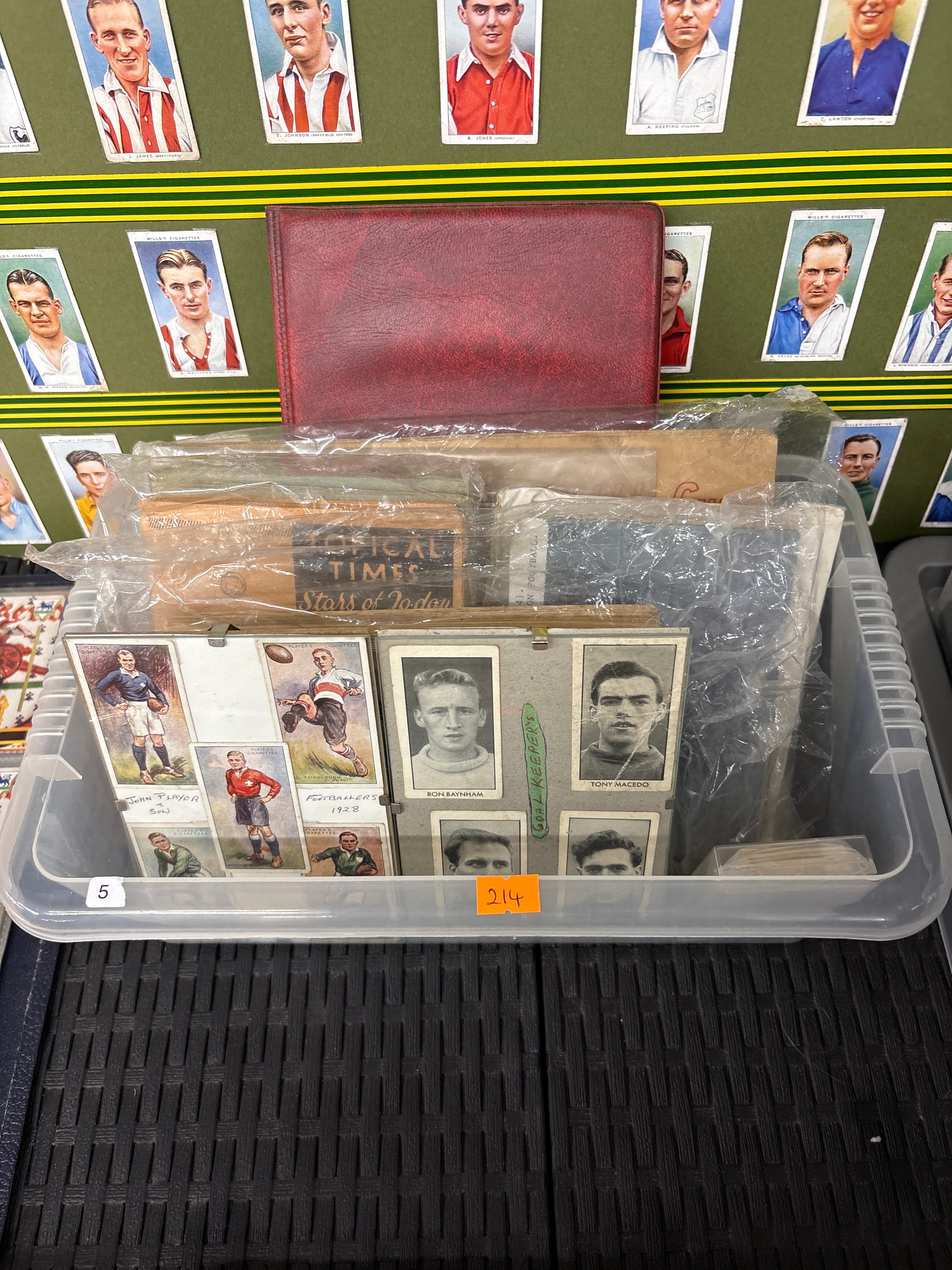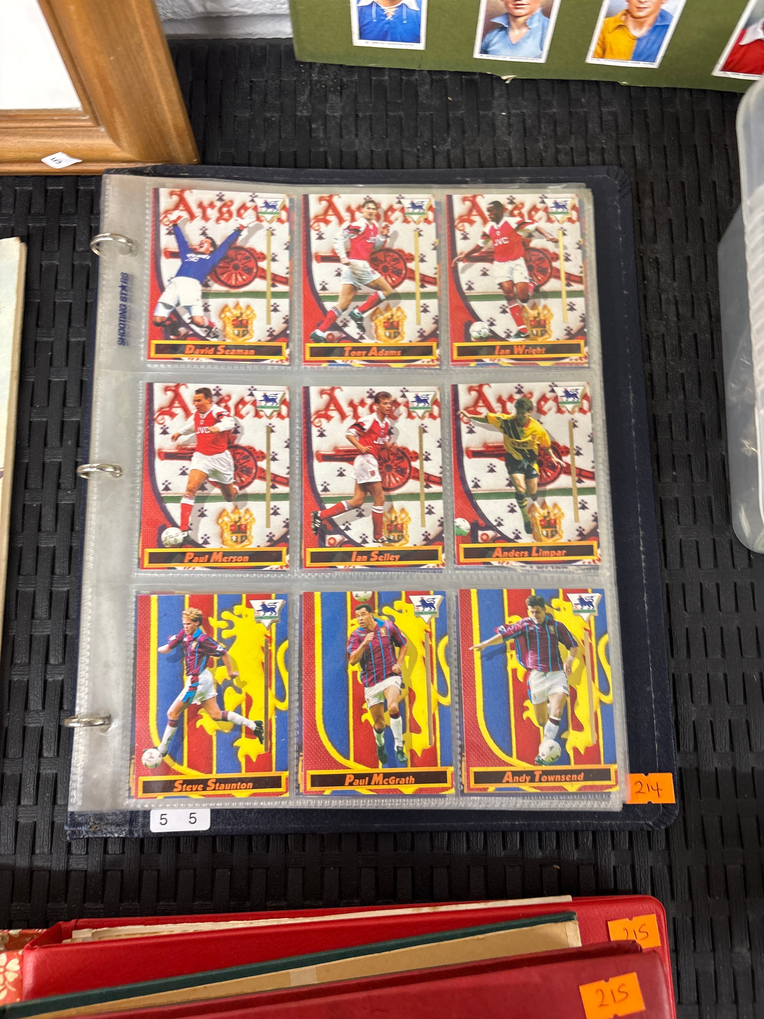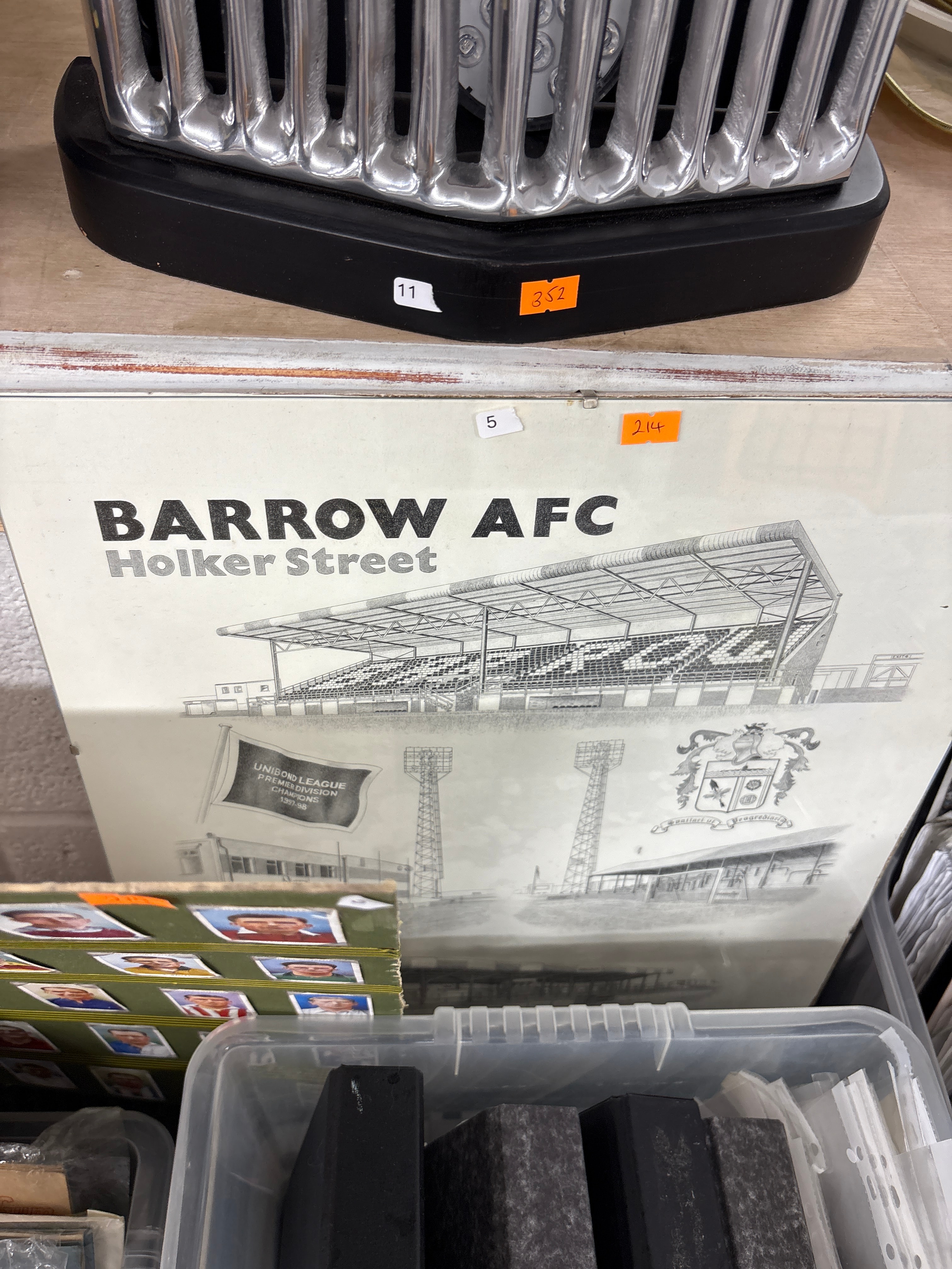 A substantial collection of football (soccer) cigarette and trading cards, ranging from vintage to more modern. The collection includes several green display boards featuring numerous individual player photographic cards, with notable names such as Bobby Charlton, George Best, and Paul Gascoigne. Also present are a reddish-brown leatherette-bound album, a clear plastic storage bin filled with additional cards and ephemera in protective plastic sleeves (some bearing text like “CLASSICAL TIMES / Stars of Today” and “FOOTBALL TIMES”), and a ring-binder album containing plastic-sleeved Premier League cards specific to Arsenal FC players, including David Seaman and Ian Wright. Further historical context is provided by a large print depicting “BARROW AFC, Holker Street” and commemorating their “UNION LEAGUE DIVISION ONE CHAMPIONS 1920-21.” Constructed primarily from paper, cardboard, plastic, and leatherette.