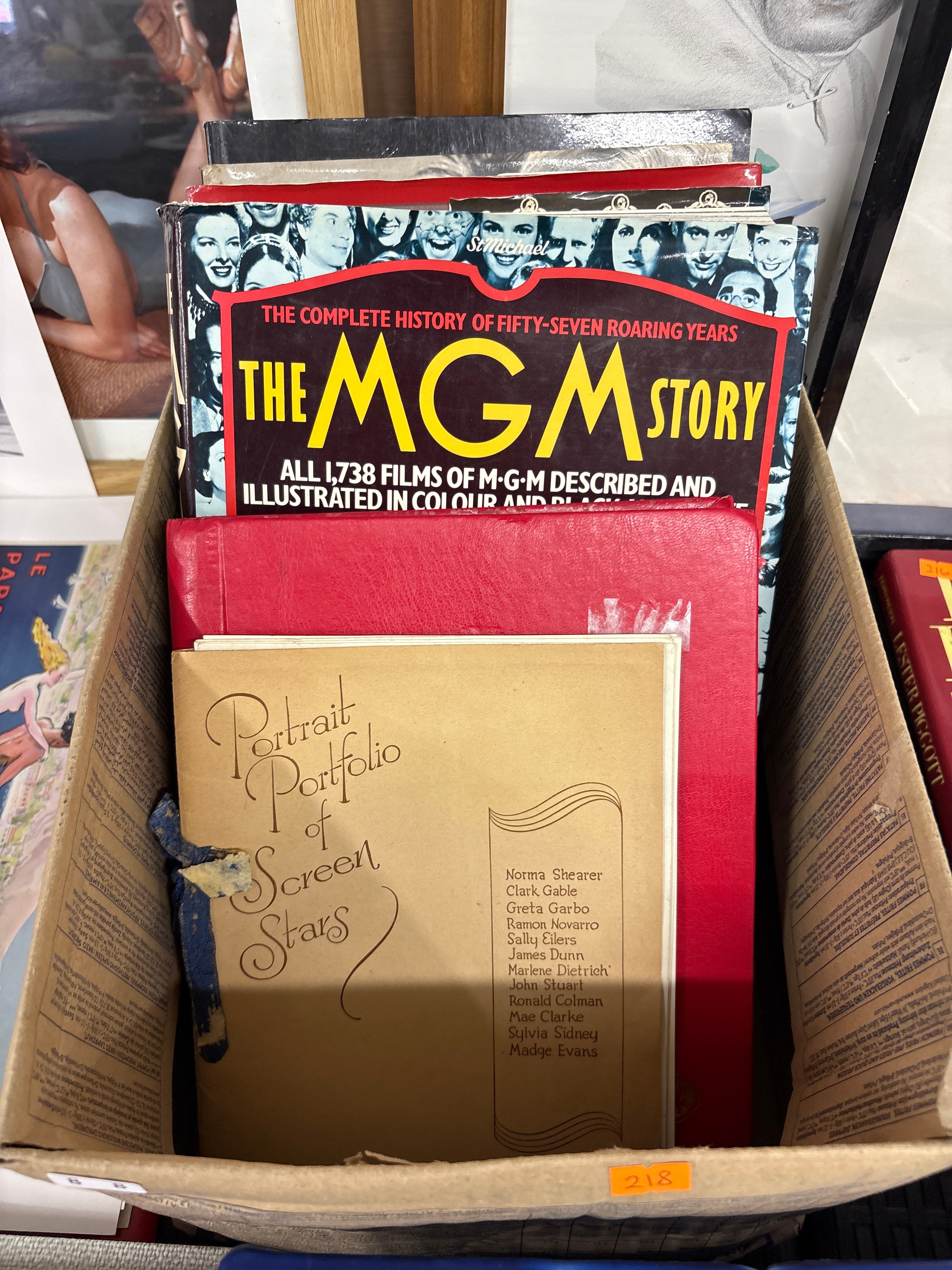 A collection of vintage film and entertainment publications, primarily featuring ‘The MGM Story’ by John Douglas Eames. This large format book is titled ‘THE COMPLETE HISTORY OF FIFTY-SEVEN ROARING YEARS,’ detailing ‘ALL 1,738 FILMS OF M-G-M DESCRIBED AND ILLUSTRATED IN COLOUR AND BLACK-AND-WHITE,’ with ‘St Michael’ visible on its spine, dating from the mid to late 20th century. Also included is a tan paper ‘Portrait Portfolio of Screen Stars,’ featuring a partially visible blue fabric tie, and listing classic Hollywood figures such as Norma Shearer, Clark Gable, Greta Garbo, Ramon Novarro, Sally Eilers, James Dunn, Marlene Dietrich, John Stuart, Ronald Colman, Mae Clarke, Sylvia Sidney, and Madge Evans, placing its style and period firmly within the Golden Age of Hollywood. A plain red book or folio is also present, along with the spine of a book titled ‘LESTER PIGGOTT.’ The items are housed within a generic cardboard box, originally for frozen food products.