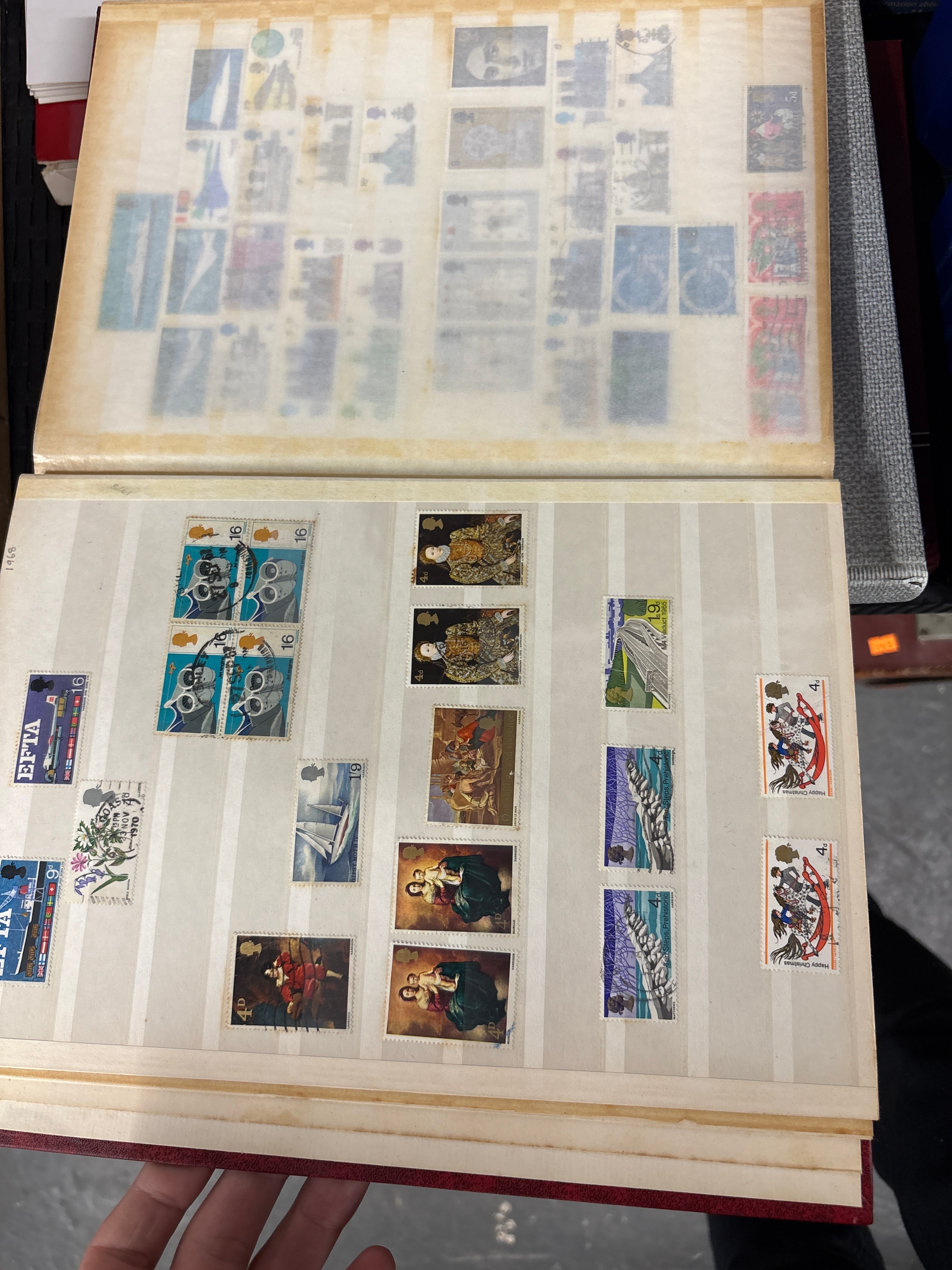 A collection of postage stamps presented in two philatelic albums or stock books. The first album contains a mix of international and commemorative stamps, featuring designs such as “EFYA,” royalty portraits, religious scenes, and ships, primarily spanning the mid-to-late 20th century. The second is a spiral-bound album predominantly displaying Great Britain definitive stamps, with a focus on the reign of Queen Elizabeth II, including legible dates “6.2.1952” (accession) and “1953” (coronation year). This album also includes earlier issues, notably from the reign of King Edward VIII (1936) and a 1948 stamp. Many stamps are marked “POSTAGE REVENUE” or “POSTAGE PAID” with various pence denominations. The reverse of the second album is marked “COLLECTA PHILATELIC PUBLISHERS LTD LONDON PRINTED IN GREAT BRITAIN.” The stamps are mounted on paper.