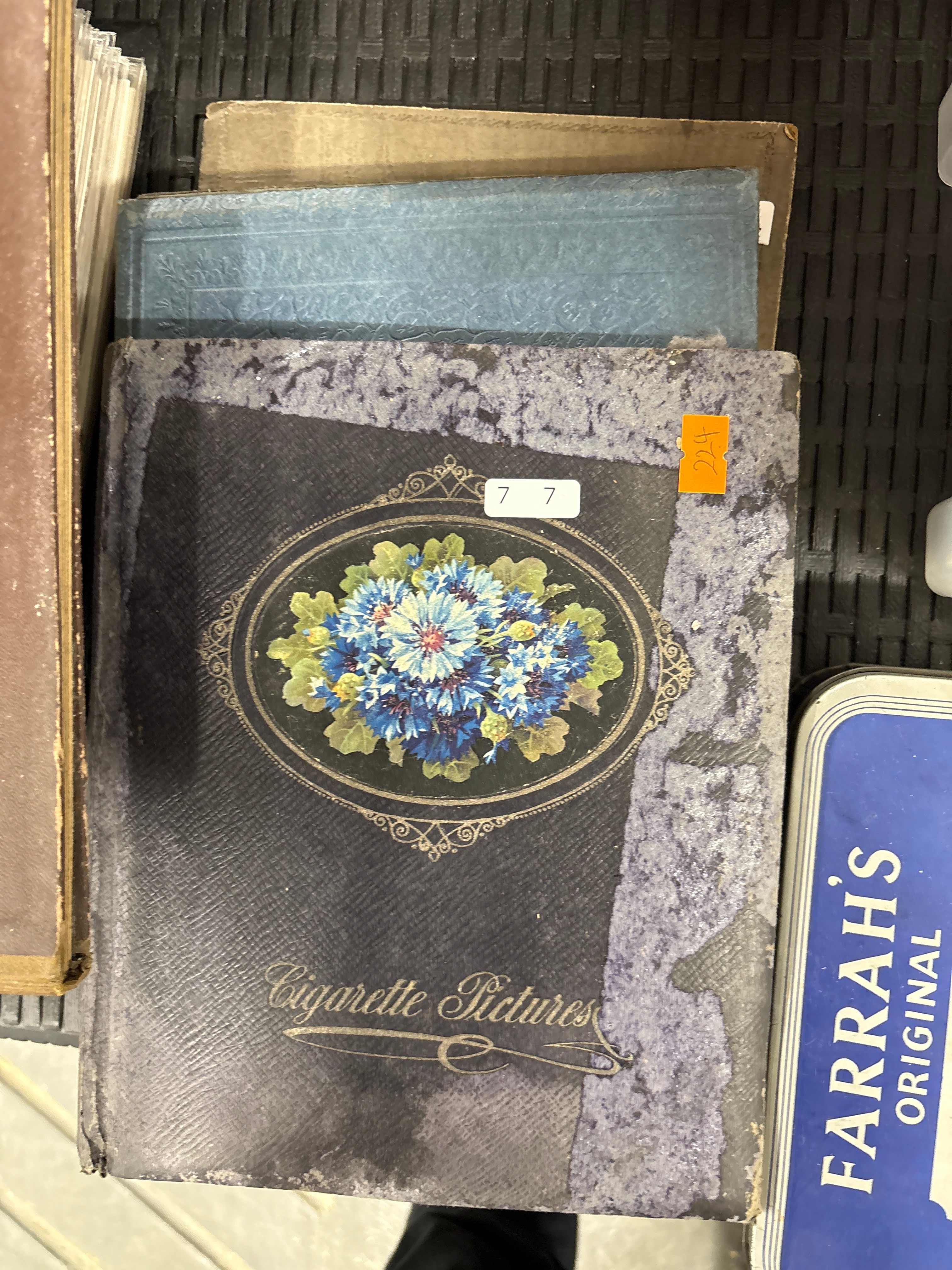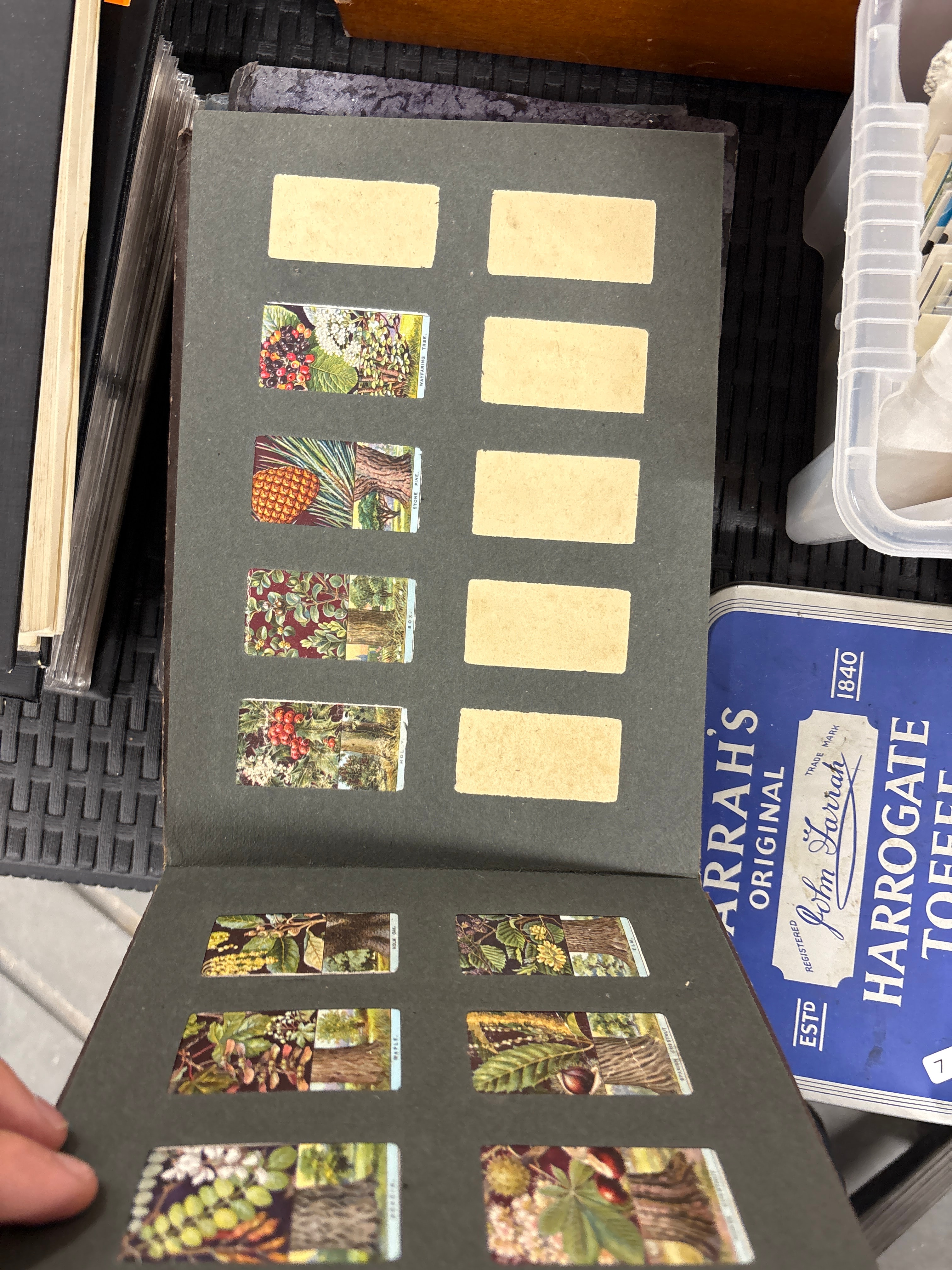 A vintage Wills Cigarette Card Album, likely dating from the early to mid-20th century. The album features a dark, textured cover, possibly paperboard or faux leather, adorned with an oval floral design depicting blue and white flowers, centered above the stylized title “Cigarette Pictures.” An orange tag marked “7 7” is affixed to the top right of the cover. Internally, the album contains dark grey pages with pre-cut slots, many of which are currently empty. The populated slots hold small, rectangular cards illustrating various botanical subjects, including fruits such as pineapple and berries, leaves, and nuts like chestnuts; some illegible descriptive text is visible on these cards.