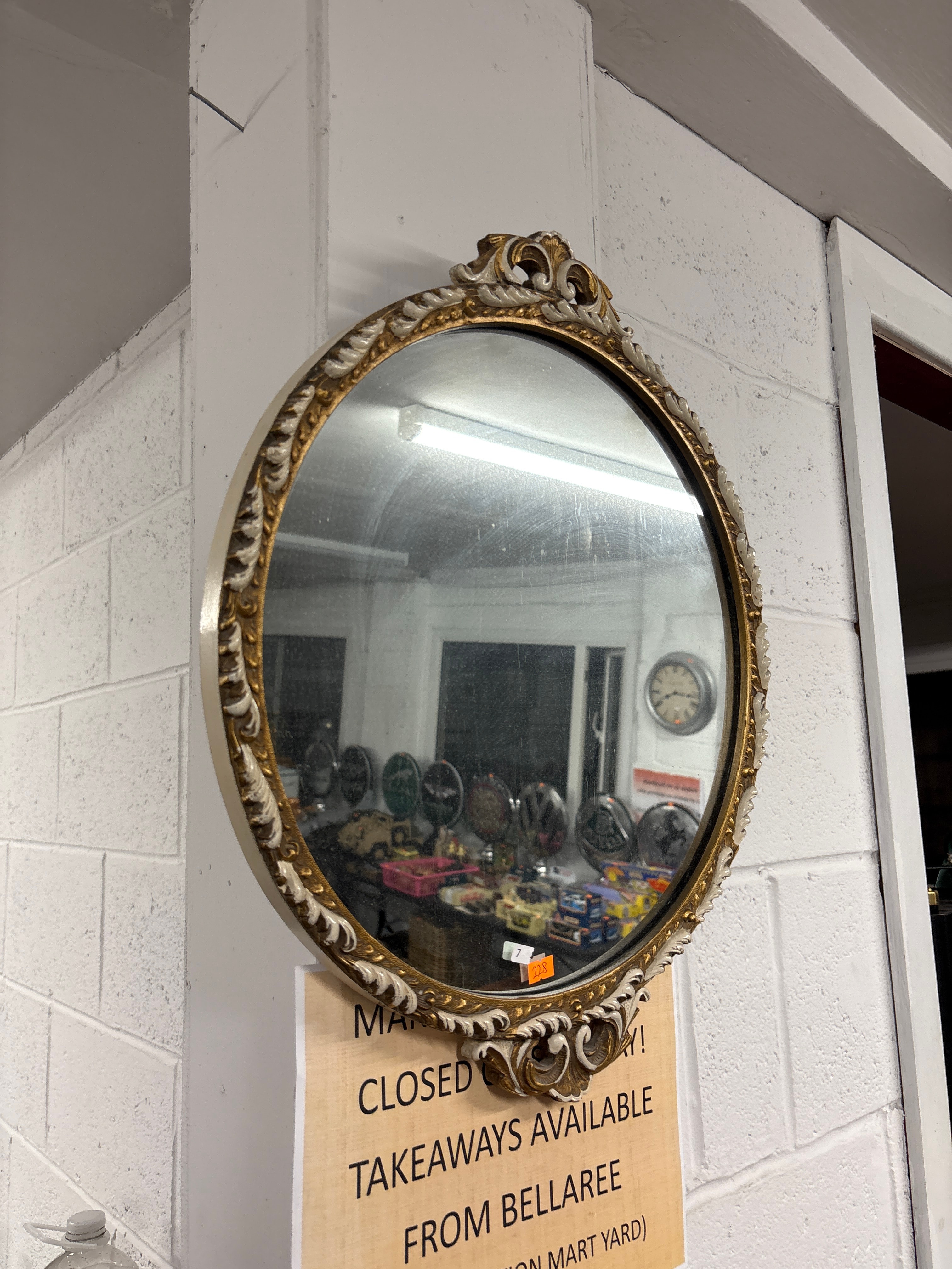 A round wall mirror featuring an ornate frame, constructed from gilt wood or composite material. The frame exhibits a two-tone finish with distressed gold leaf accents on scrolling foliage and an off-white or cream paint on the raised decorative elements.