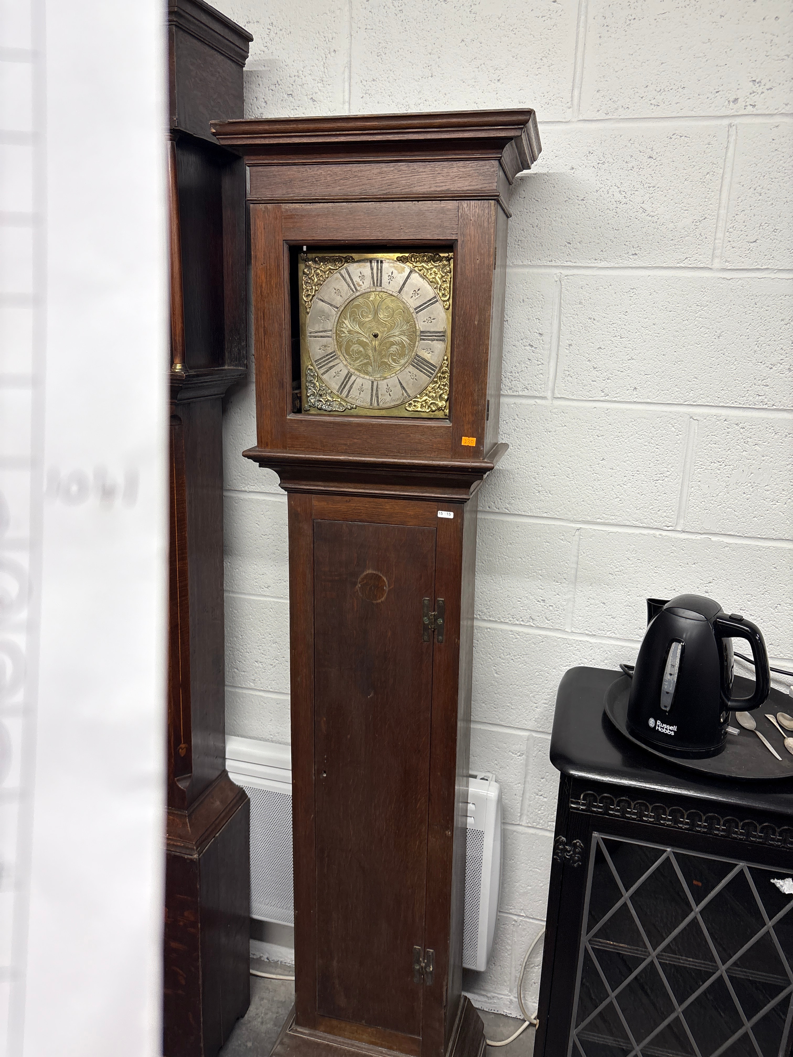 An 18th Century Oak Eight-Day Longcase Clock, signed W. Coles Charbury. The traditional longcase clock is crafted from dark-stained hardwood, appearing to be oak. It features a square brass dial with a finely engraved central foliate boss, a silvered chapter ring displaying Roman numerals for hours and Arabic numerals for minutes, and ornate florally-engraved brass spandrels. The dial is clearly signed “W. Coles Charbury” below the XII. The lower section of the case has a plain wooden door with two external metal hinges and a subtle circular impression.