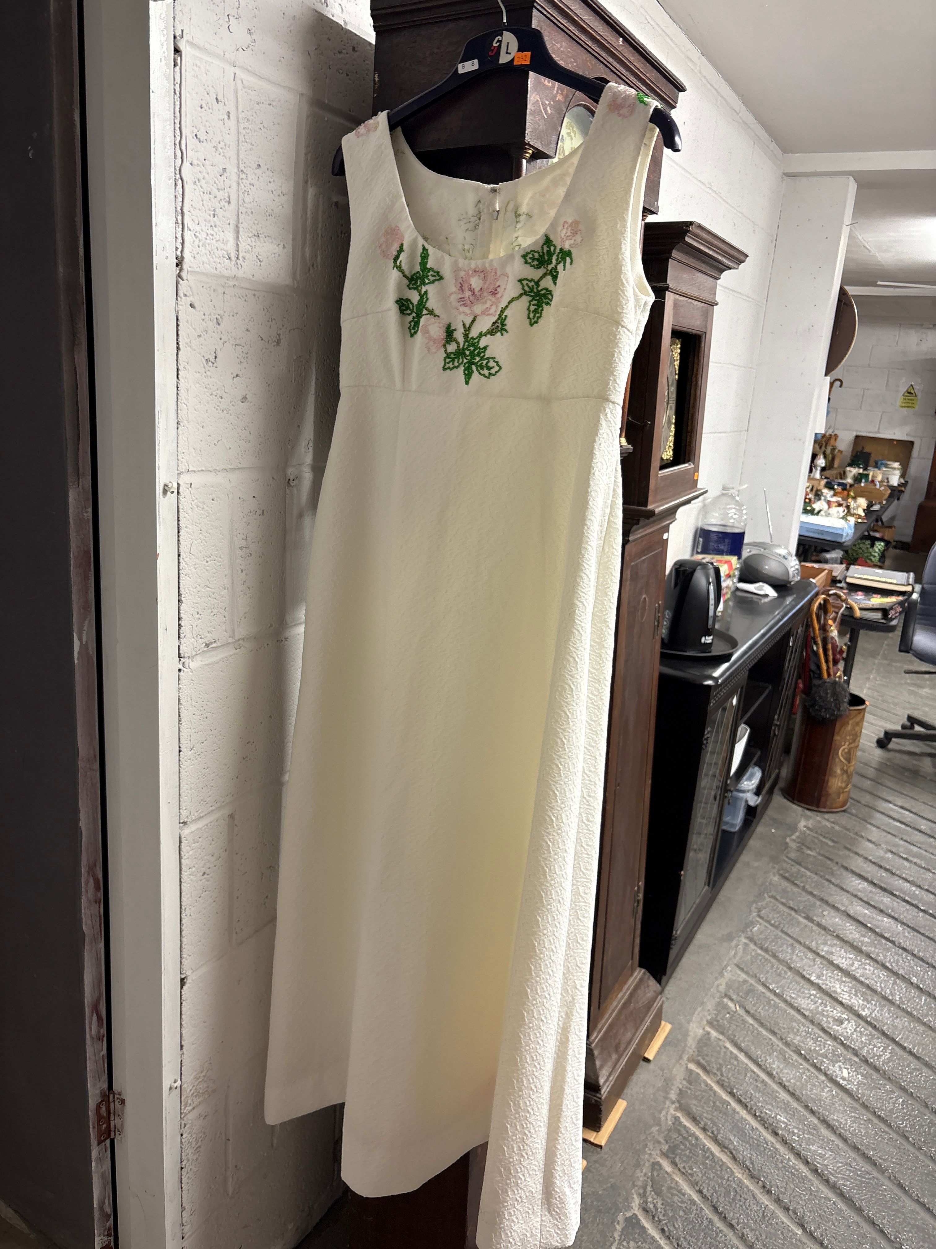 A cream or ivory-colored sleeveless maxi dress or evening gown, dating to the mid-20th century. The garment features a textured fabric throughout, possibly a jacquard or raised weave, and is embellished with an intricate floral embroidery pattern of pink roses and green leaves across the bodice and empire waistline. It is designed with a square or wide scoop neckline and a zipper closure at the back. The dress is marked with a size ‘8 8’.