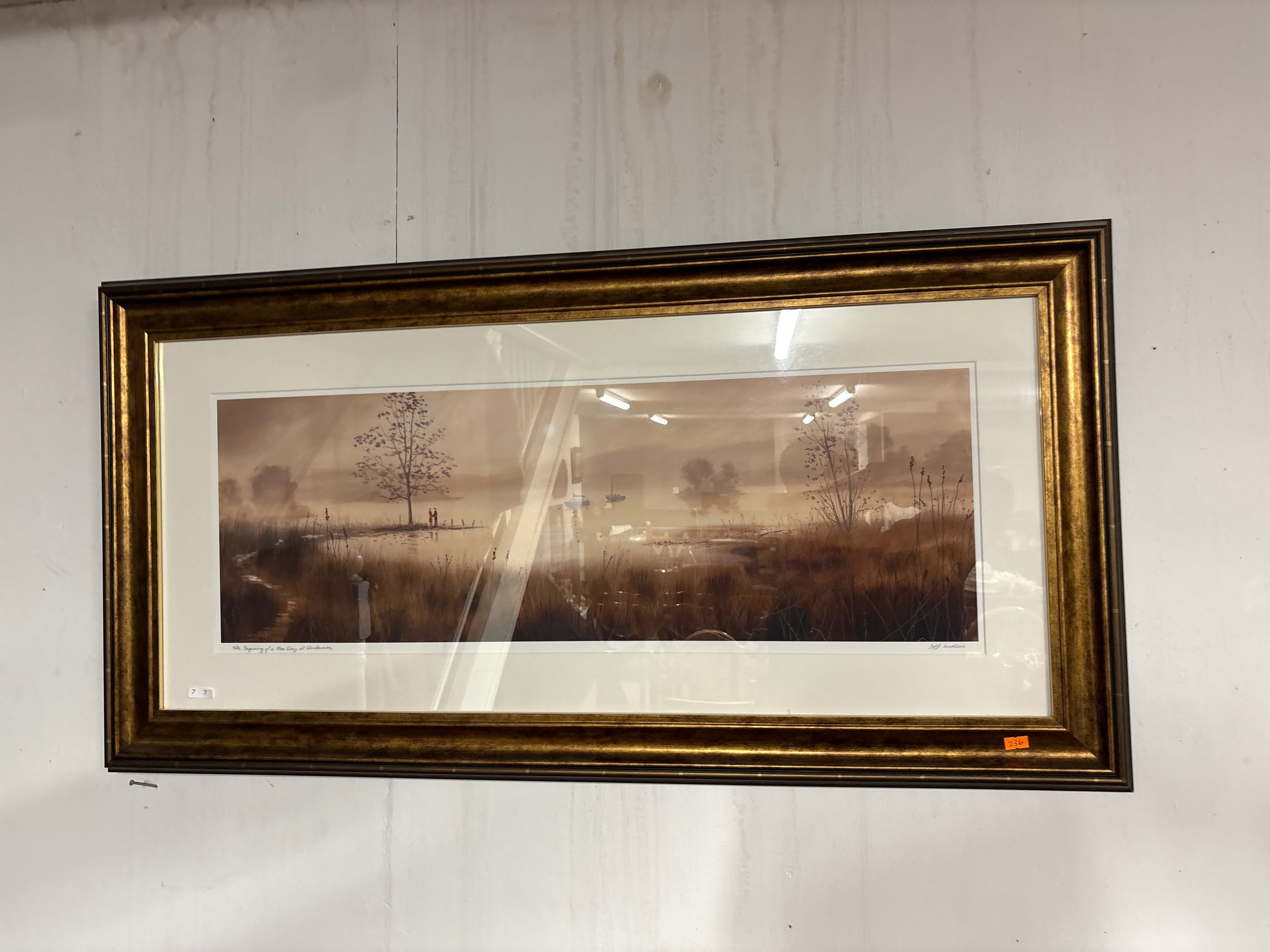 A framed panoramic landscape print, titled ‘The Beginning of a New Day, at Bled’ on the lower left and signed ‘Jeff Sounders’ on the lower right. The print features a serene, sepia-toned waterside scene with a bare tree, distant figures, and tall reeds, evoking a tranquil morning or evening atmosphere. It is presented under glass with a wide, off-white mat and housed in an ornate, dark gold-toned frame with a fluted profile, likely made of wood or composite material. Further markings include ‘7 7’ handwritten on the mat in the lower left corner and an orange sticker with the number ‘236’ affixed to the lower right corner of the frame.
