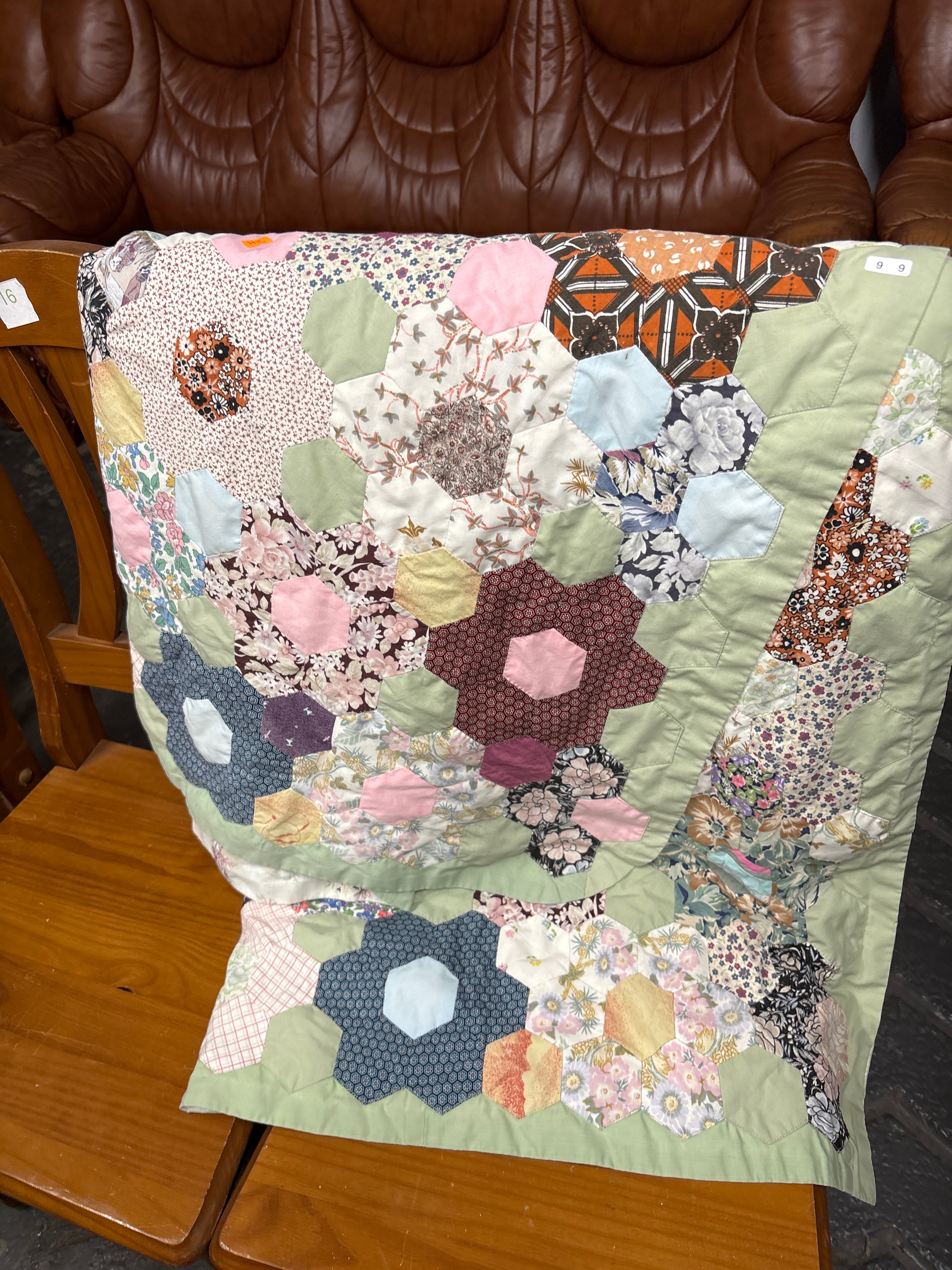 A handcrafted patchwork quilt executed in the traditional ‘Grandmother’s Flower Garden’ style. The quilt is composed of numerous hexagonal fabric pieces, meticulously arranged to form distinct floral patterns against a light green background. The textile incorporates a wide assortment of printed cotton fabrics, featuring various floral motifs, geometric designs, and solid colors, suggesting a mid-to-late 20th century or contemporary production. Visible markings include two white paper tags, one bearing ’16’ on the upper left and another with ‘9 9’ on the upper right.