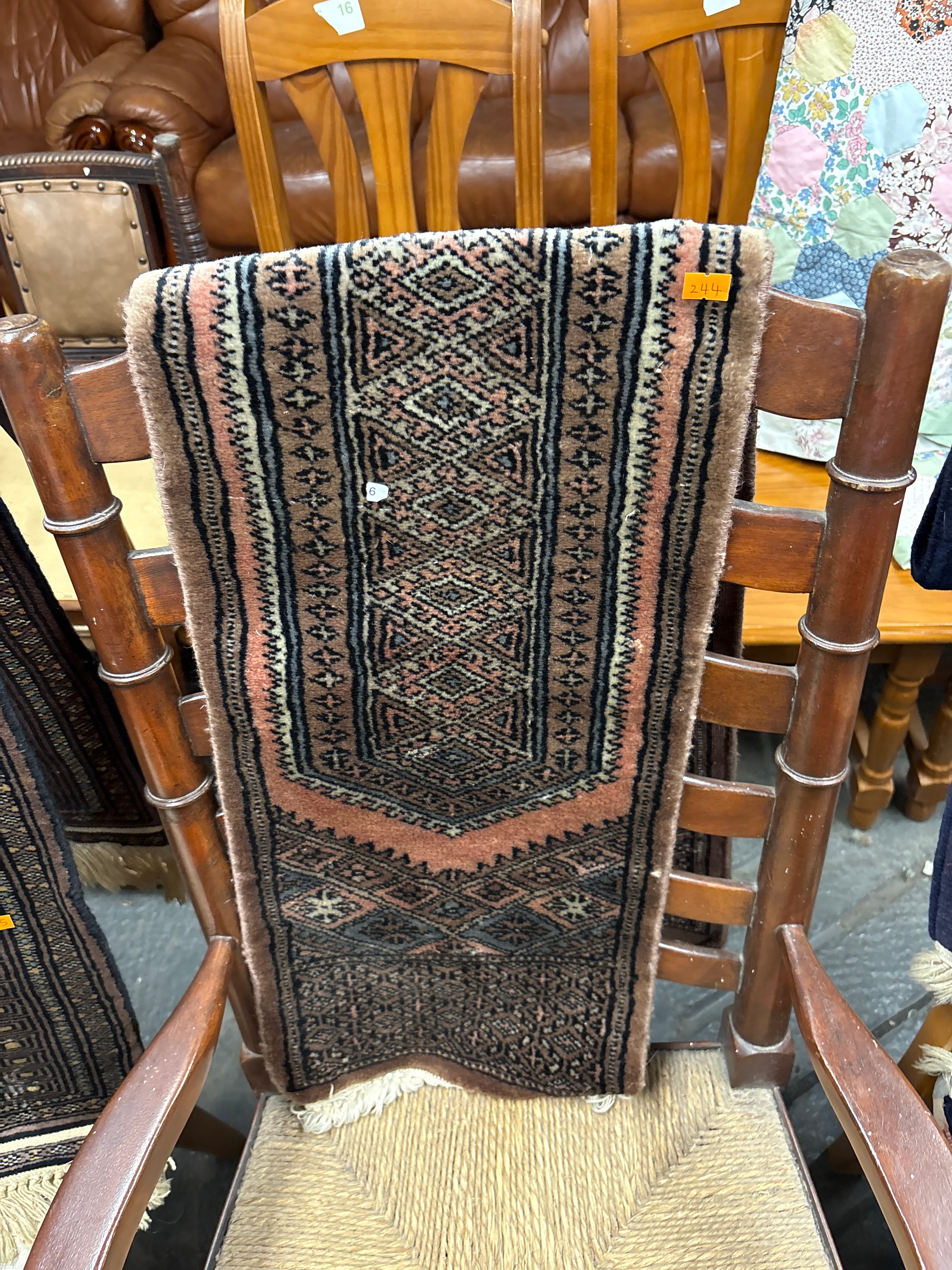 A hand-knotted wool Bokhara rug featuring a traditional geometric design dominated by a central column of stepped diamond motifs, flanked by repeating patterns and striped borders. The color palette consists primarily of muted brown, black, grey, and faded pink/peach tones. A yellow inventory or price sticker marked “244” is visible on the upper right portion, and a small white sticker with the number “6” is attached near the center left.