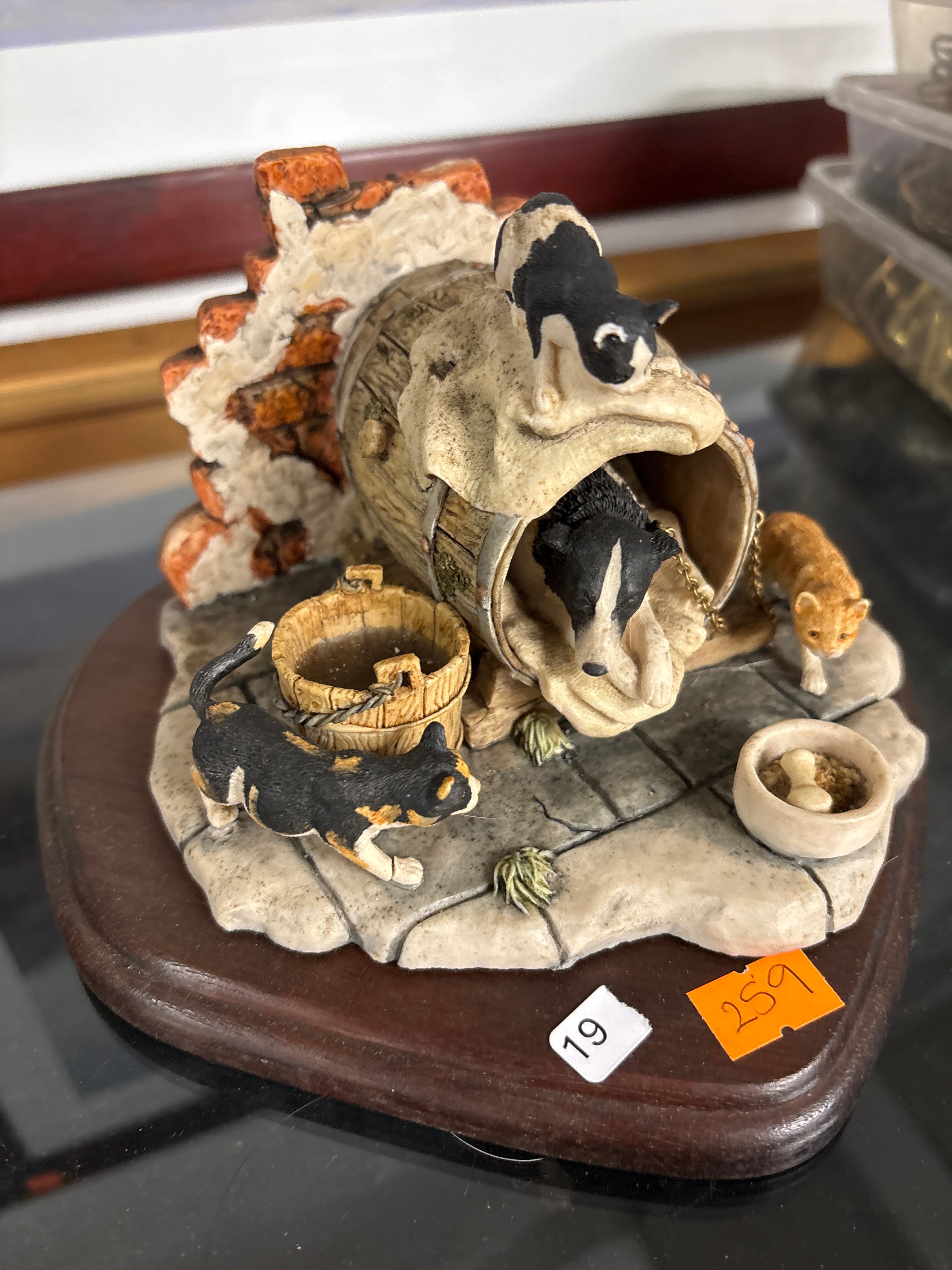 A Border Fine Arts figurine titled ‘Let Sleeping Dogs Lie’, designed by D. Walton. This hand-painted diorama-style figurine is crafted from resin or a similar composite material, depicting a whimsical outdoor scene with several felines. The central composition features a partially broken wooden barrel emerging from a crumbling brick wall, housing two black and white kittens, one peering out and another perched atop. A calico kitten stands beside a small wooden bucket, while an orange tabby kitten approaches a pet food bowl containing a bone, all resting on a cobblestone-patterned base with small green tufts. The entire scene is mounted on a dark brown, polished wooden plinth. Visible markings include a white tag with the number ’19’ and an orange tag with ‘259’ adhered to the wooden base.
