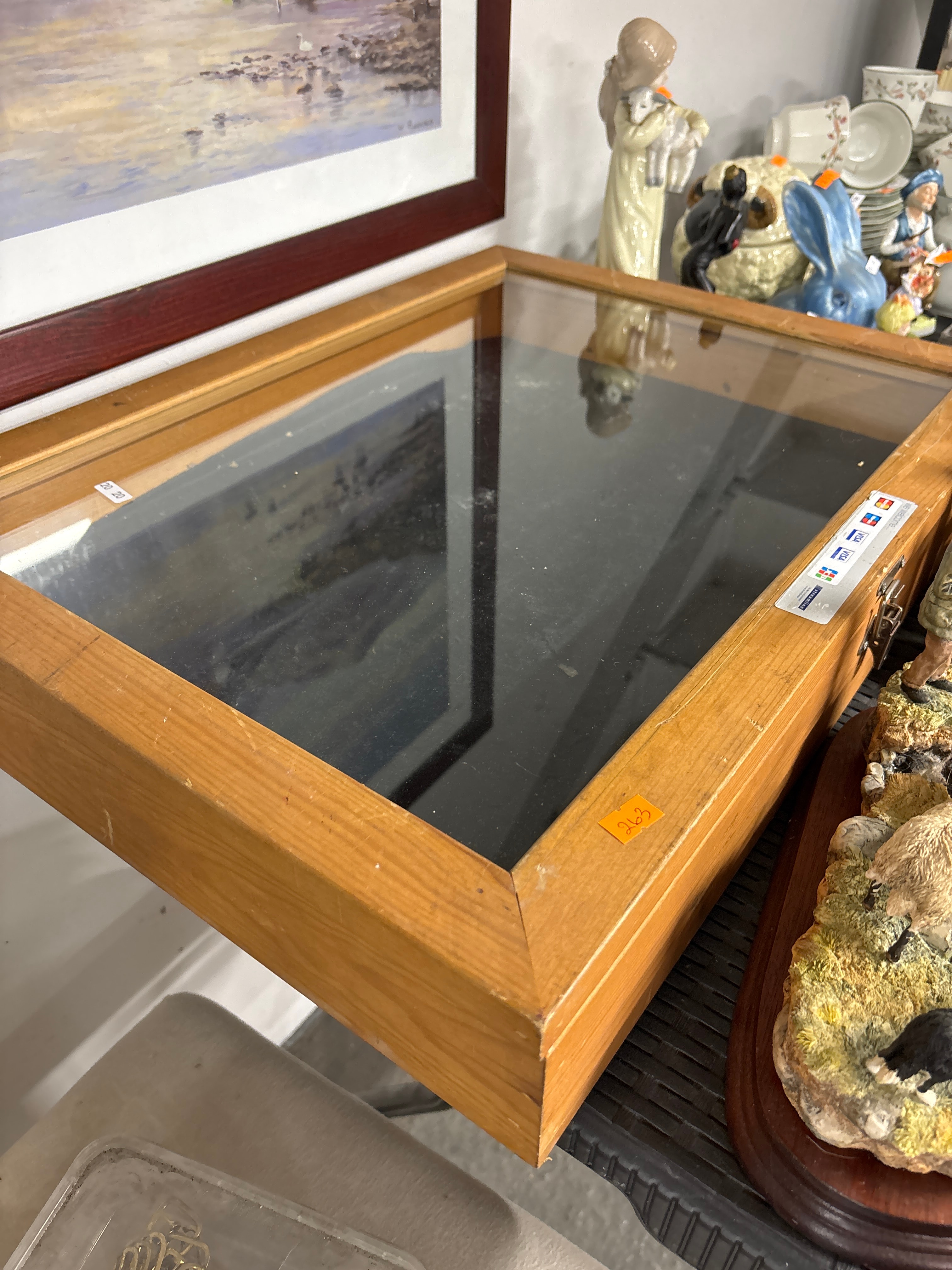 A rectangular display case or shadow box, primarily constructed from light-toned wood, likely pine, with a clear glass top secured by visible metal hinges. The design is simple and utilitarian, suggesting a modern aesthetic, possibly mid-20th century or later. A small white sticker reading ’20 20′ is present on the glass, an orange sticker with ‘283’ is affixed to the side frame, and a larger ‘WE WELCOME’ payment methods sticker displaying MasterCard, Visa, and Streamline logos is located on the right-hand side.