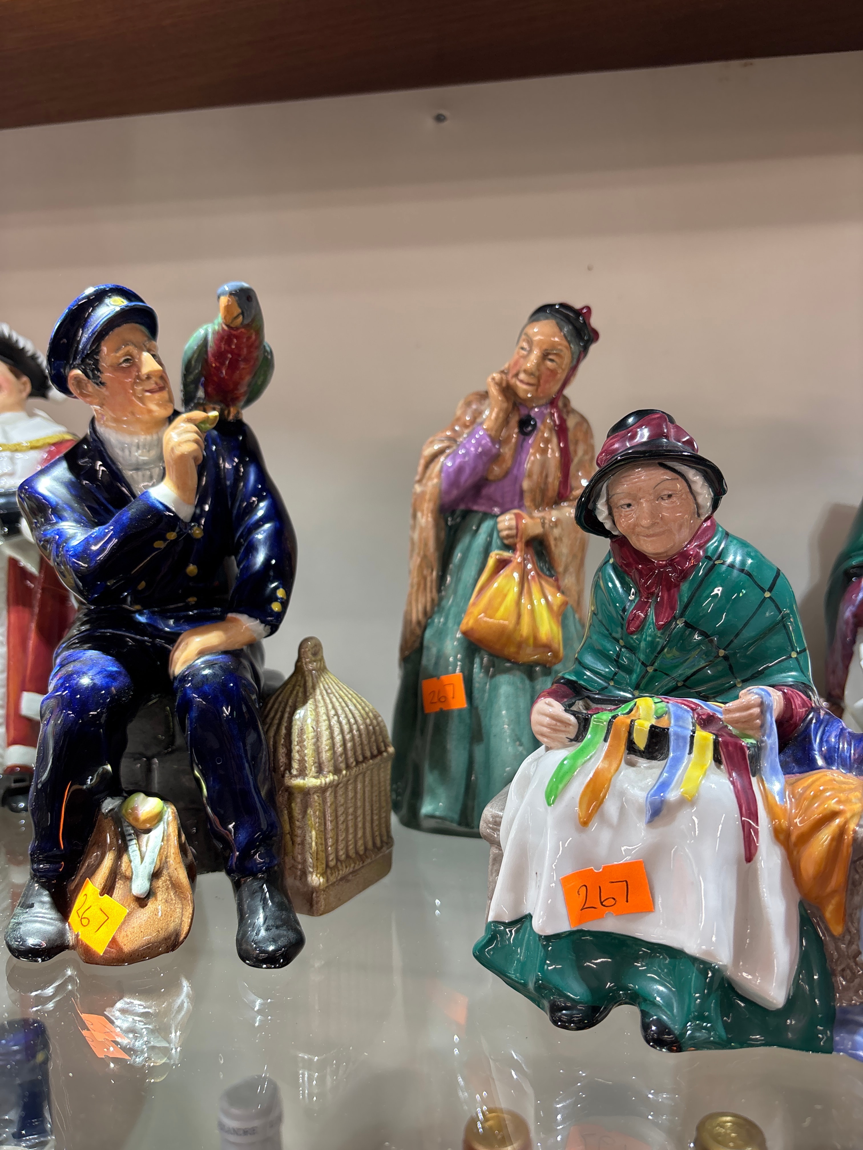 A group of three glazed ceramic character figurines, comprising a Royal Doulton ‘Bridget’ HN 2070 figure and two other character figures. Each figure is rendered in a traditional or folk-art style with hand-painted details. The Royal Doulton ‘Bridget’ figure depicts a standing woman in a brown shawl, purple blouse, and green skirt, holding a yellow bag. The leftmost figure depicts a seated man in a dark blue uniform with a parrot on his arm, beside a small birdcage. The rightmost figure shows a seated woman wearing a green plaid-patterned garment and hat, holding colorful ribbons. Orange stickers bearing the number ‘267’ are visible on the man’s bundle, the standing woman’s skirt, and the seated woman’s lap. A partial ‘4’ sticker is also visible in reflection.
