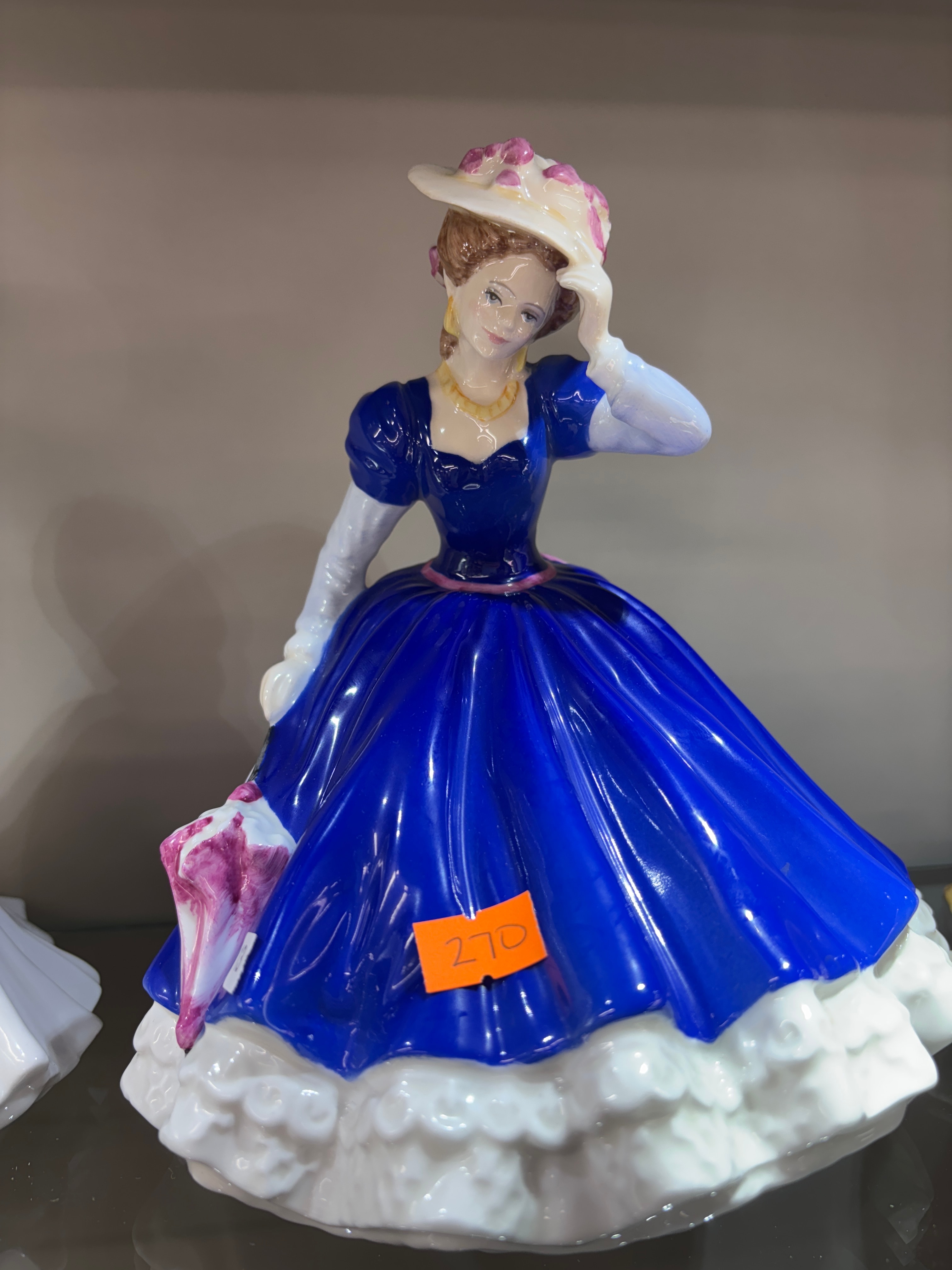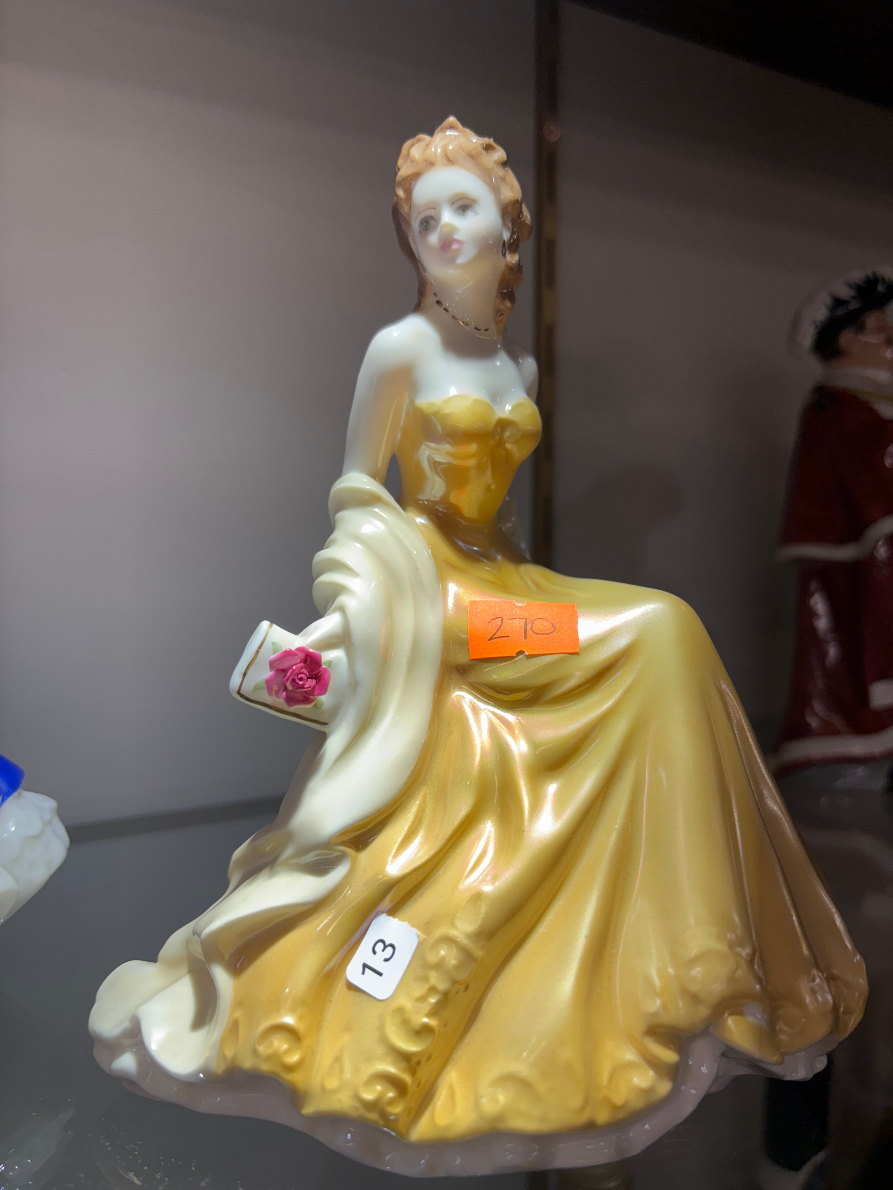 A Royal Worcester ‘Golden Moments Anniversary’ figurine, depicting a seated woman in an elegant, flowing golden-yellow gown with an off-white shawl draped over her shoulders. Her hair is styled in an upswept fashion, and she holds a small purse adorned with a pink rose in her left hand. The figurine features a smooth, glossy finish typical of decorative lady figures. A Royal Doulton ‘Mary’ HN3375 Figure of the Year 1992 figurine, depicting a woman in a voluminous royal blue gown with a white ruffled underskirt, white gloves, a hat with pink accents, a gold necklace, and holding a pink parasol.