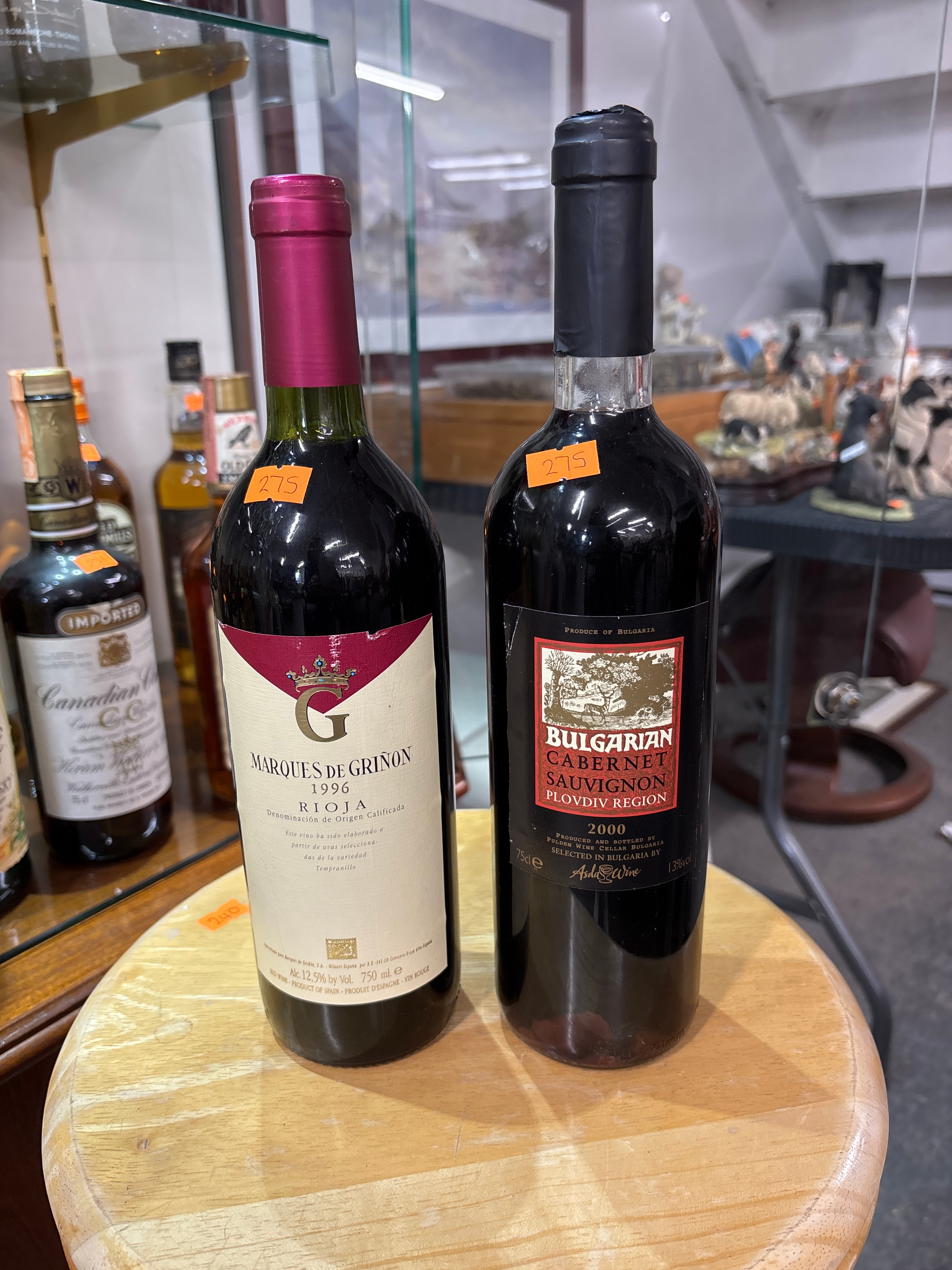 A pair of red wines, comprising one bottle of Marques de Griñon Rioja and one bottle of Bulgarian Cabernet Sauvignon.